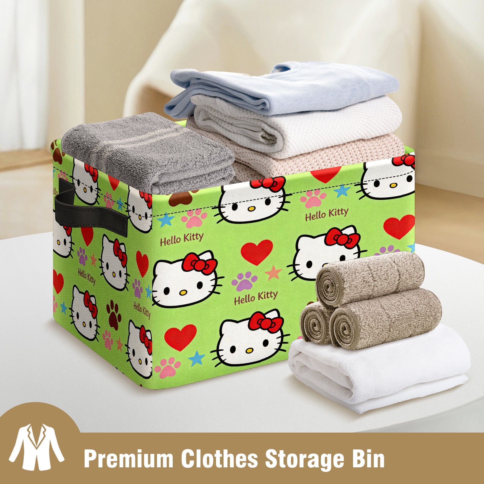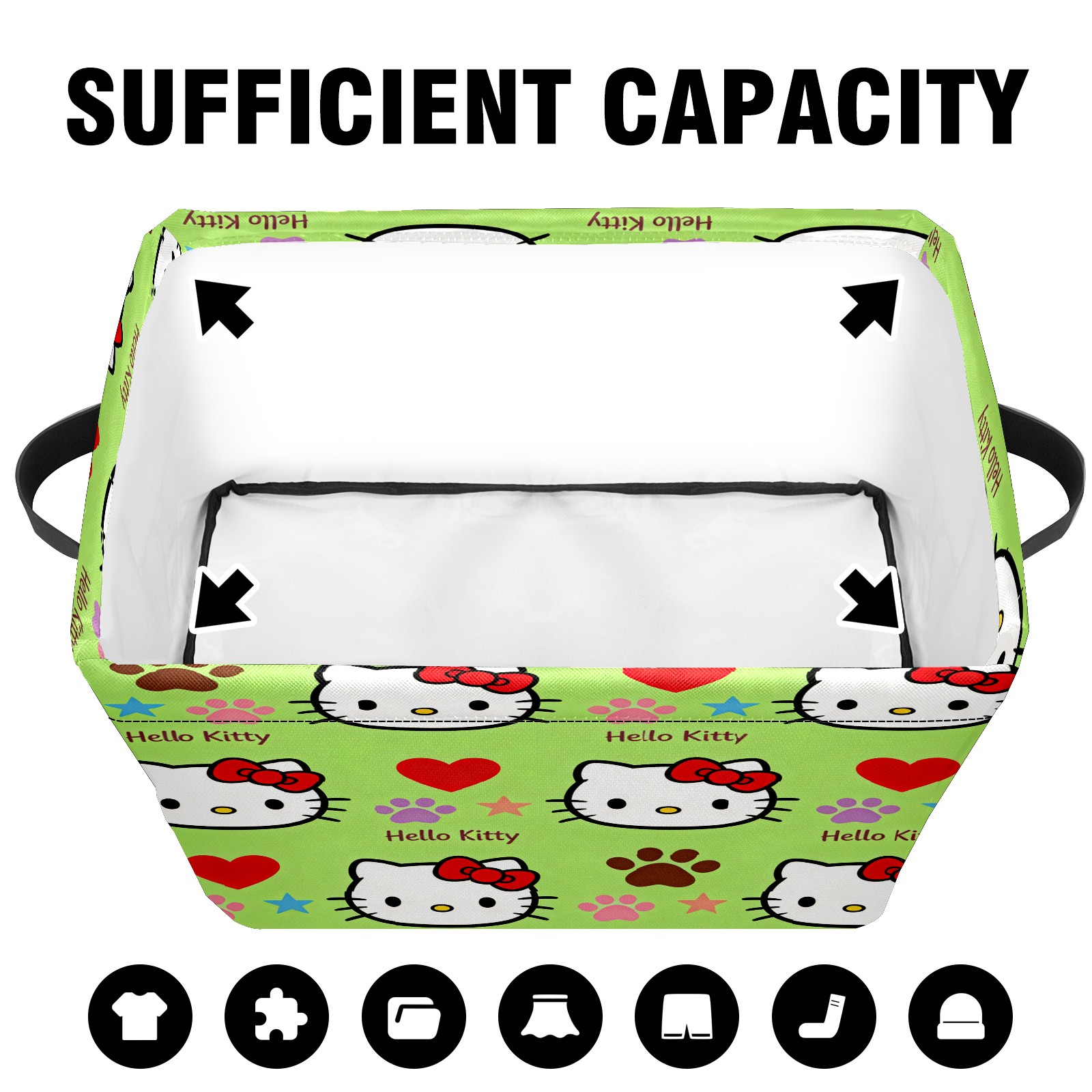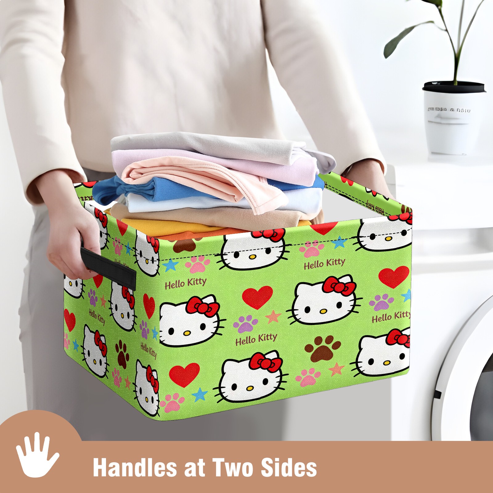 Foldable and Stackable Fabric Storage Basket for Home Organization with Handles, Decorative Closet Bins for Shelves and Laundry Storage( Fiery Hello Kitty Green)