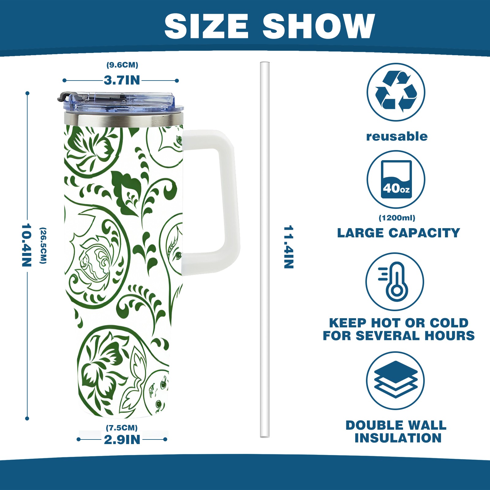 • С большой емкостью 40 унций, он обеспечивает вас гидратацией в течение всего дня, идеально подходит для воды, кофе, сока или других напитков. Эргономичный дизайн идеально вписывается в автомобильные держатели для бутылок, а прочный, герметичный колпачок предотвращает утечки во время передвижения. Путешествие. Антискользящее основание обеспечивает устойчивость, а гладкие поверхности делают уборку легкой — просто мойте вручную или кладите в посудомоечную машину (рекомендуется верхний поддон).