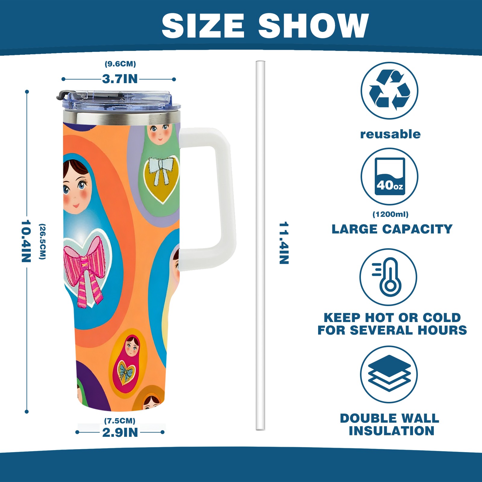 • С большой емкостью 40 унций, он обеспечивает вас гидратацией в течение всего дня, идеально подходит для воды, кофе, сока или других напитков. Эргономичный дизайн идеально вписывается в автомобильные держатели для бутылок, а прочный, герметичный колпачок предотвращает утечки во время передвижения. Путешествие. Антискользящее основание обеспечивает устойчивость, а гладкие поверхности делают уборку легкой — просто мойте вручную или кладите в посудомоечную машину (рекомендуется верхний поддон).