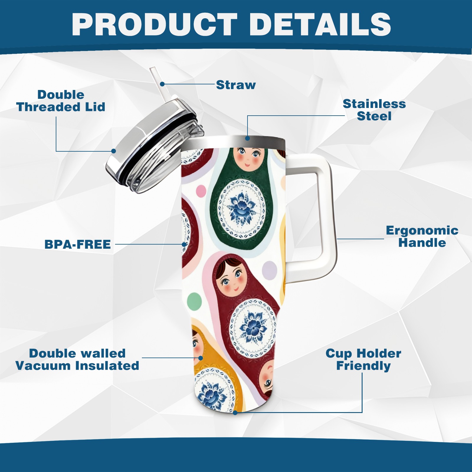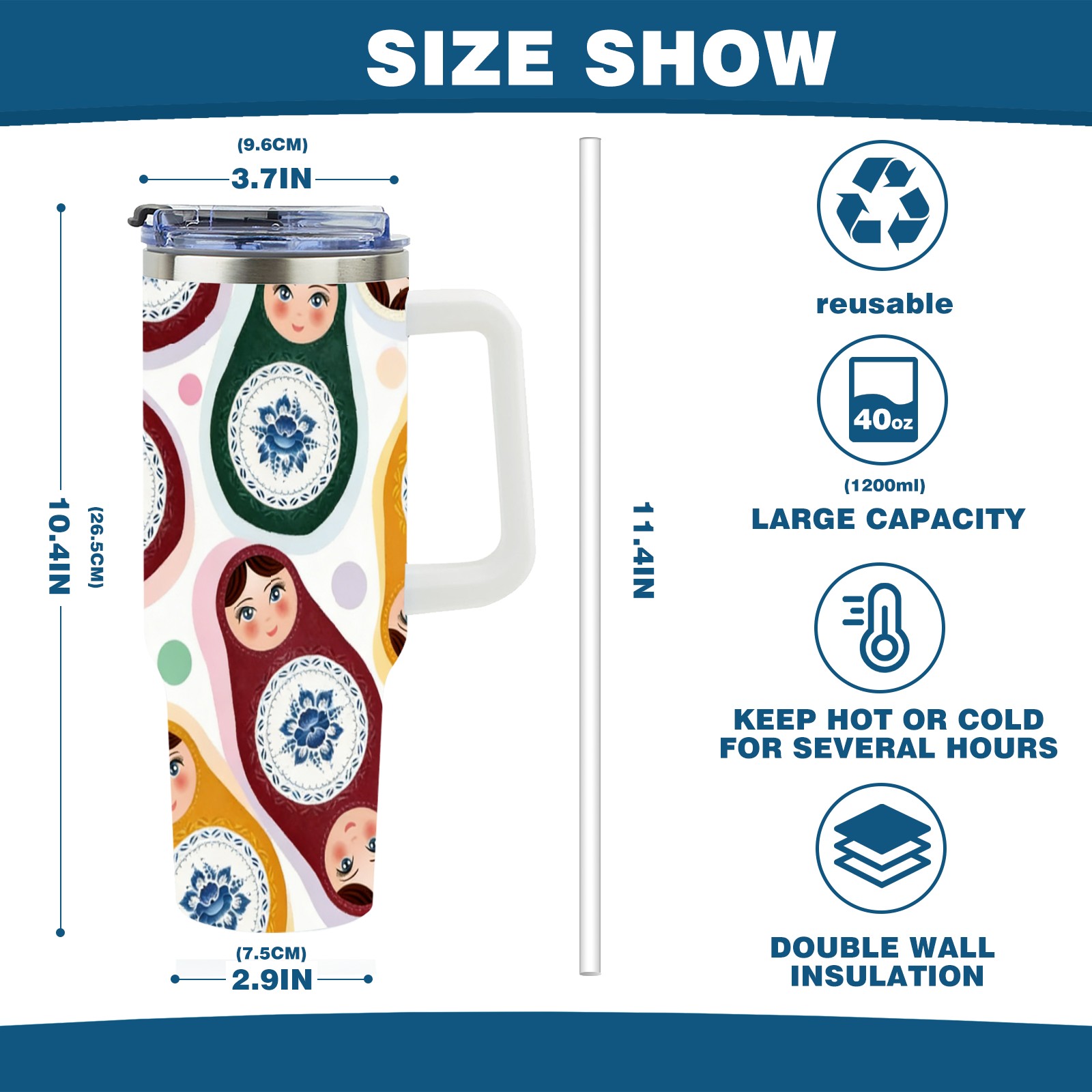 • С большой емкостью 40 унций, он обеспечивает вас гидратацией в течение всего дня, идеально подходит для воды, кофе, сока или других напитков. Эргономичный дизайн идеально вписывается в автомобильные держатели для бутылок, а прочный, герметичный колпачок предотвращает утечки во время передвижения. Путешествие. Антискользящее основание обеспечивает устойчивость, а гладкие поверхности делают уборку легкой — просто мойте вручную или кладите в посудомоечную машину (рекомендуется верхний поддон).
