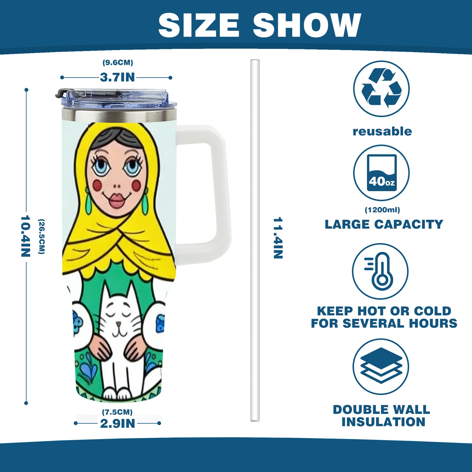 • С большой емкостью 40 унций, он обеспечивает вас гидратацией в течение всего дня, идеально подходит для воды, кофе, сока или других напитков. Эргономичный дизайн идеально вписывается в автомобильные держатели для бутылок, а прочный, герметичный колпачок предотвращает утечки во время передвижения. Путешествие. Антискользящее основание обеспечивает устойчивость, а гладкие поверхности делают уборку легкой — просто мойте вручную или кладите в посудомоечную машину (рекомендуется верхний поддон).