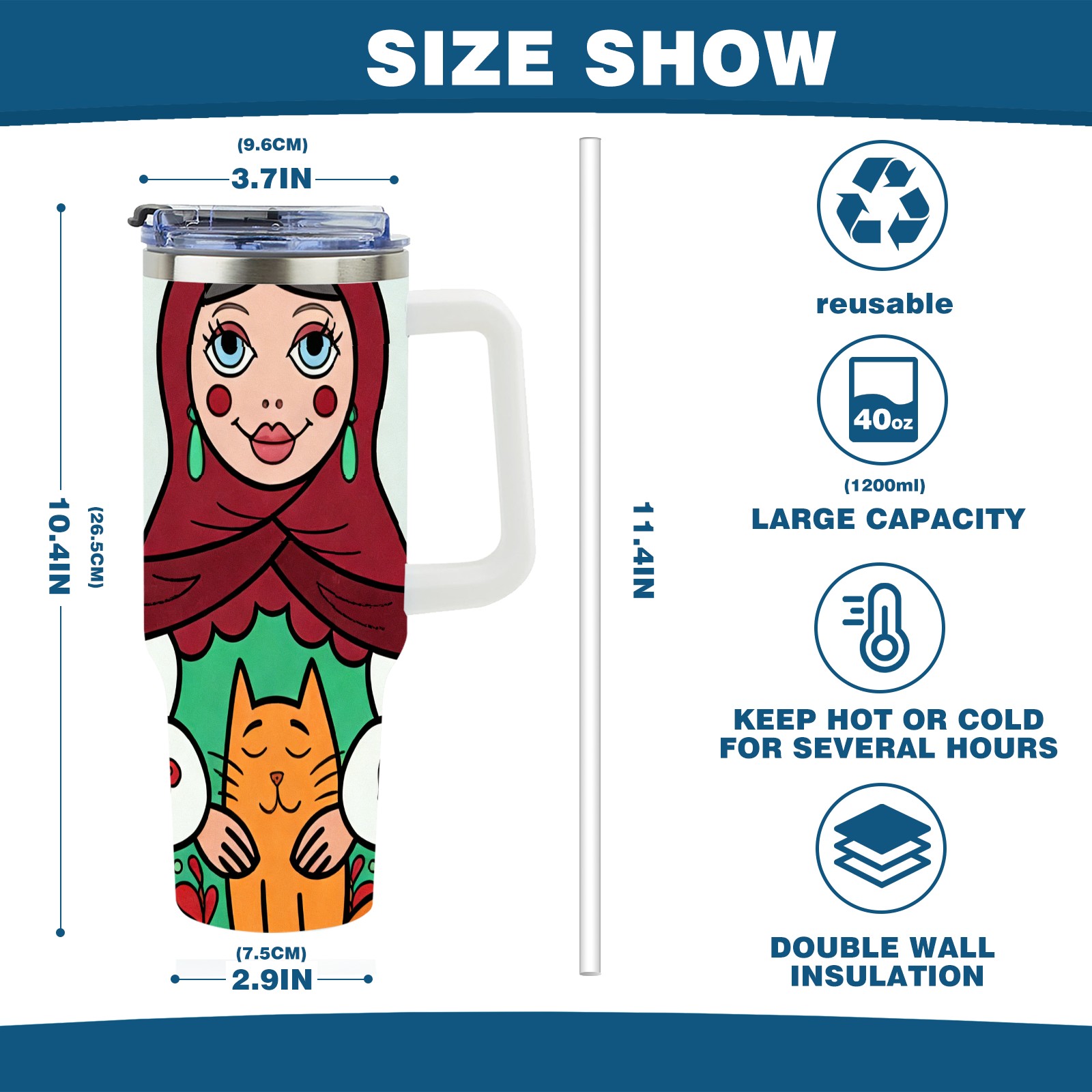 • С большой емкостью 40 унций, он обеспечивает вас гидратацией в течение всего дня, идеально подходит для воды, кофе, сока или других напитков. Эргономичный дизайн идеально вписывается в автомобильные держатели для бутылок, а прочный, герметичный колпачок предотвращает утечки во время передвижения. Путешествие. Антискользящее основание обеспечивает устойчивость, а гладкие поверхности делают уборку легкой — просто мойте вручную или кладите в посудомоечную машину (рекомендуется верхний поддон).