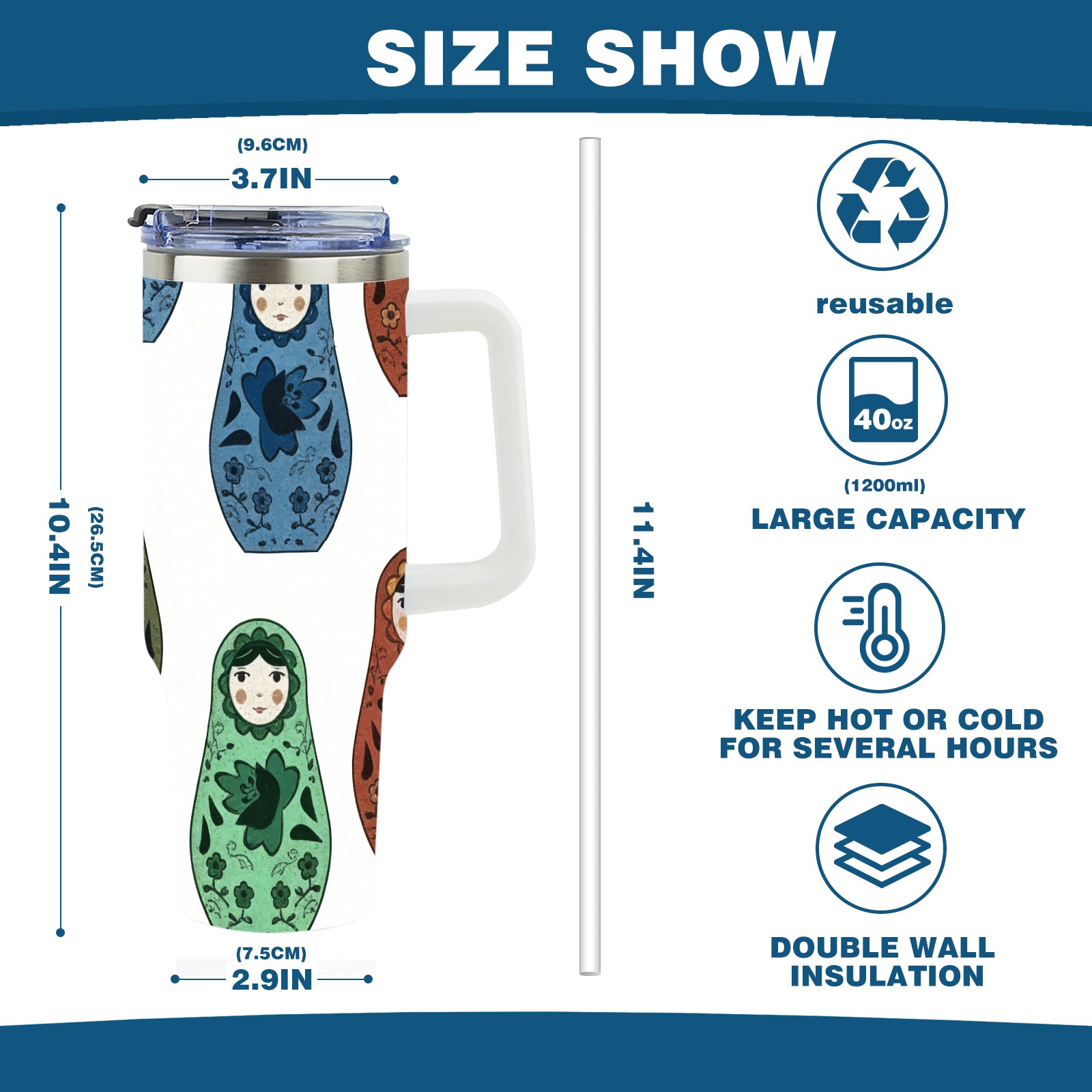 • С большой емкостью 40 унций, он обеспечивает вас гидратацией в течение всего дня, идеально подходит для воды, кофе, сока или других напитков. Эргономичный дизайн идеально вписывается в автомобильные держатели для бутылок, а прочный, герметичный колпачок предотвращает утечки во время передвижения. Путешествие. Антискользящее основание обеспечивает устойчивость, а гладкие поверхности делают уборку легкой — просто мойте вручную или кладите в посудомоечную машину (рекомендуется верхний поддон).