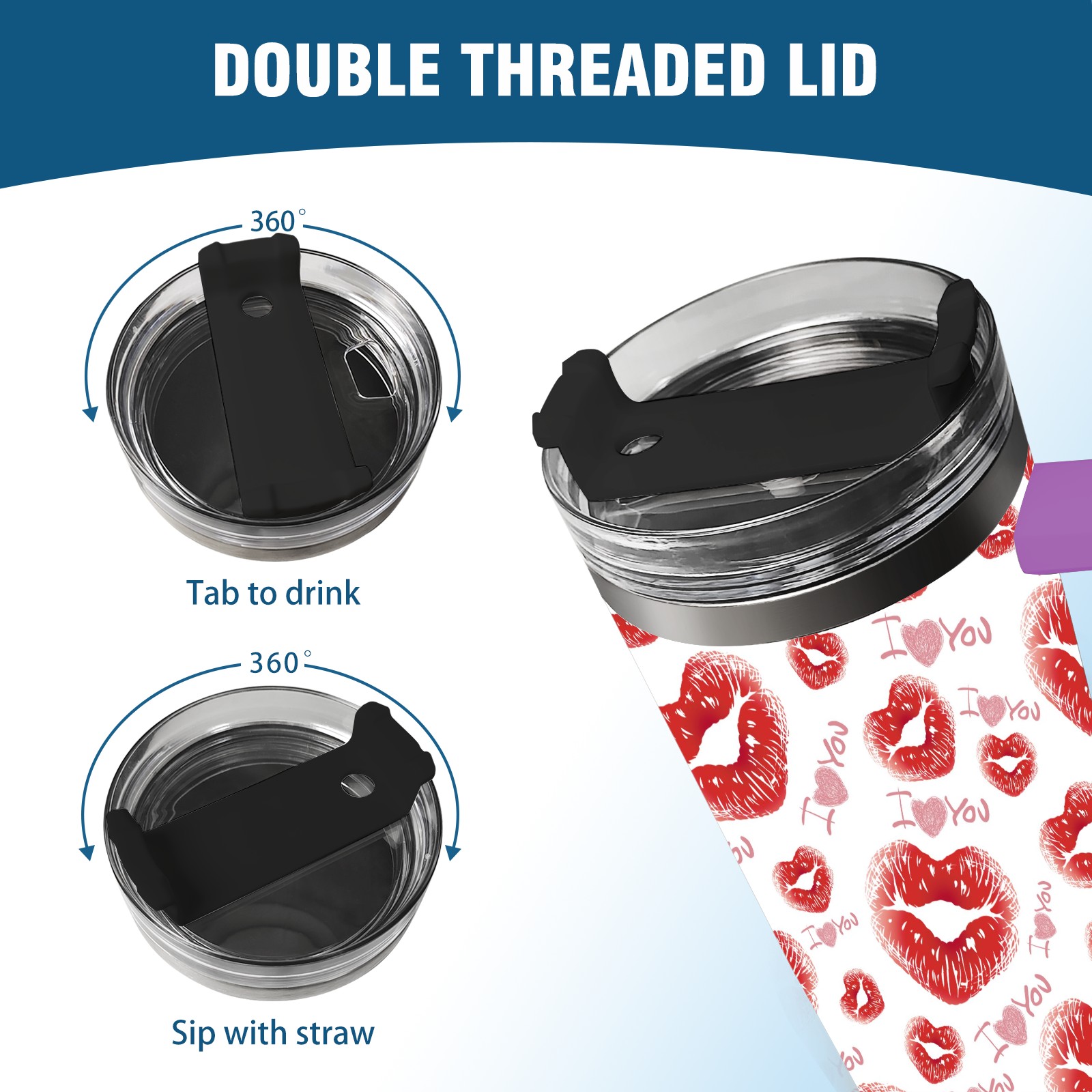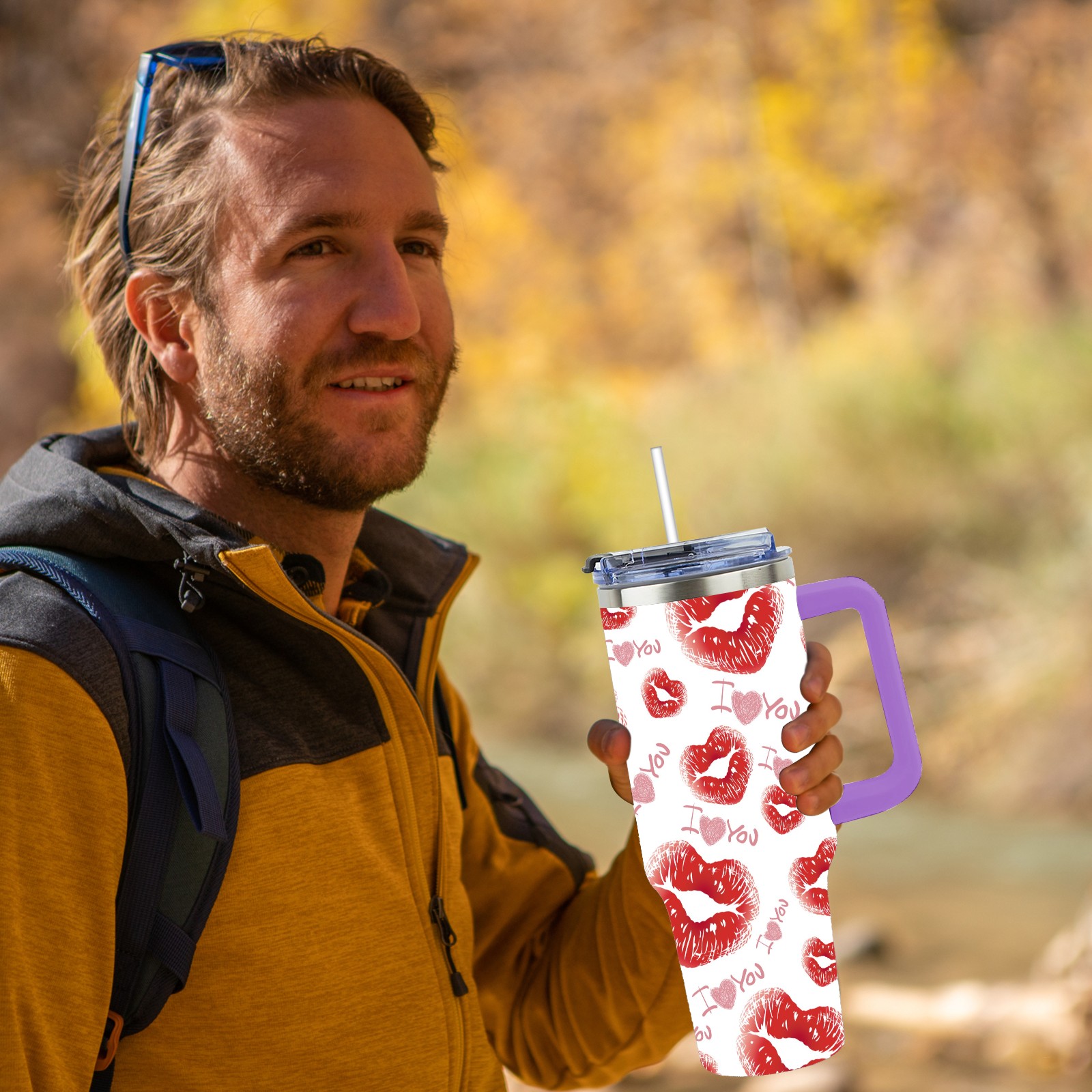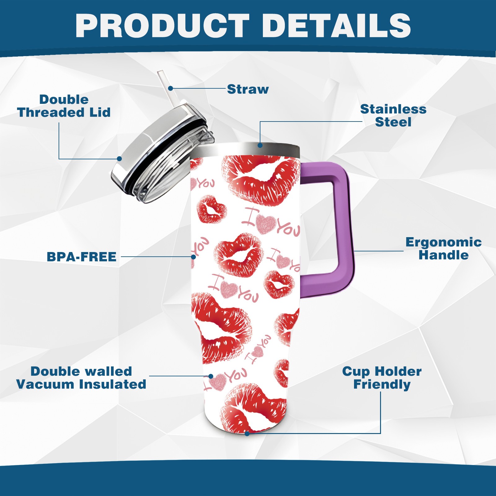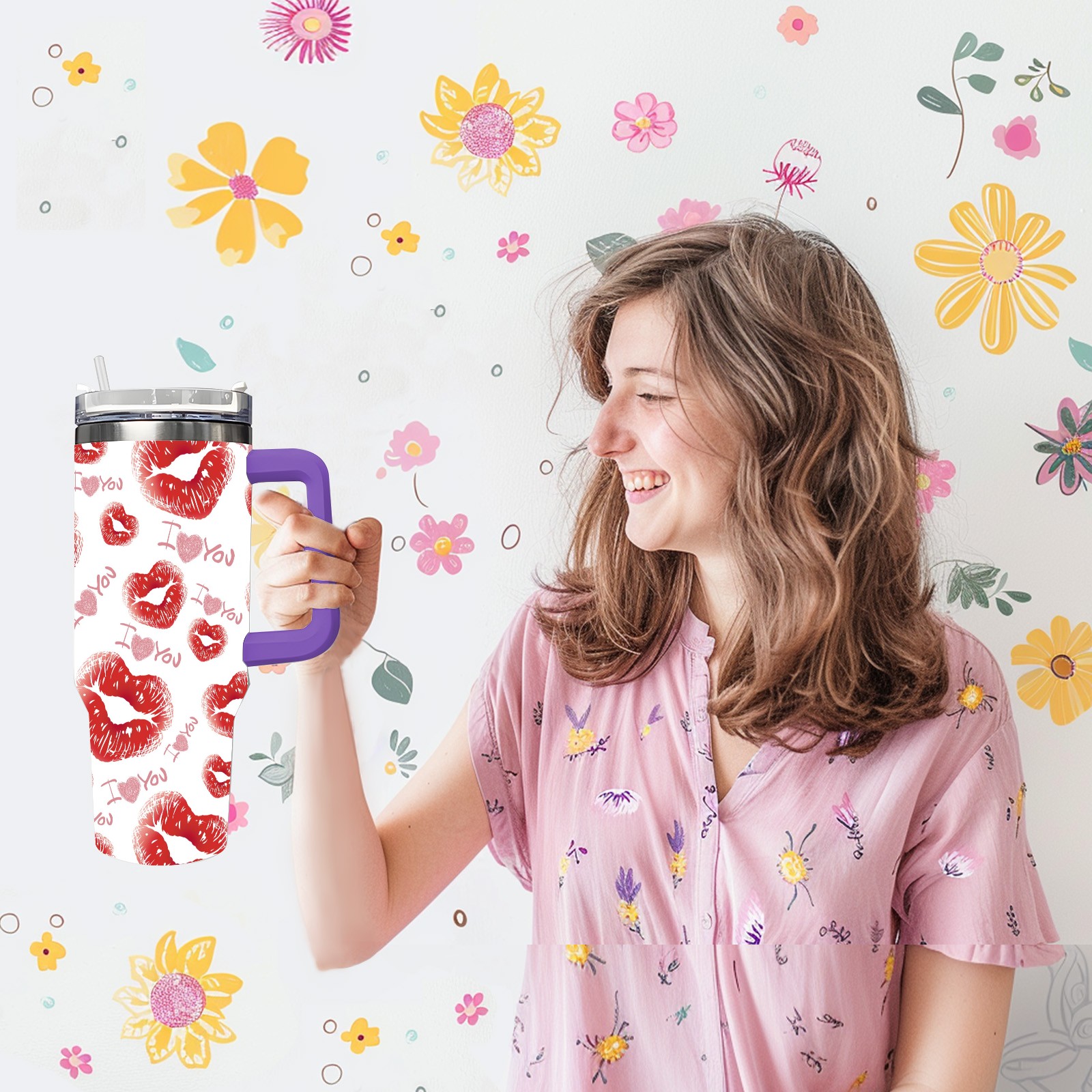 40oz 嘴唇款式 thermos with lid and straw, leak-proof stainless steel, with handle, spill-proof bottle, convenient for travel(purple)
