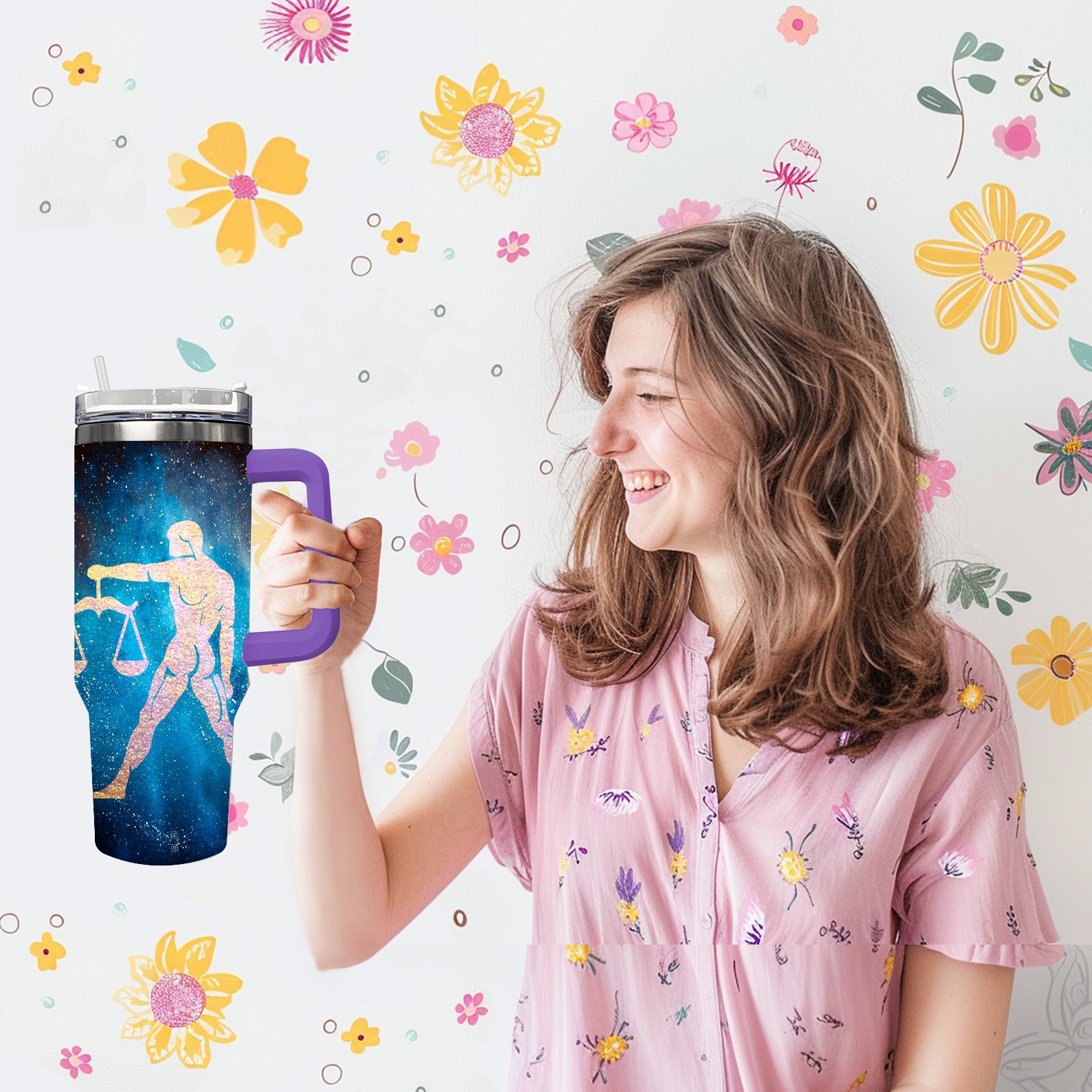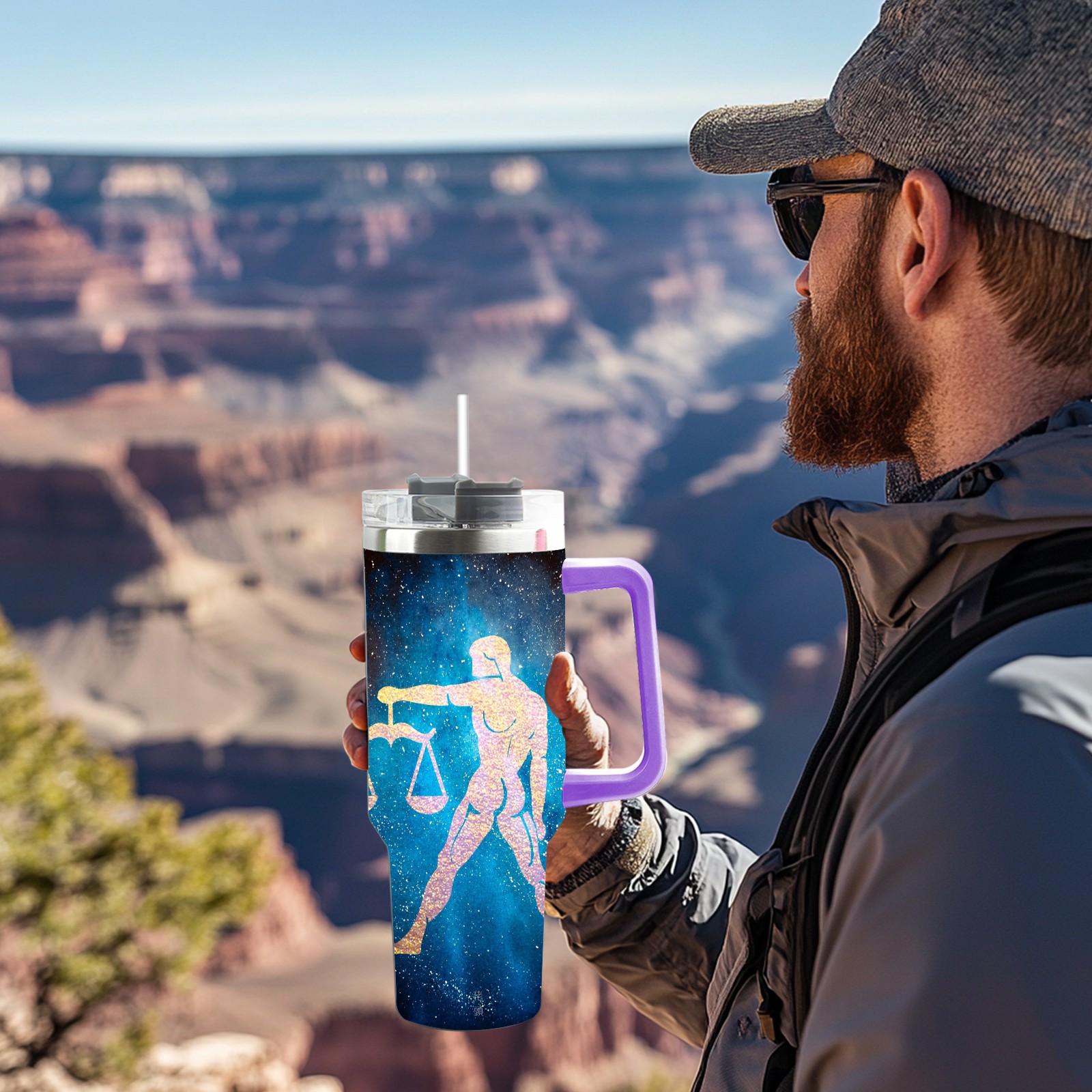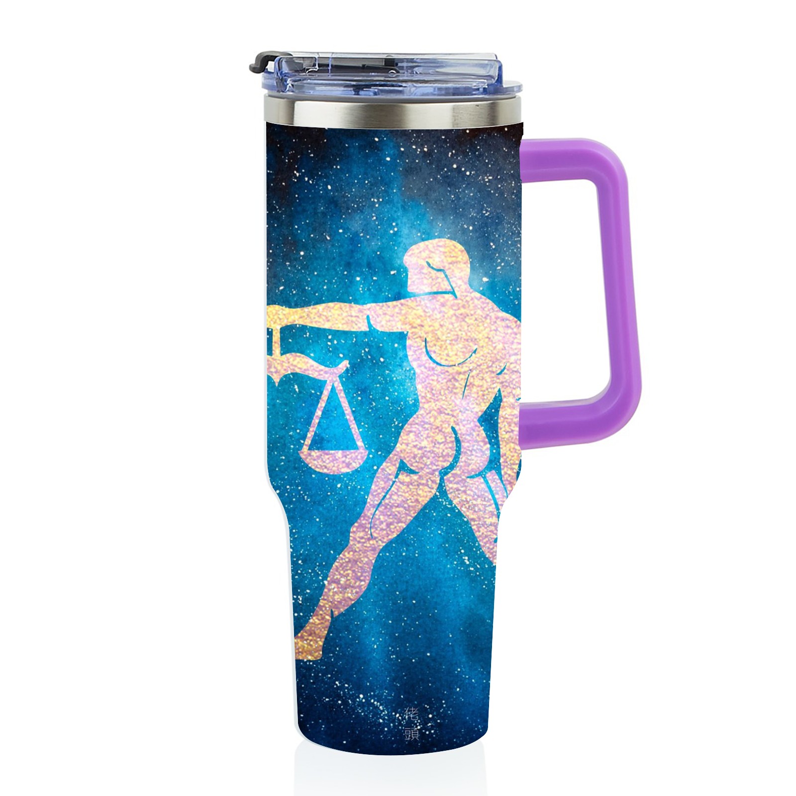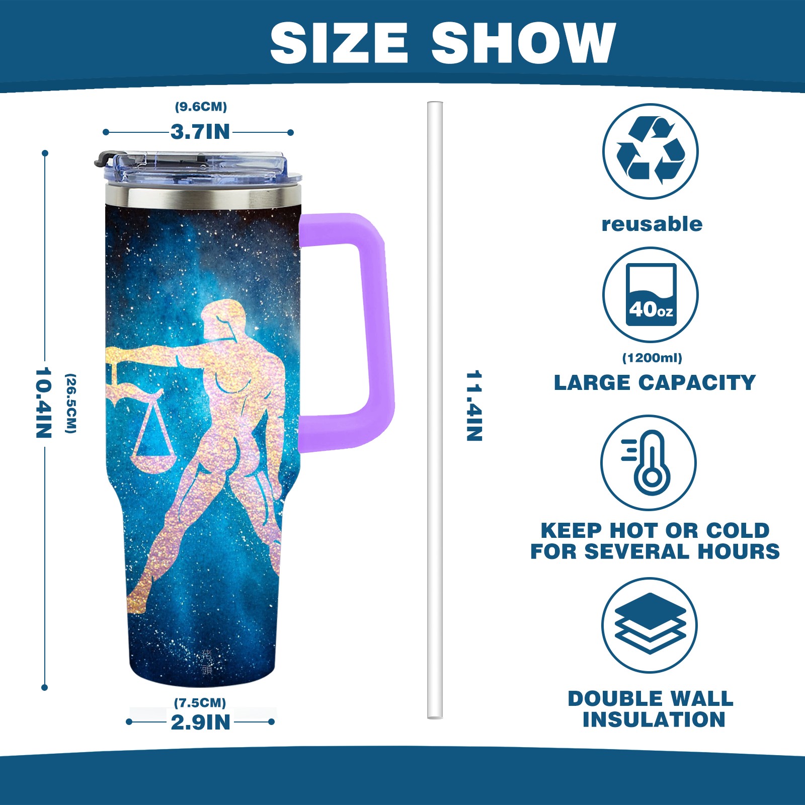 40oz 十二星座 天秤座 thermos with lid and straw, leak-proof stainless steel, with handle, spill-proof bottle, convenient for travel(purple)
