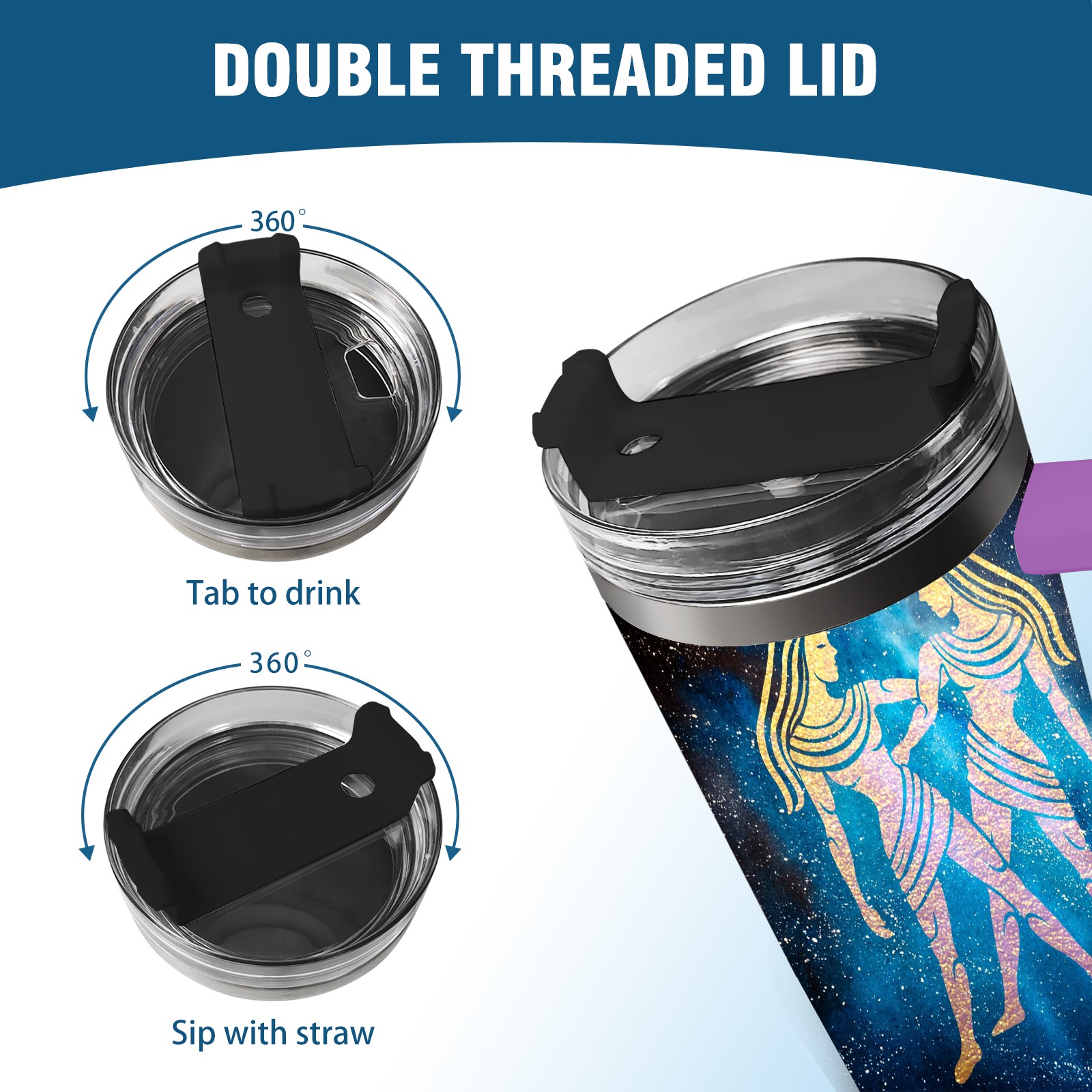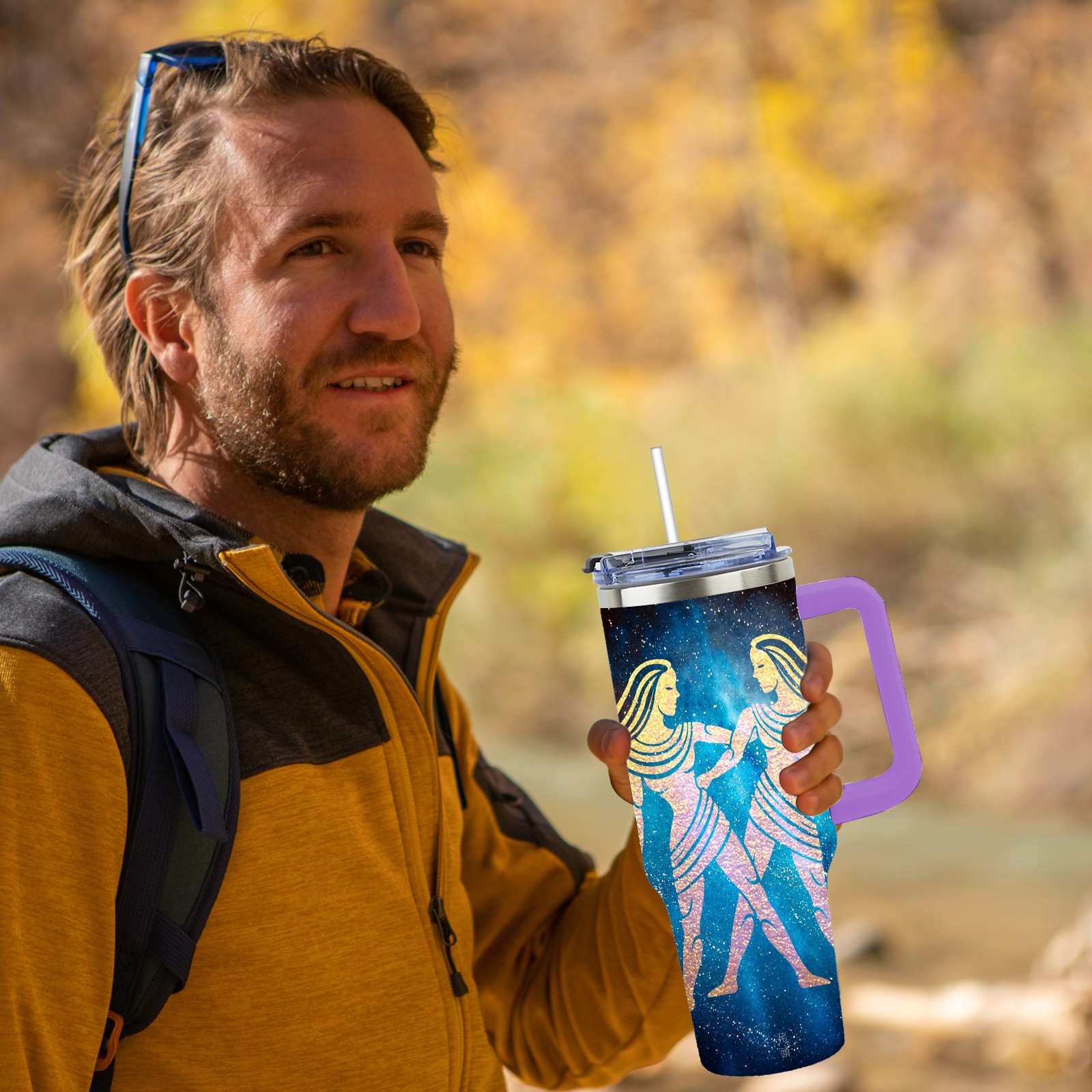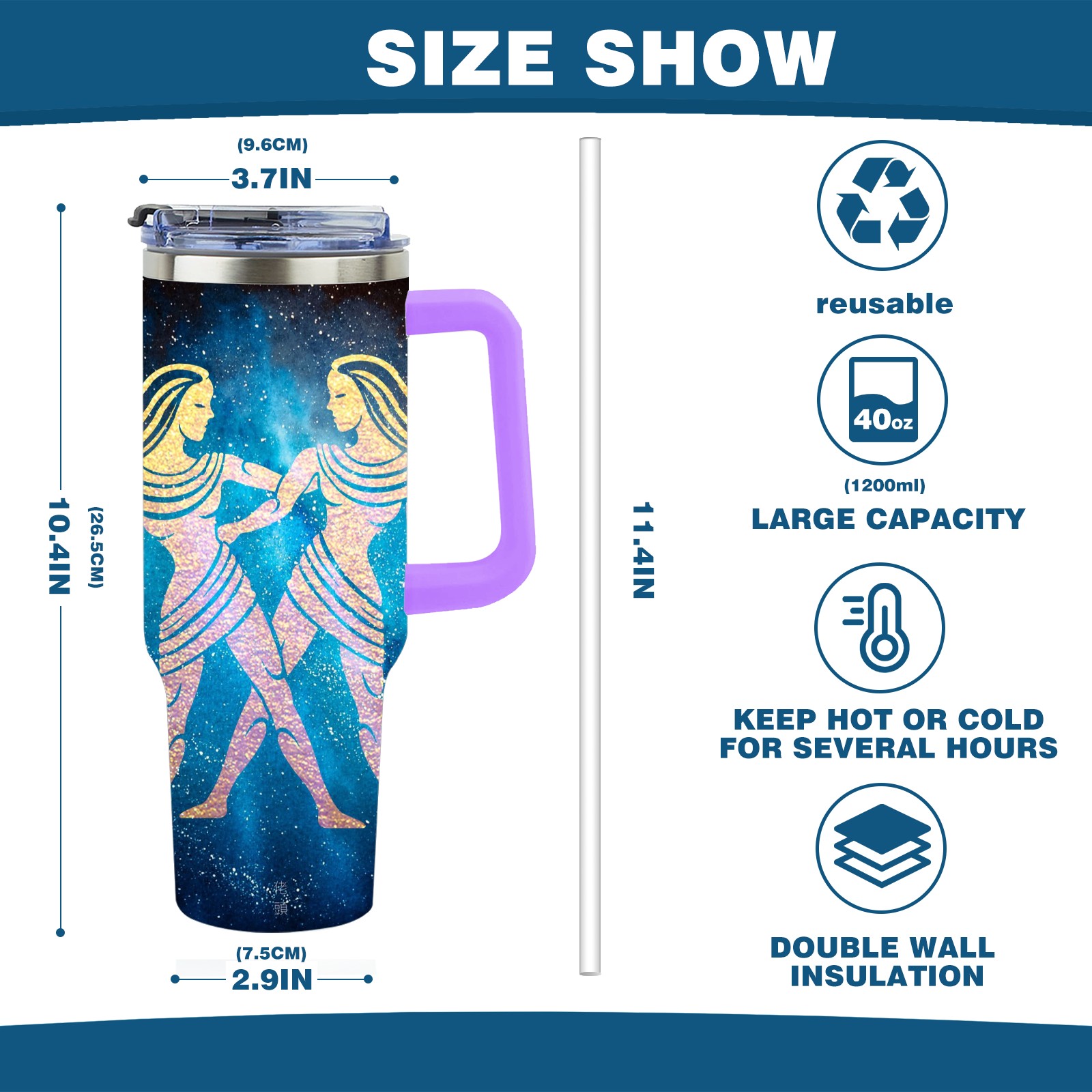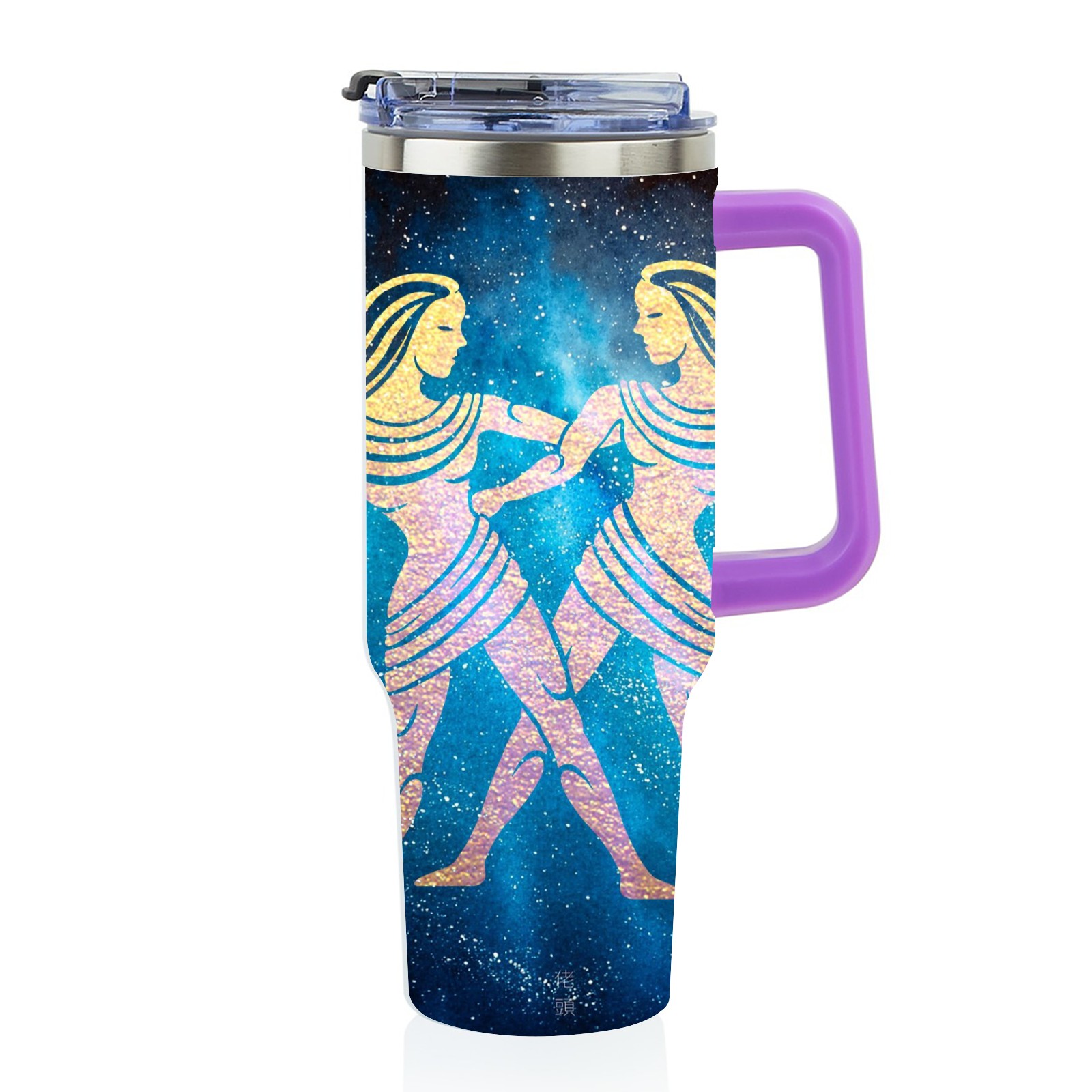 40oz 十二星座 双子座 thermos with lid and straw, leak-proof stainless steel, with handle, spill-proof bottle, convenient for travel(purple)