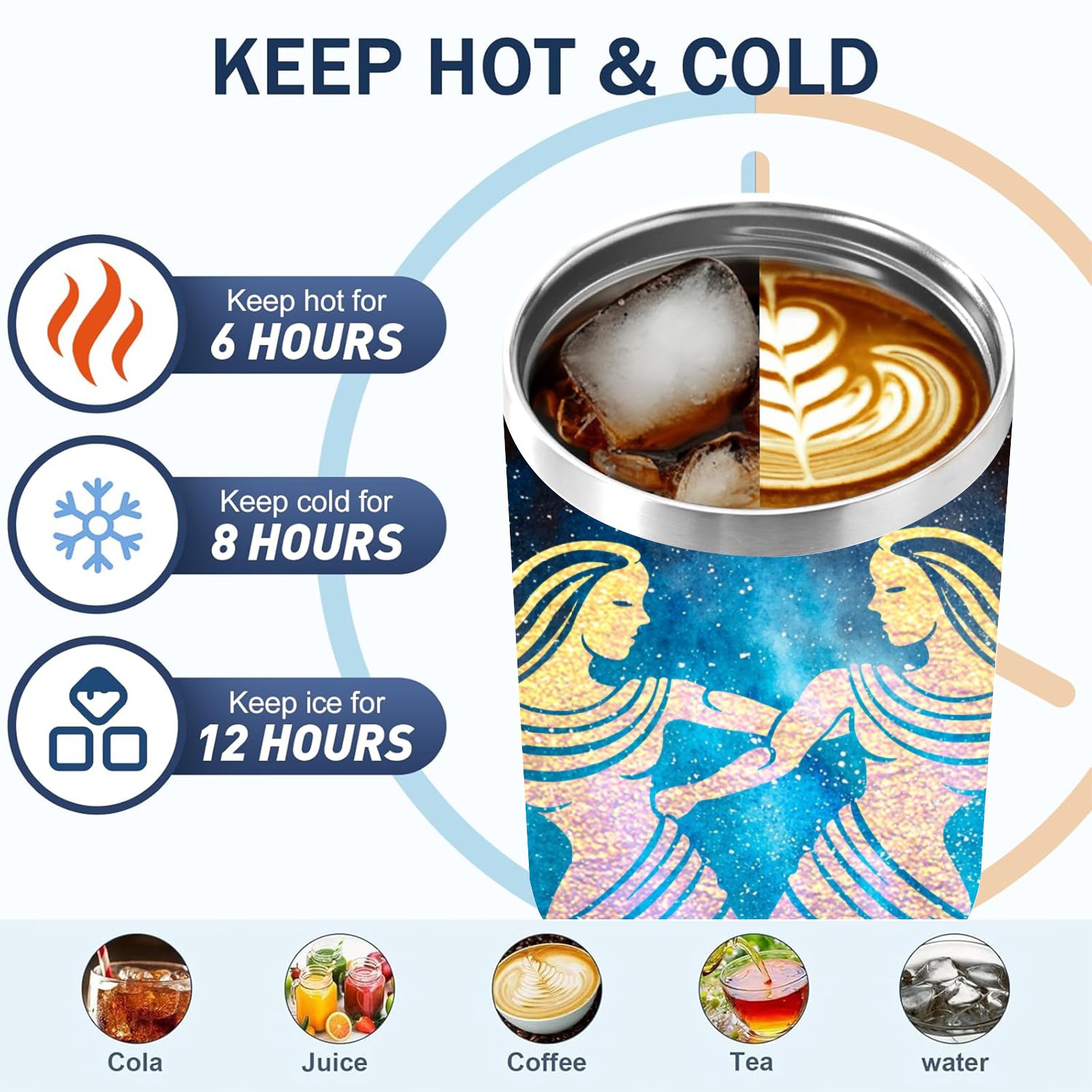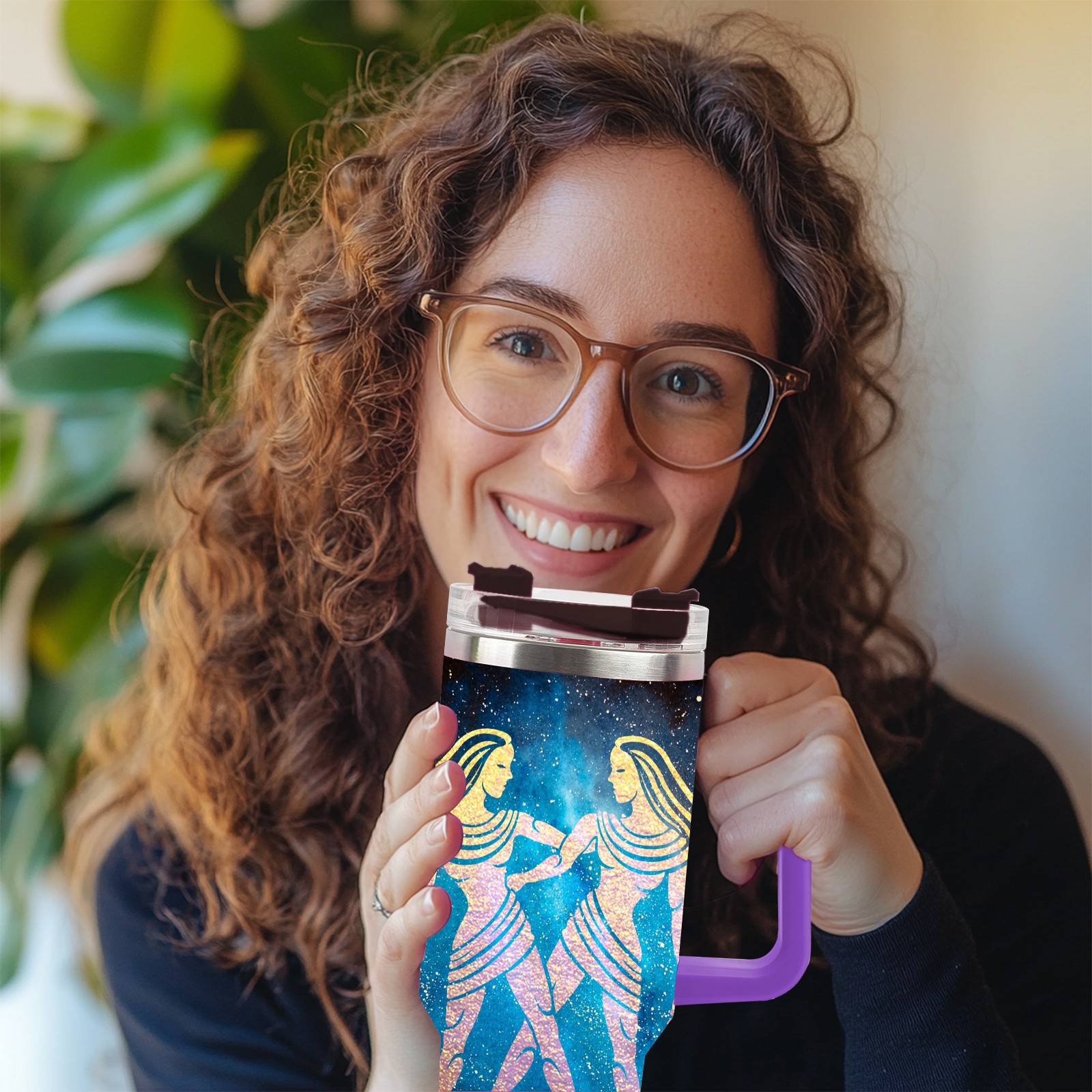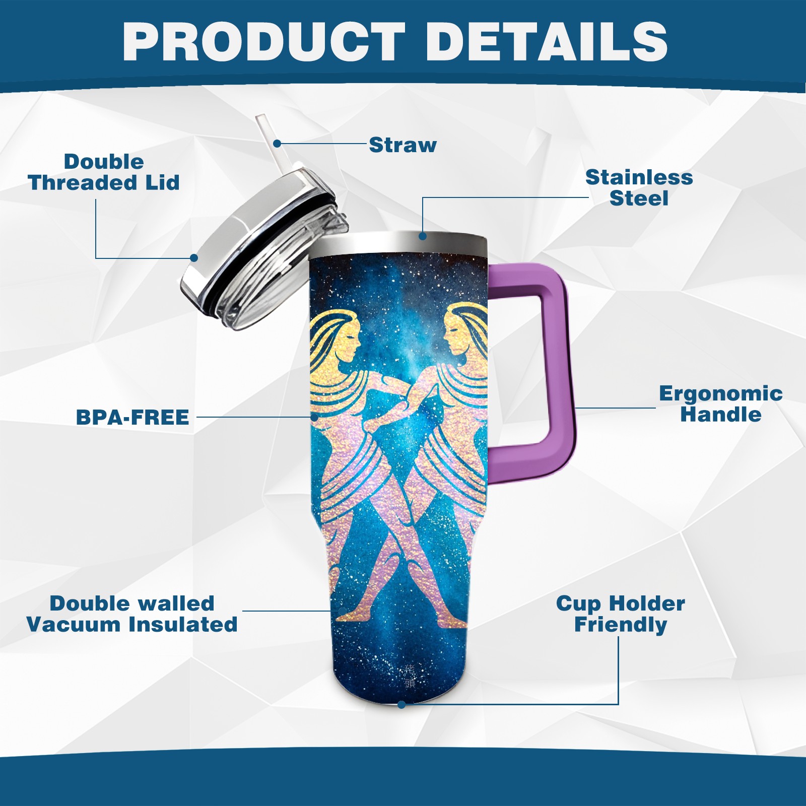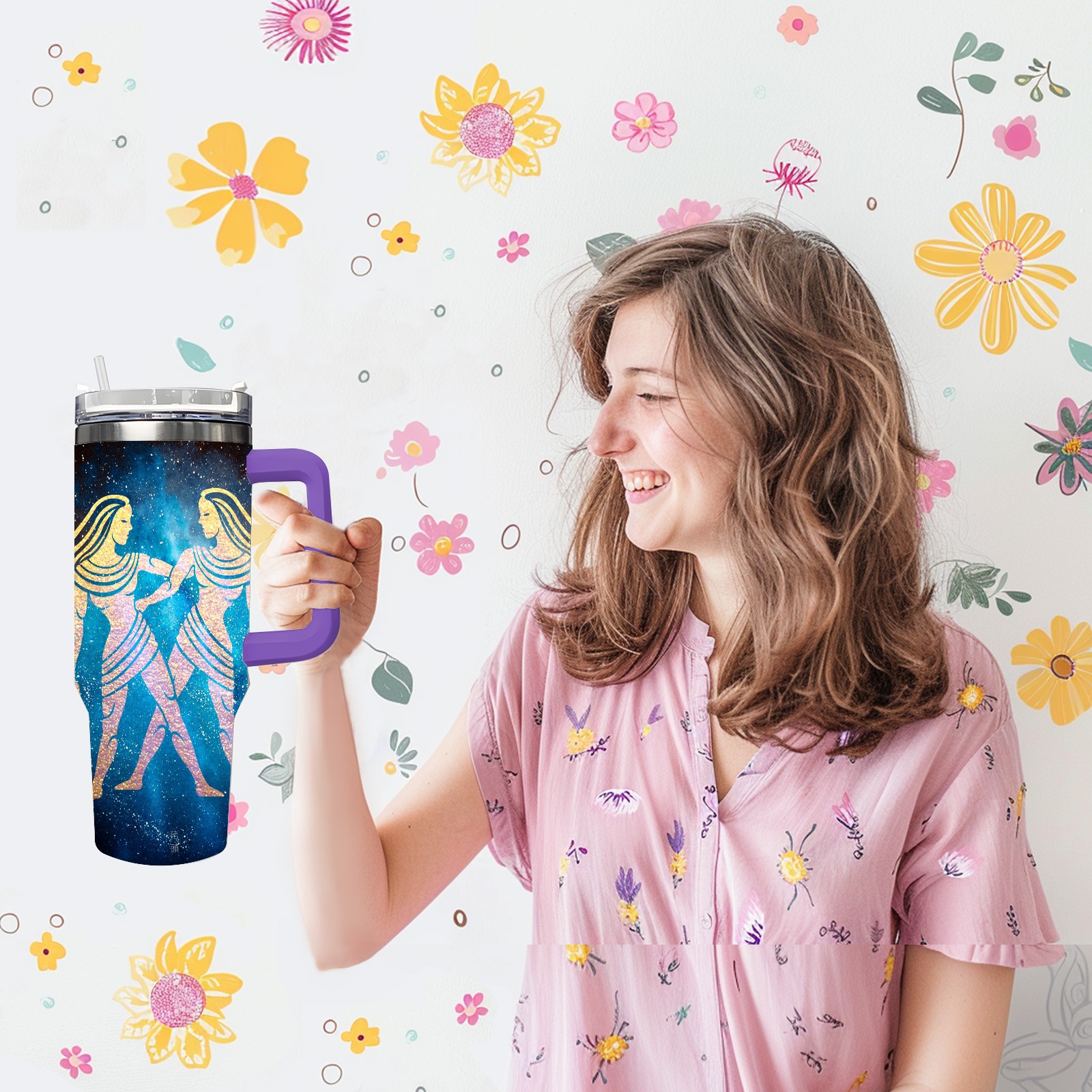 40oz 十二星座 双子座 thermos with lid and straw, leak-proof stainless steel, with handle, spill-proof bottle, convenient for travel(purple)