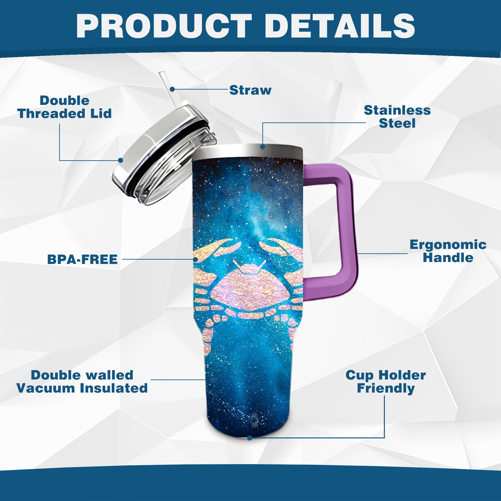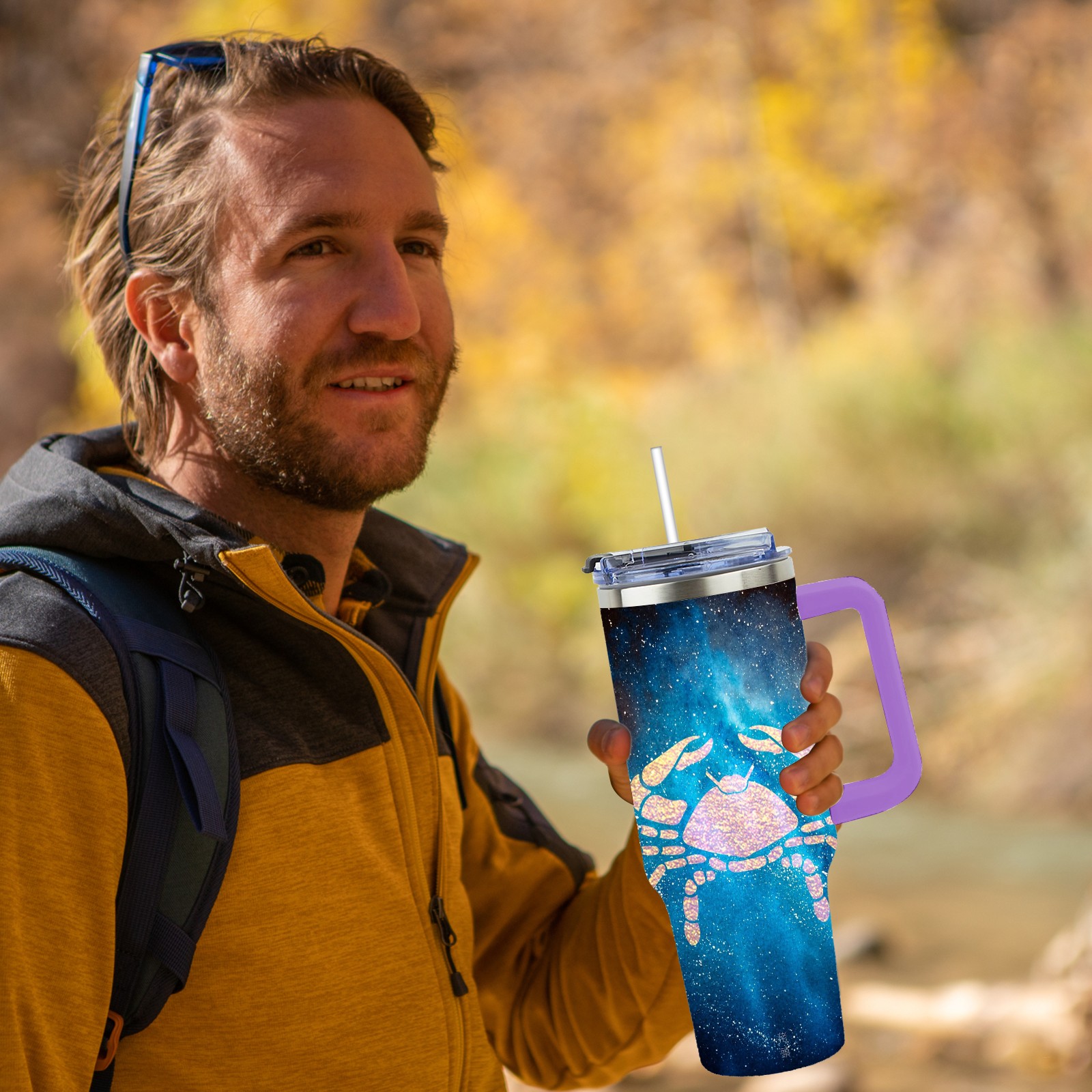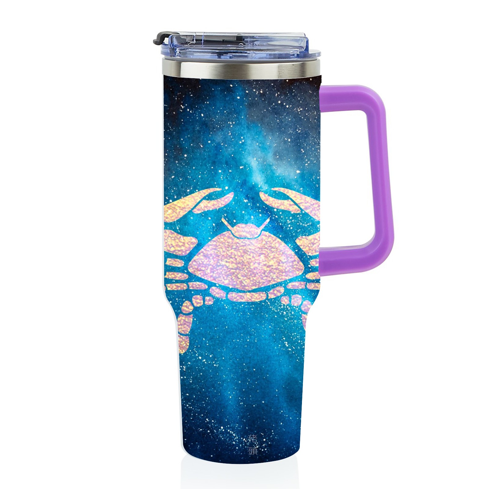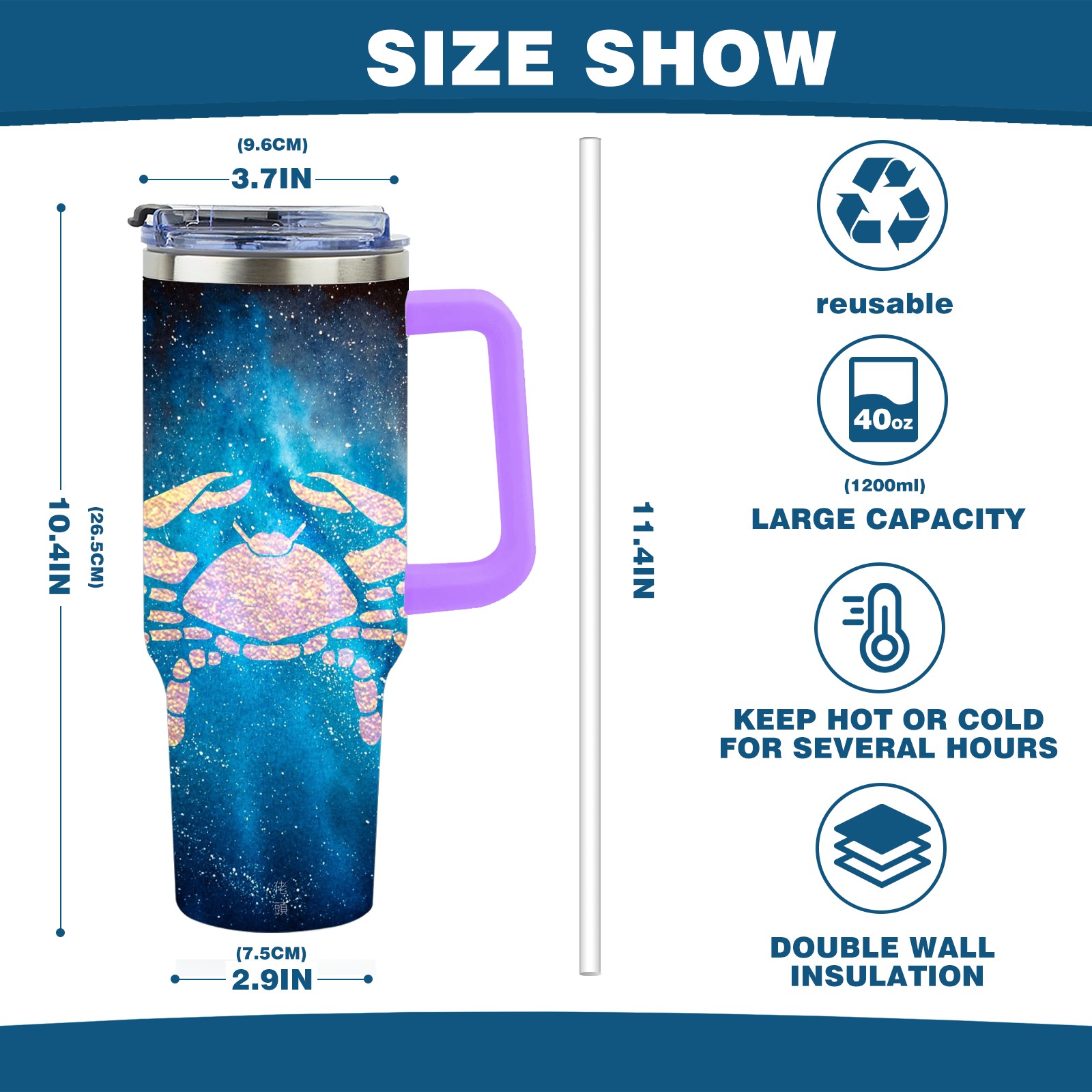 40oz 十二星座 巨蟹座 thermos with lid and straw, leak-proof stainless steel, with handle, spill-proof bottle, convenient for travel(purple)