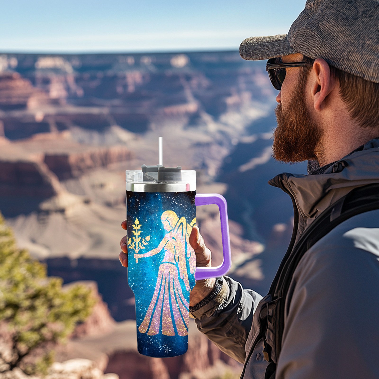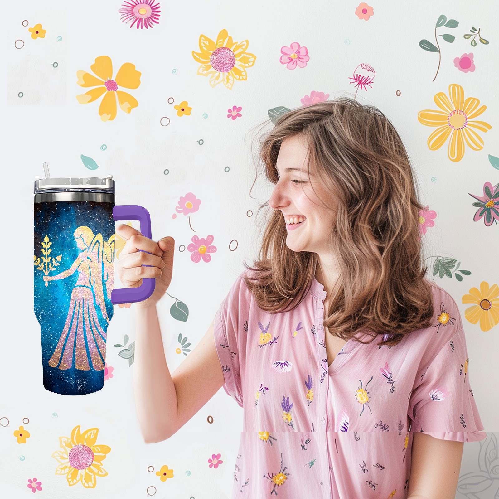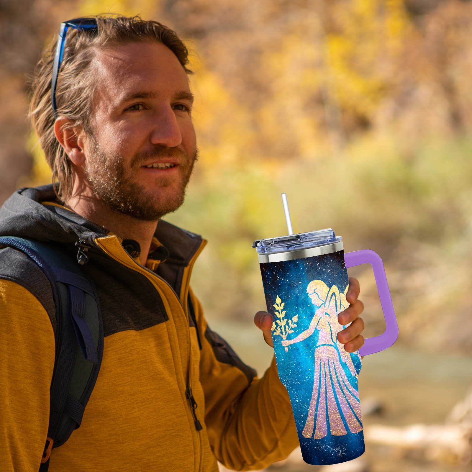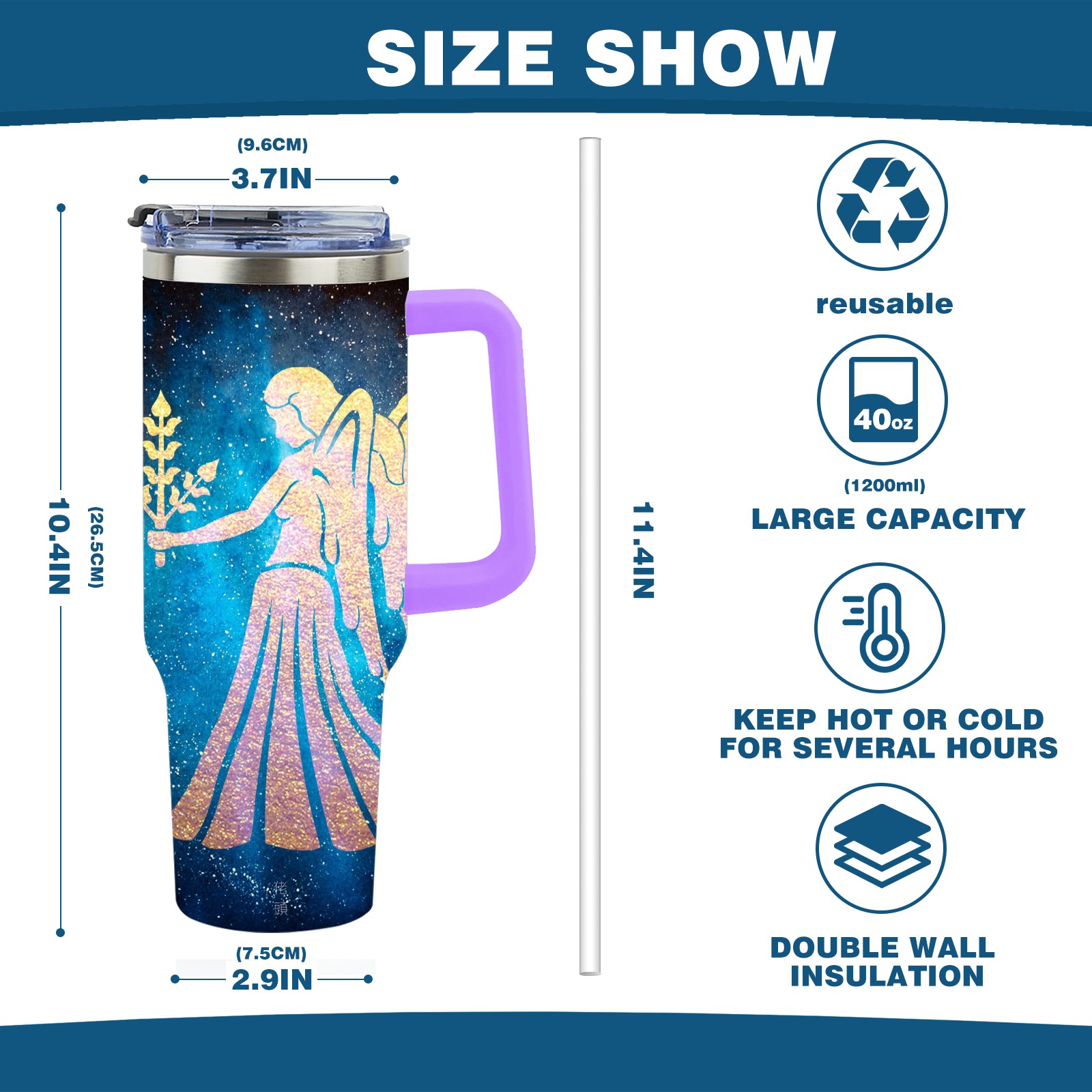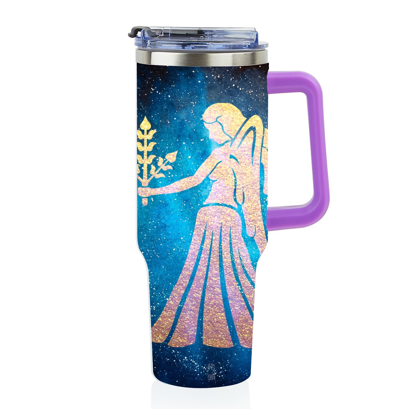 40oz 十二星座 处女座 thermos with lid and straw, leak-proof stainless steel, with handle, spill-proof bottle, convenient for travel(purple)