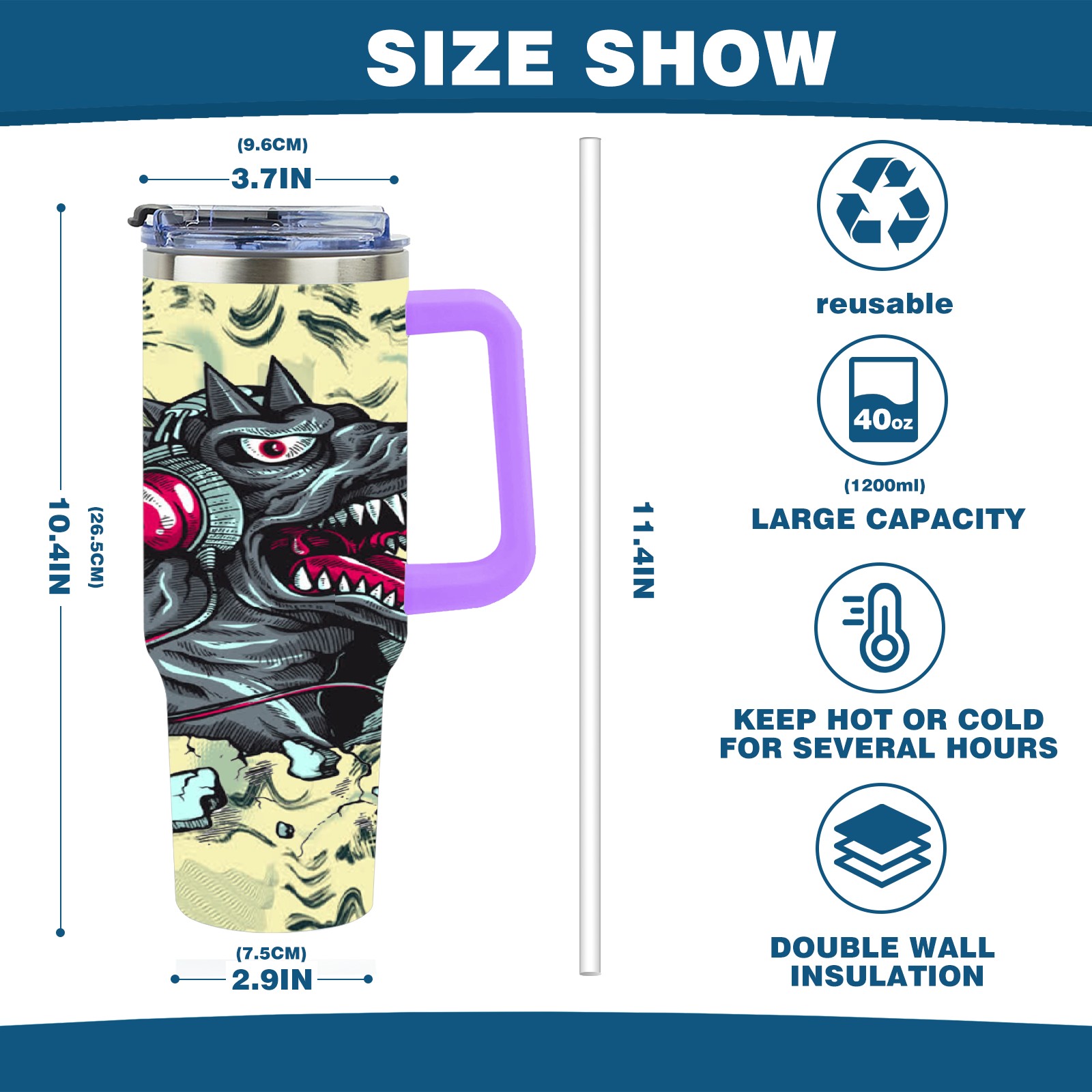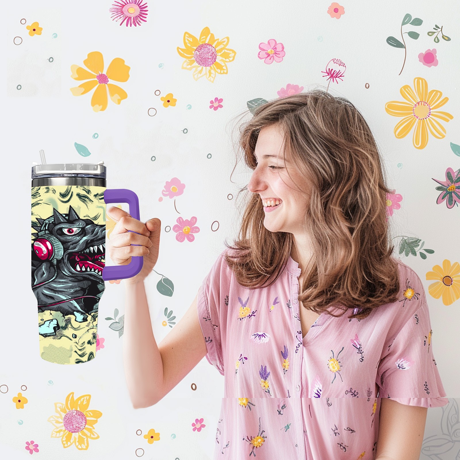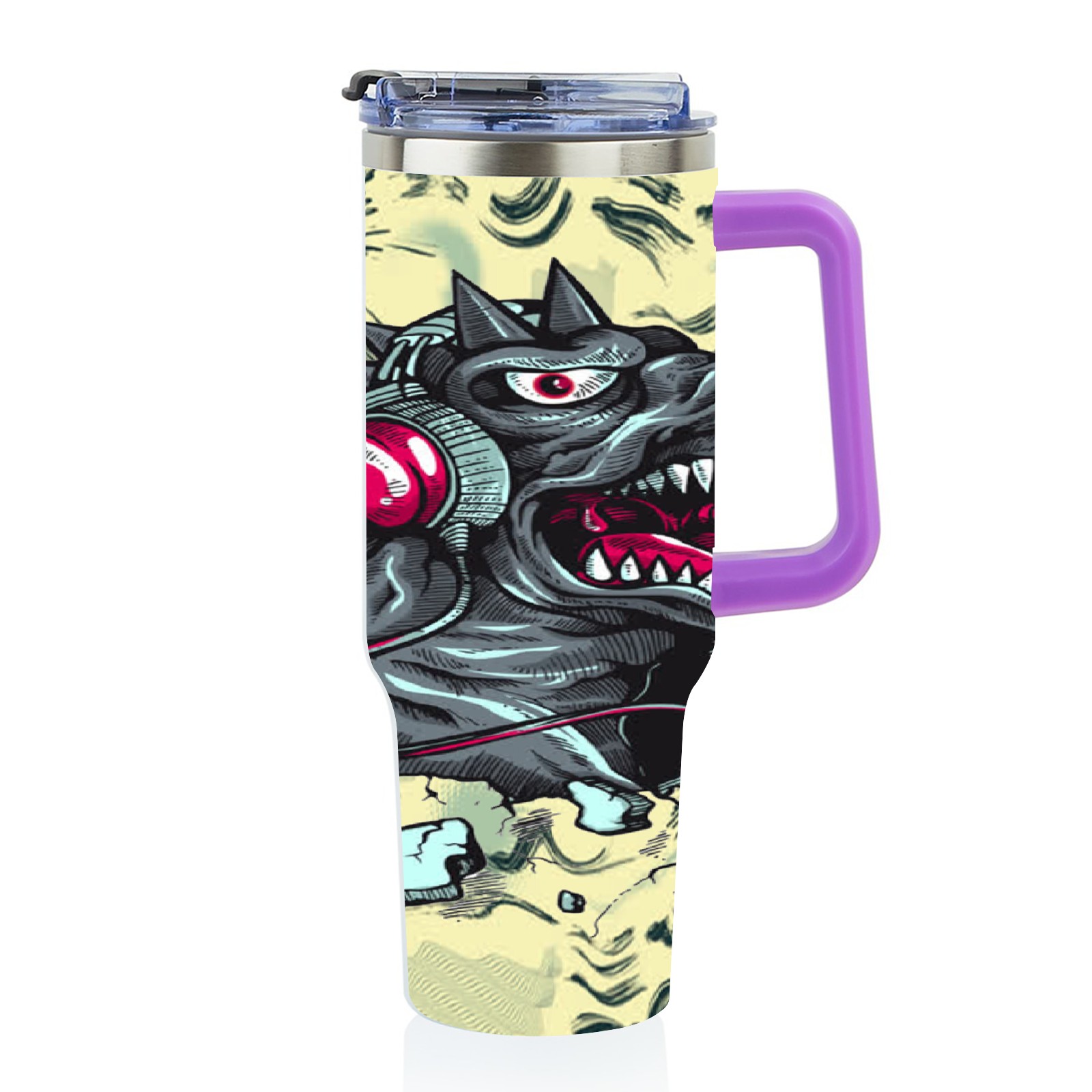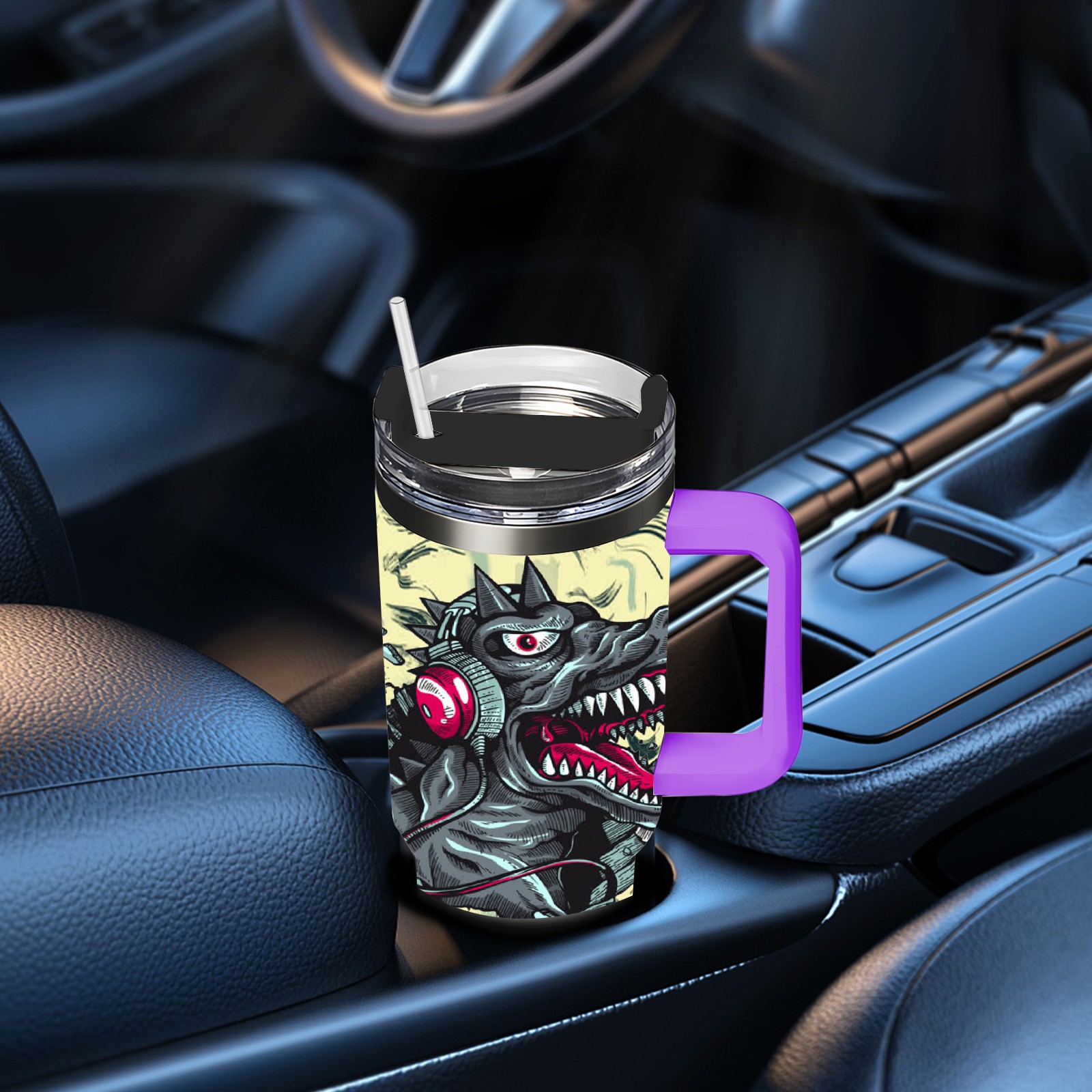 40oz 破墙小恐龙 thermos with lid and straw, leak-proof stainless steel, with handle, spill-proof bottle, convenient for travel(purple)