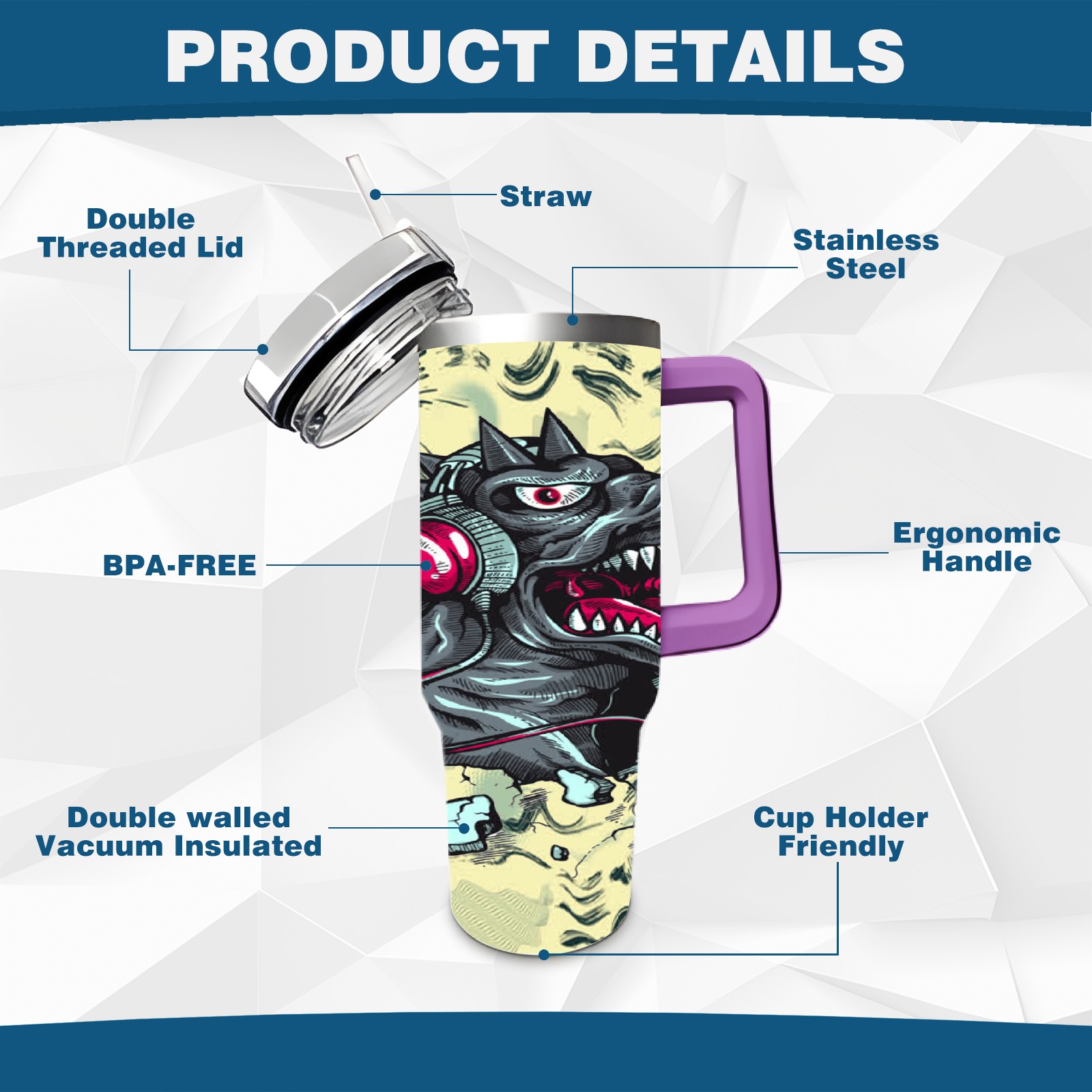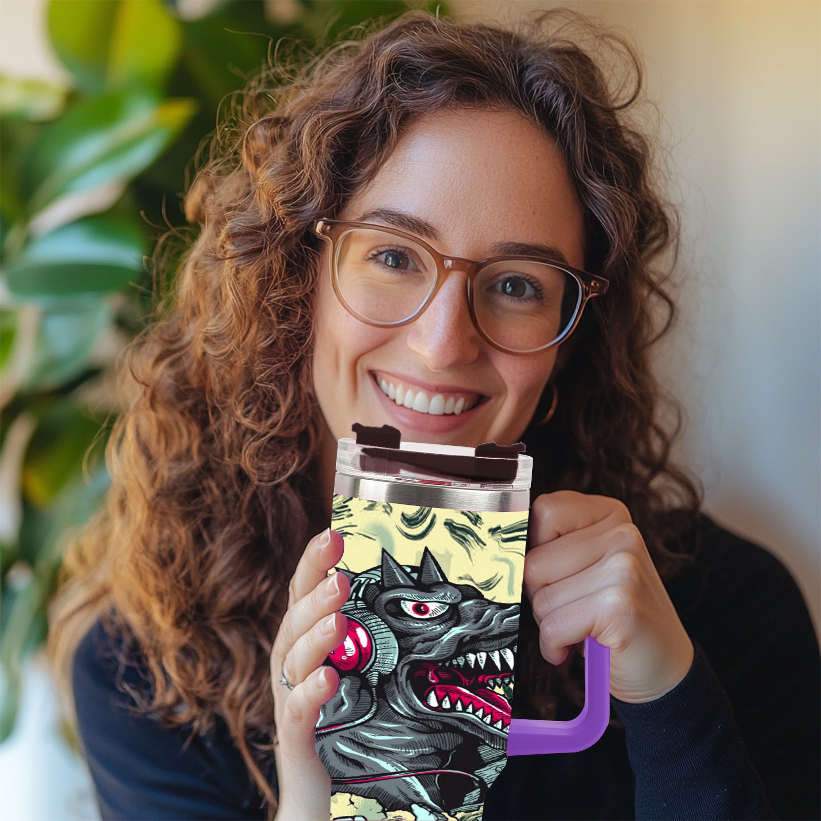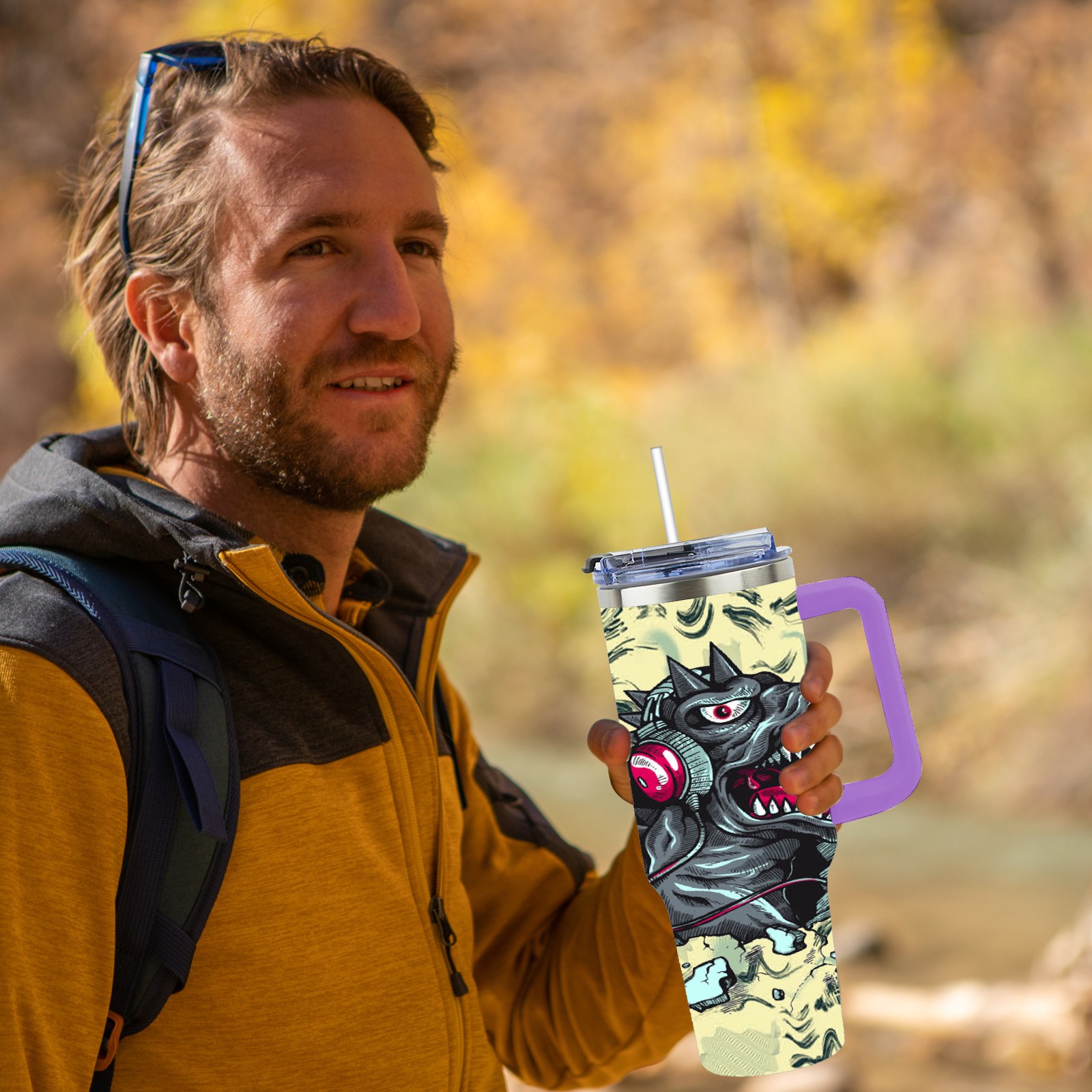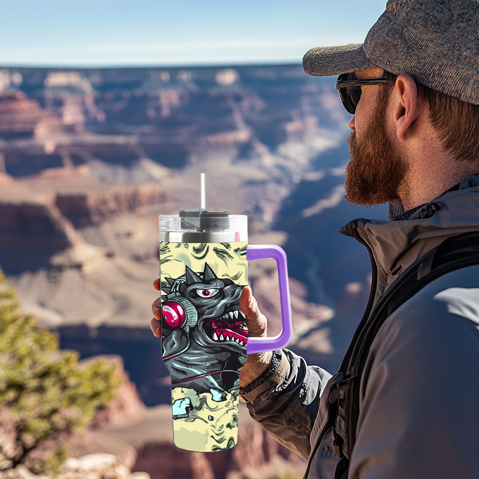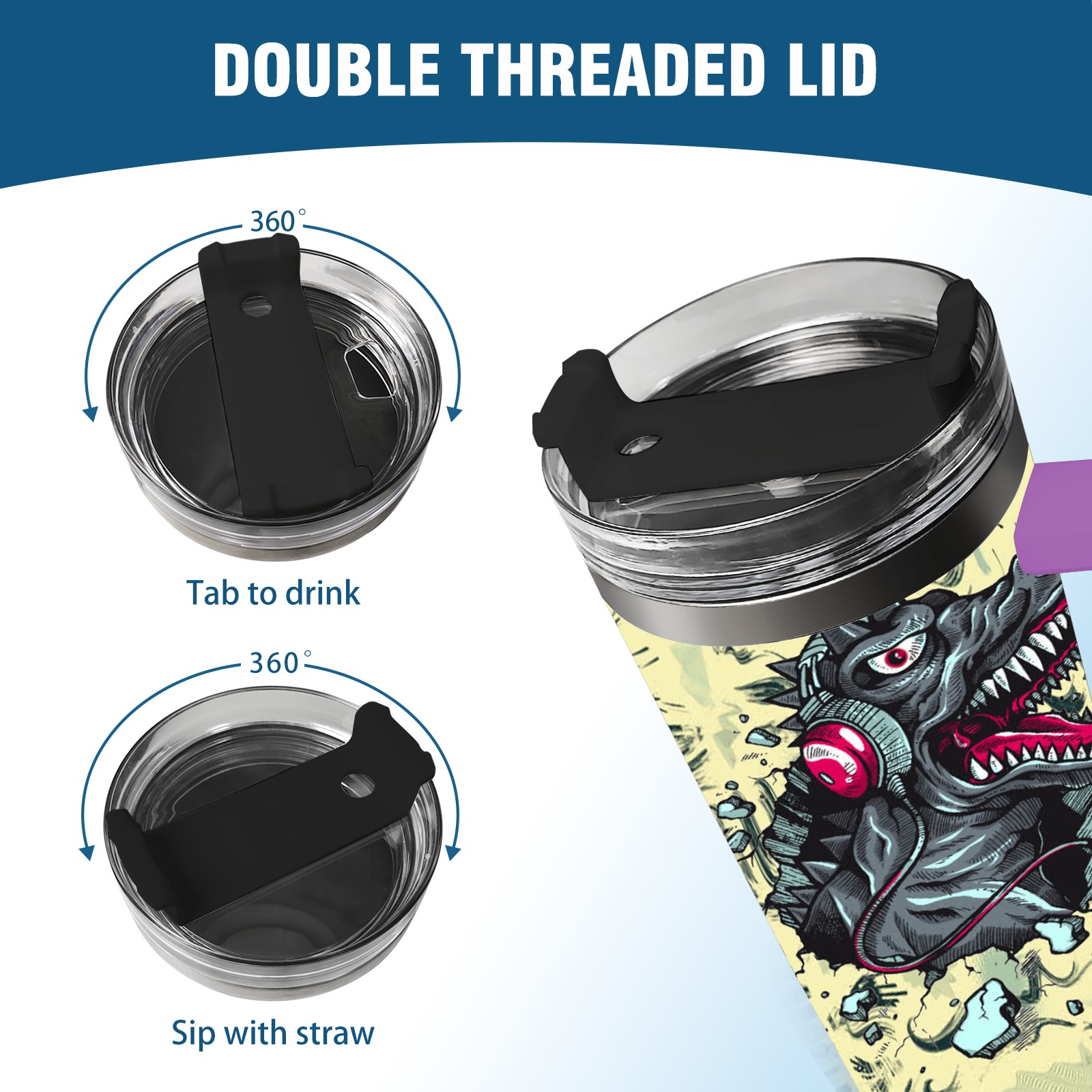 40oz 破墙小恐龙 thermos with lid and straw, leak-proof stainless steel, with handle, spill-proof bottle, convenient for travel(purple)