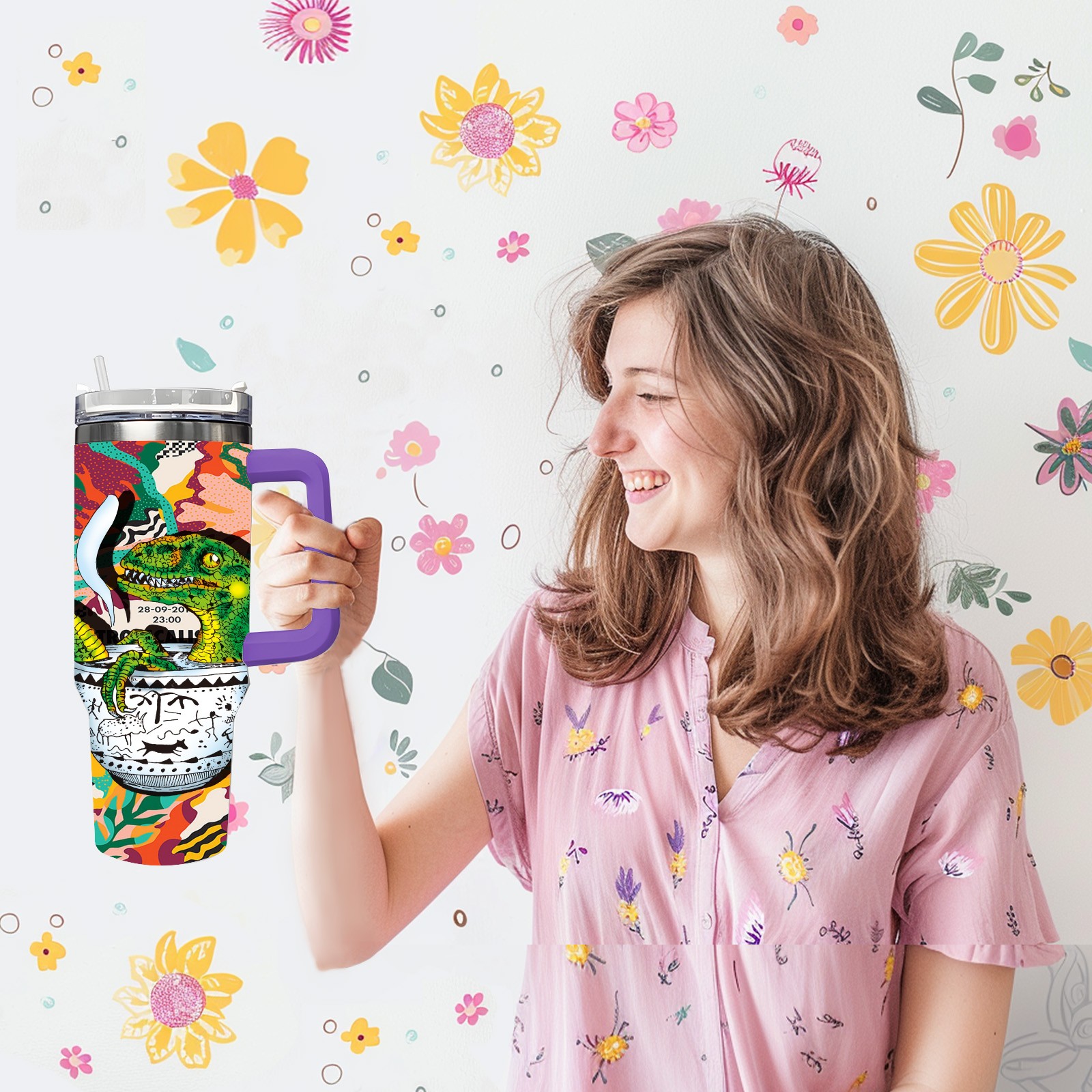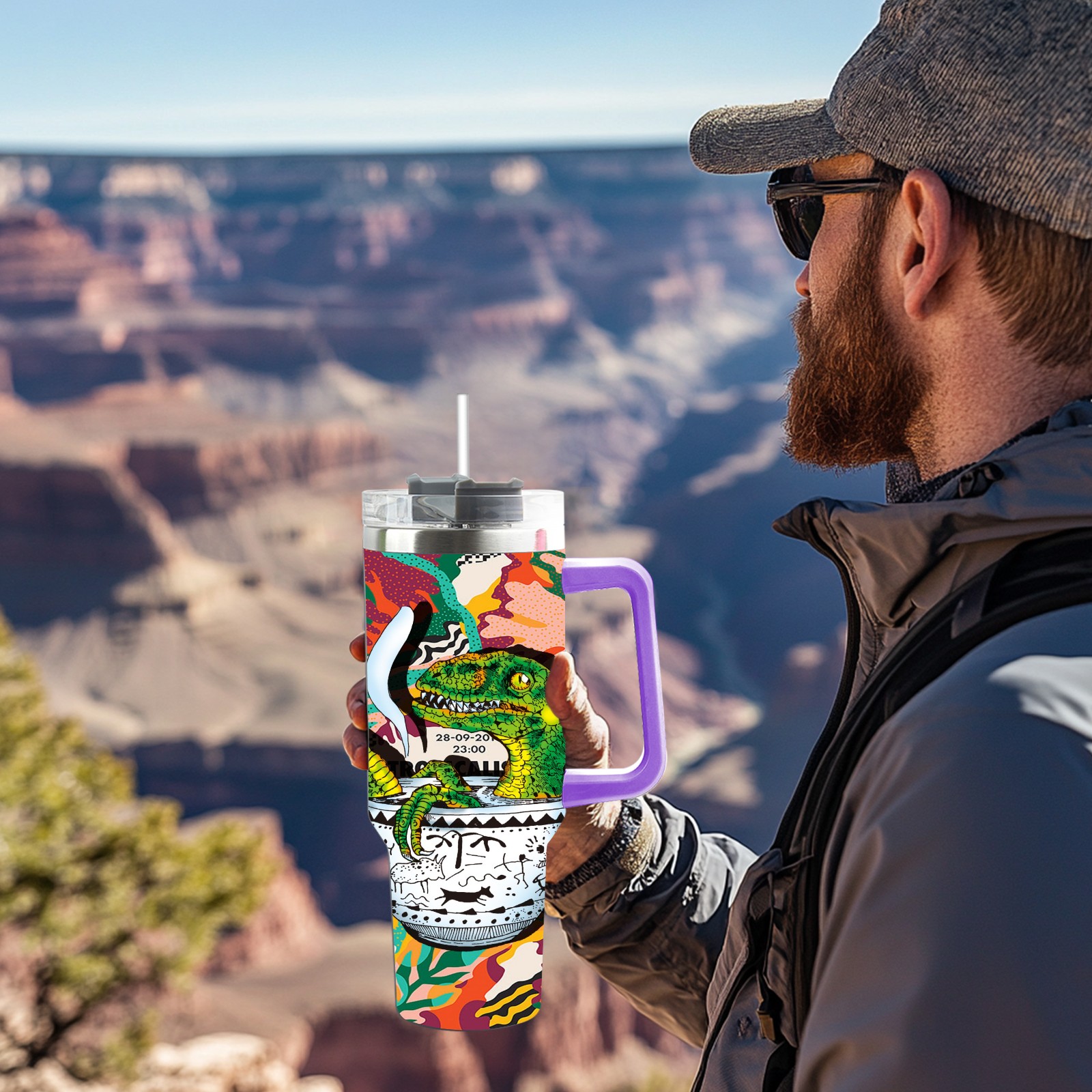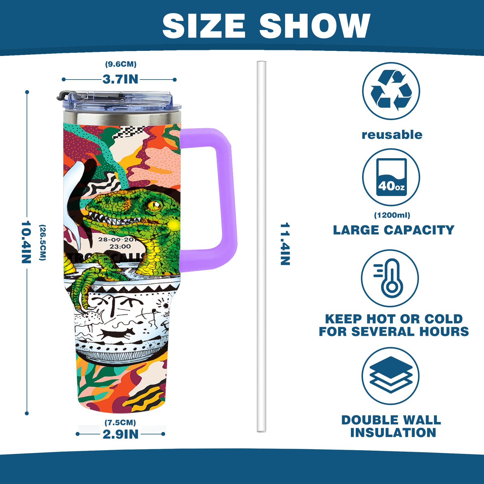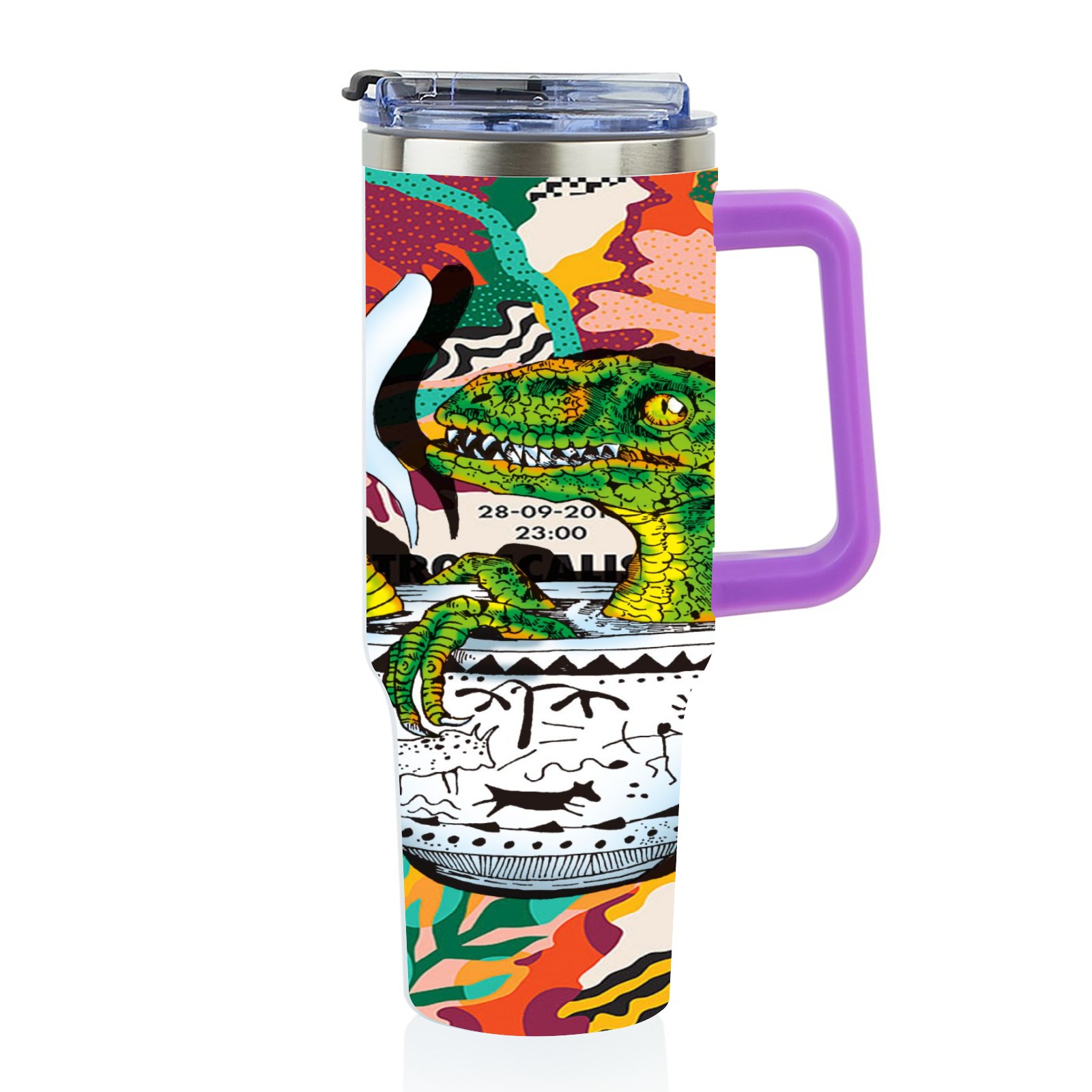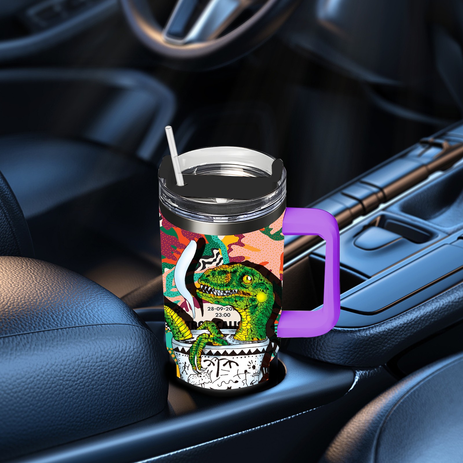 40oz 茶杯恐龙系列-迅猛龙1 thermos with lid and straw, leak-proof stainless steel, with handle, spill-proof bottle, convenient for travel(purple)
