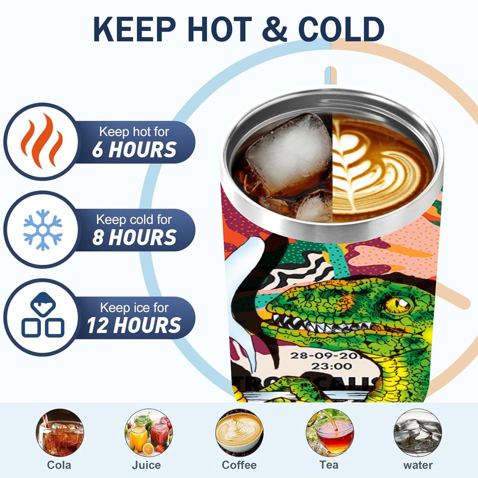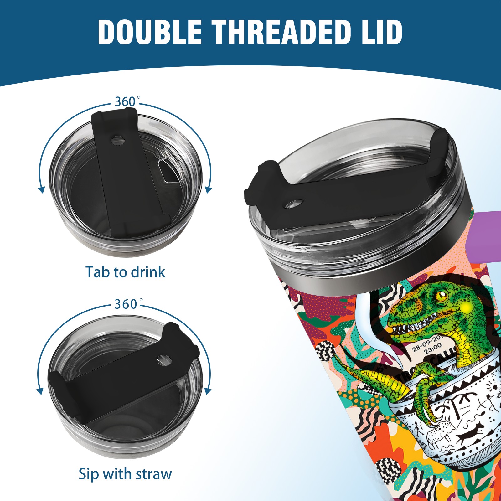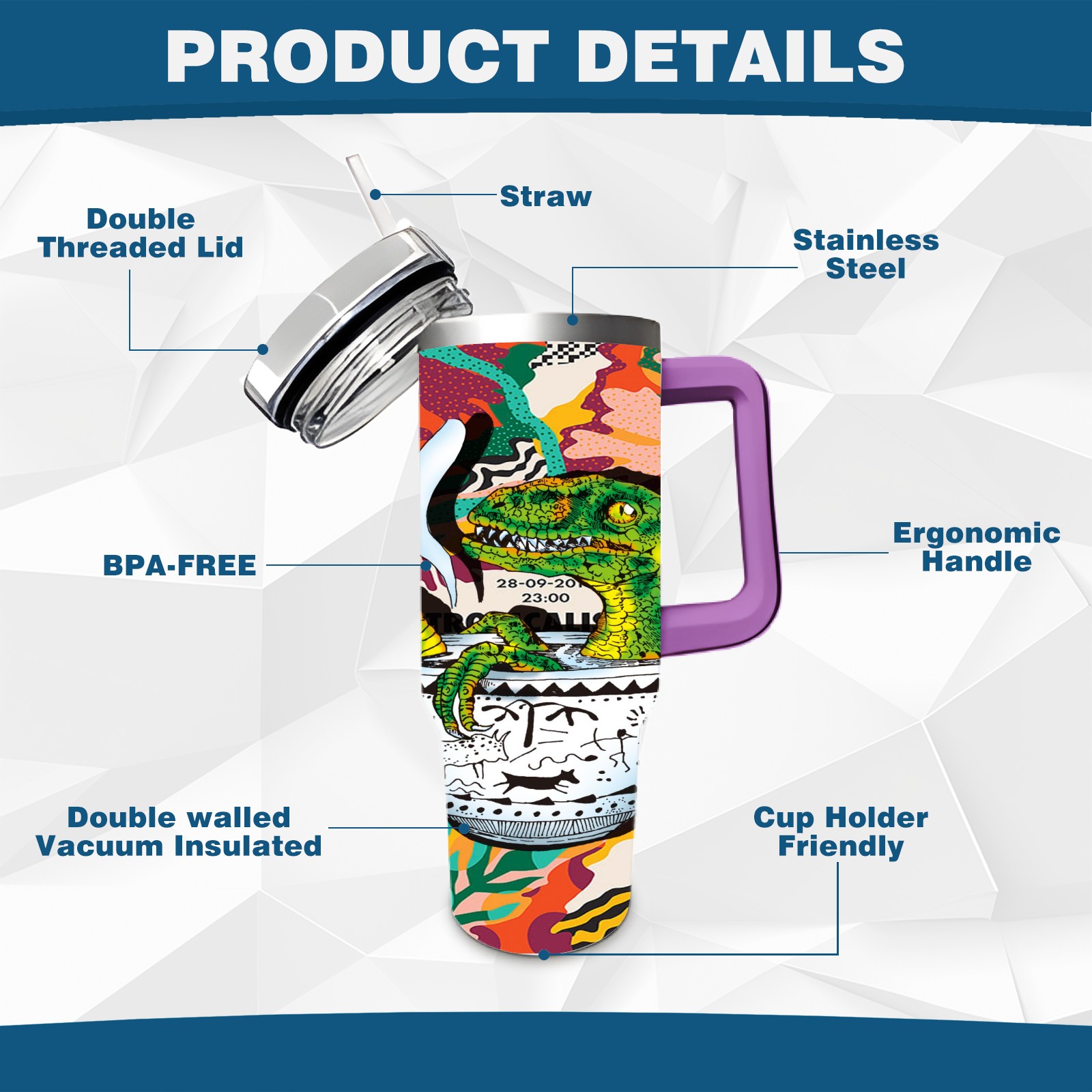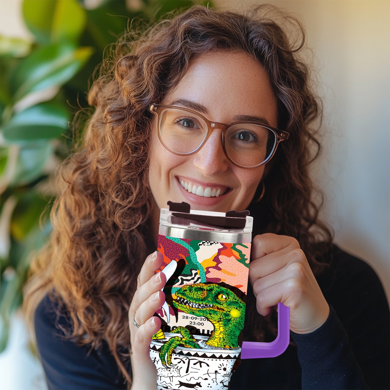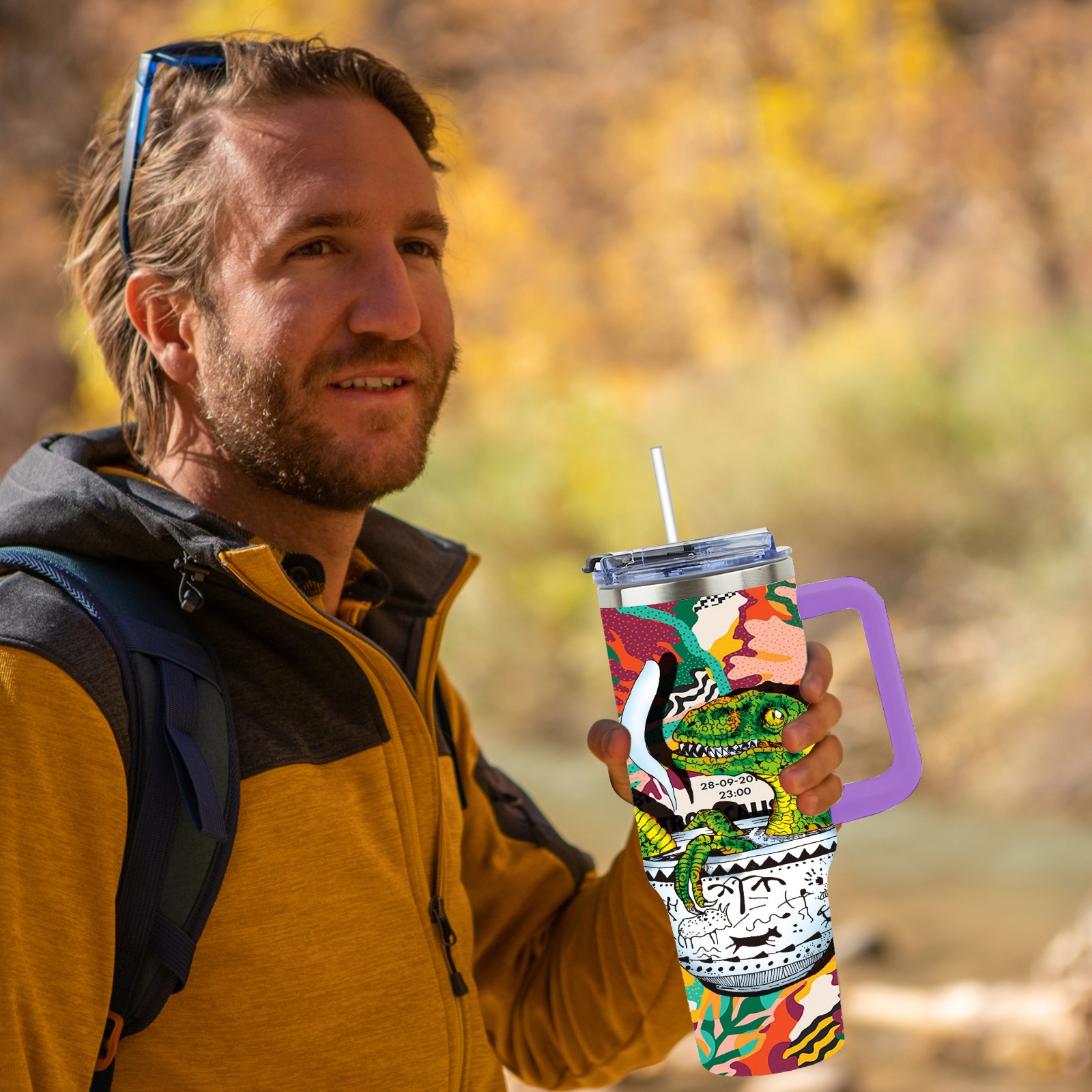 40oz 茶杯恐龙系列-迅猛龙1 thermos with lid and straw, leak-proof stainless steel, with handle, spill-proof bottle, convenient for travel(purple)