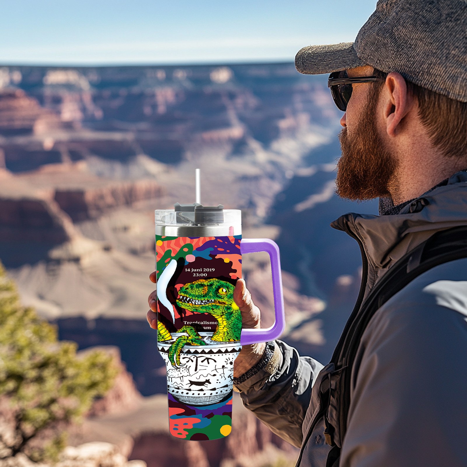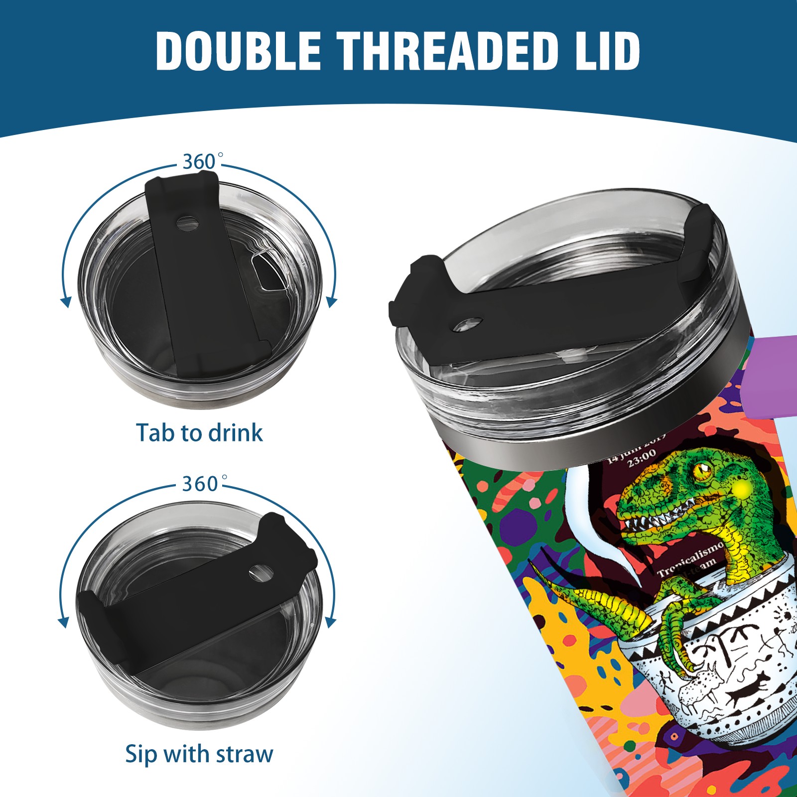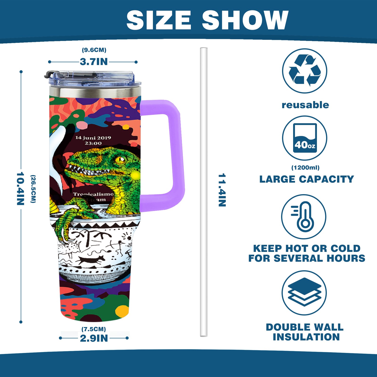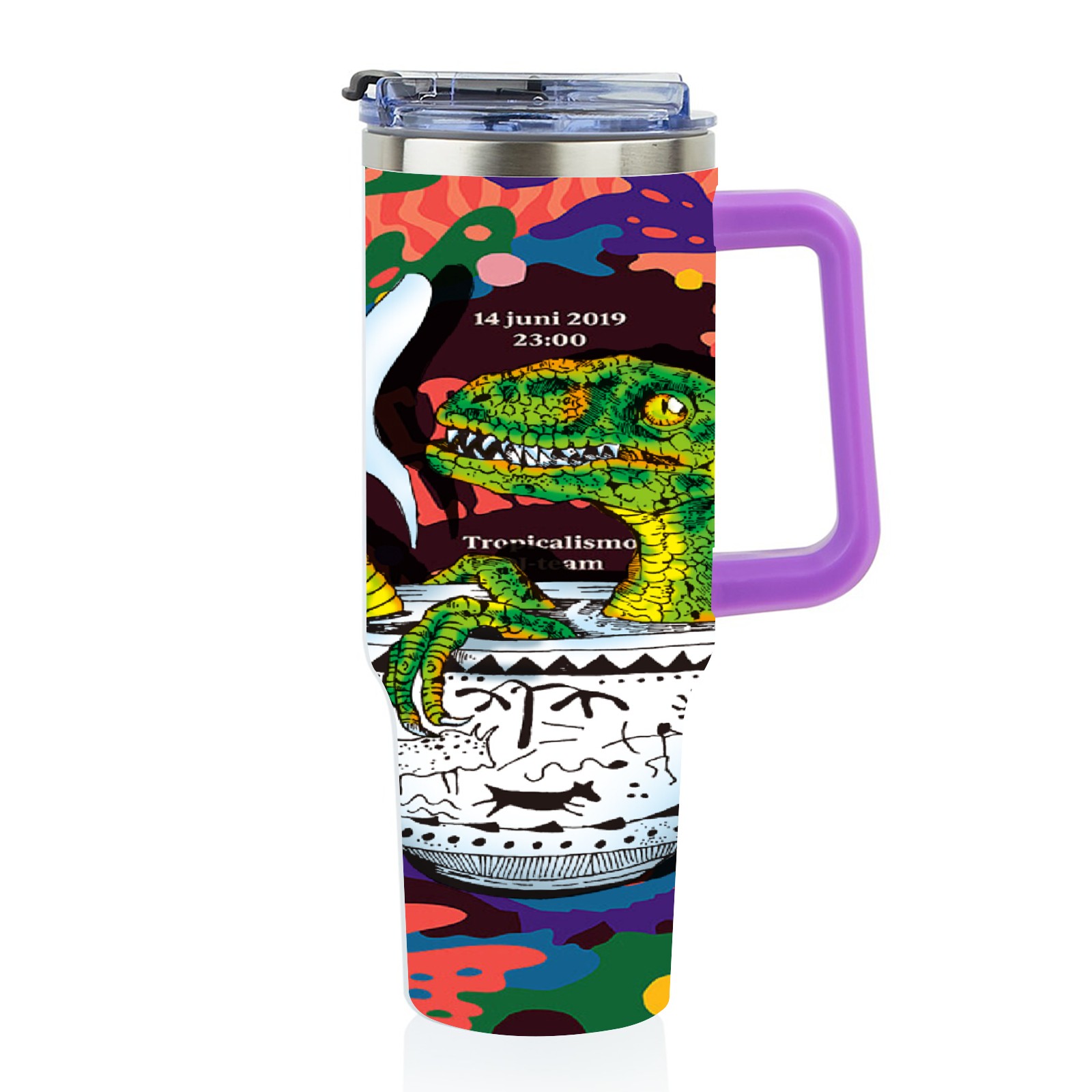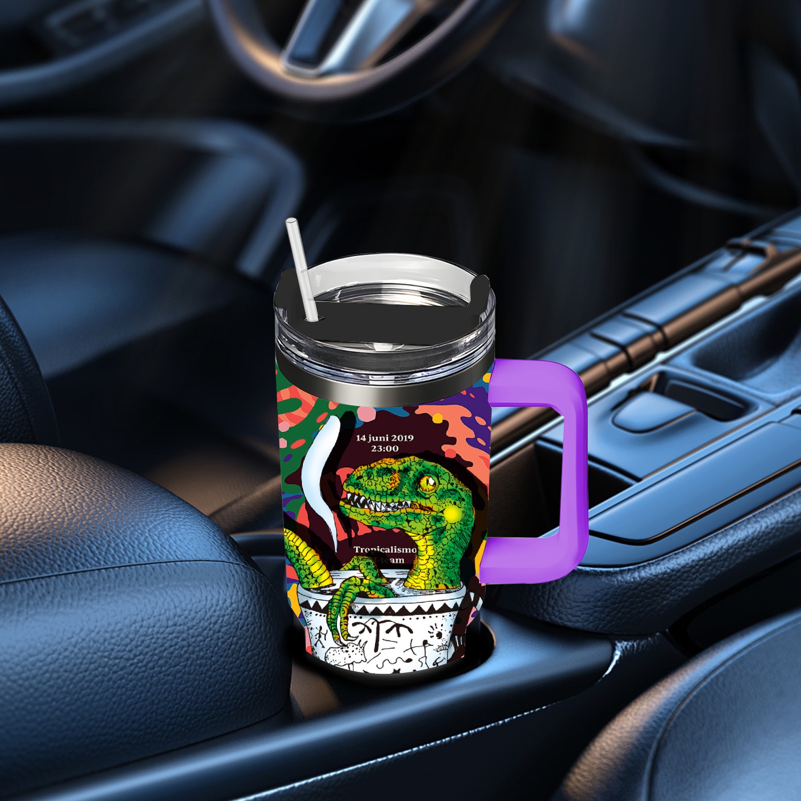 40oz 茶杯恐龙系列-迅猛龙3 thermos with lid and straw, leak-proof stainless steel, with handle, spill-proof bottle, convenient for travel(purple)
