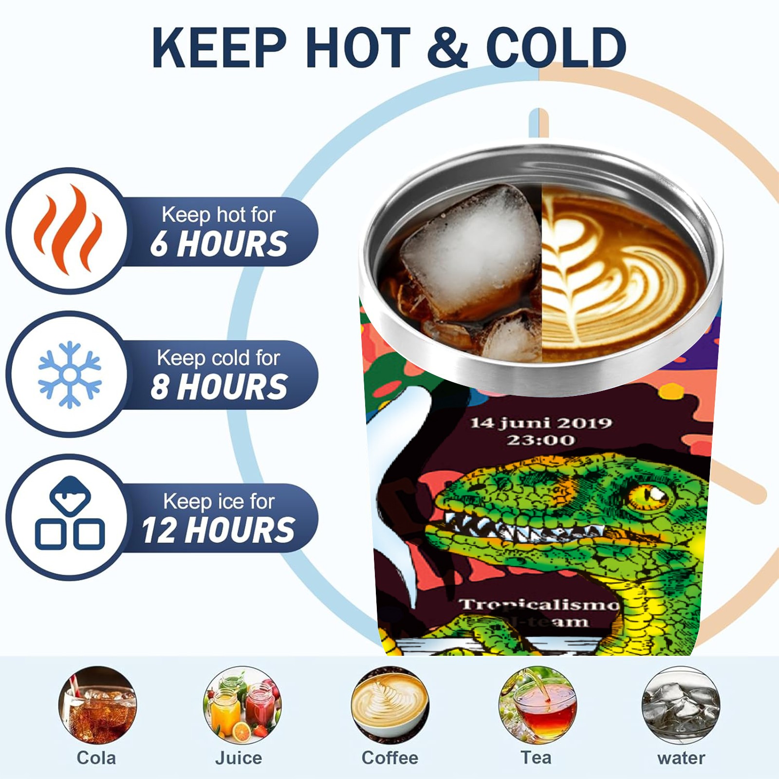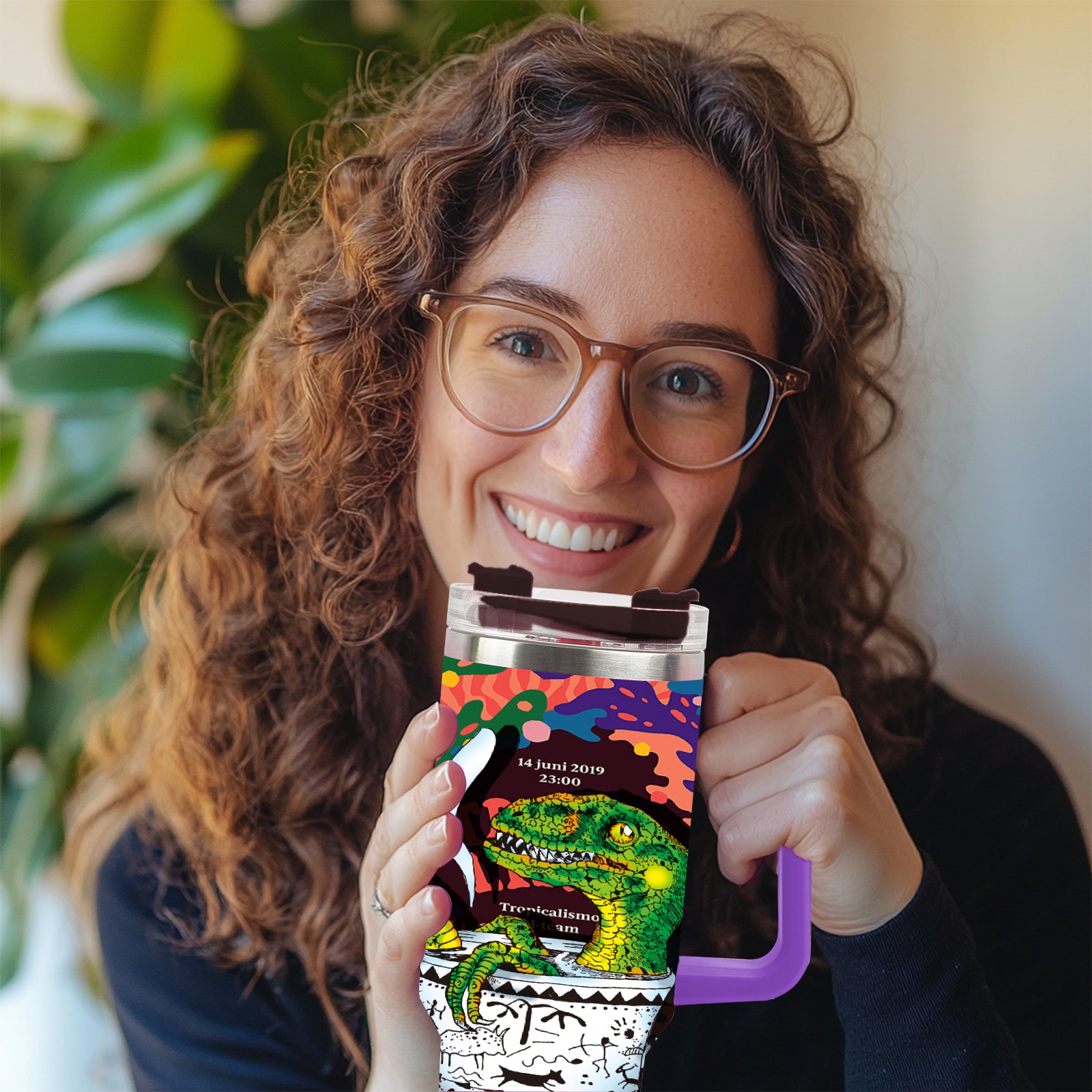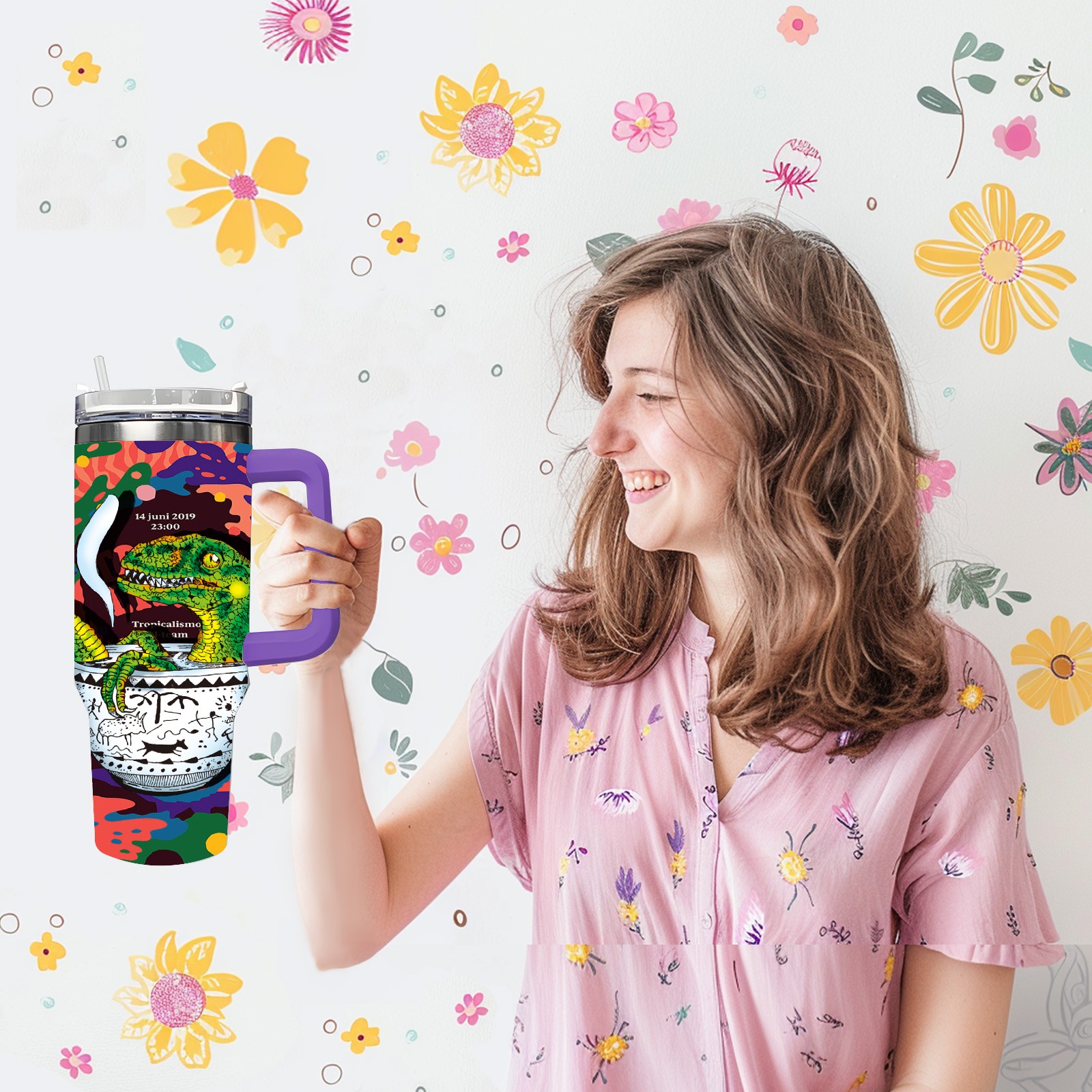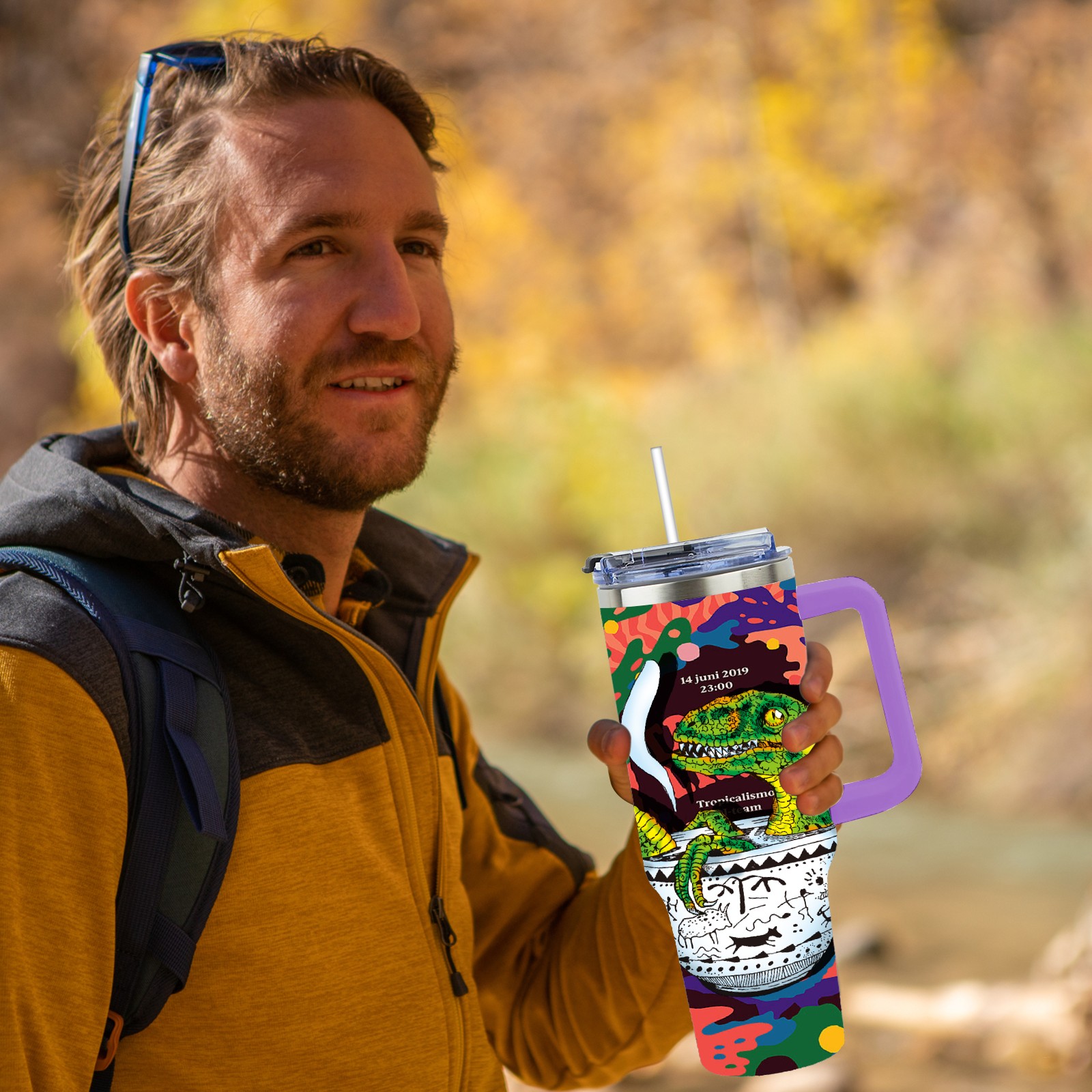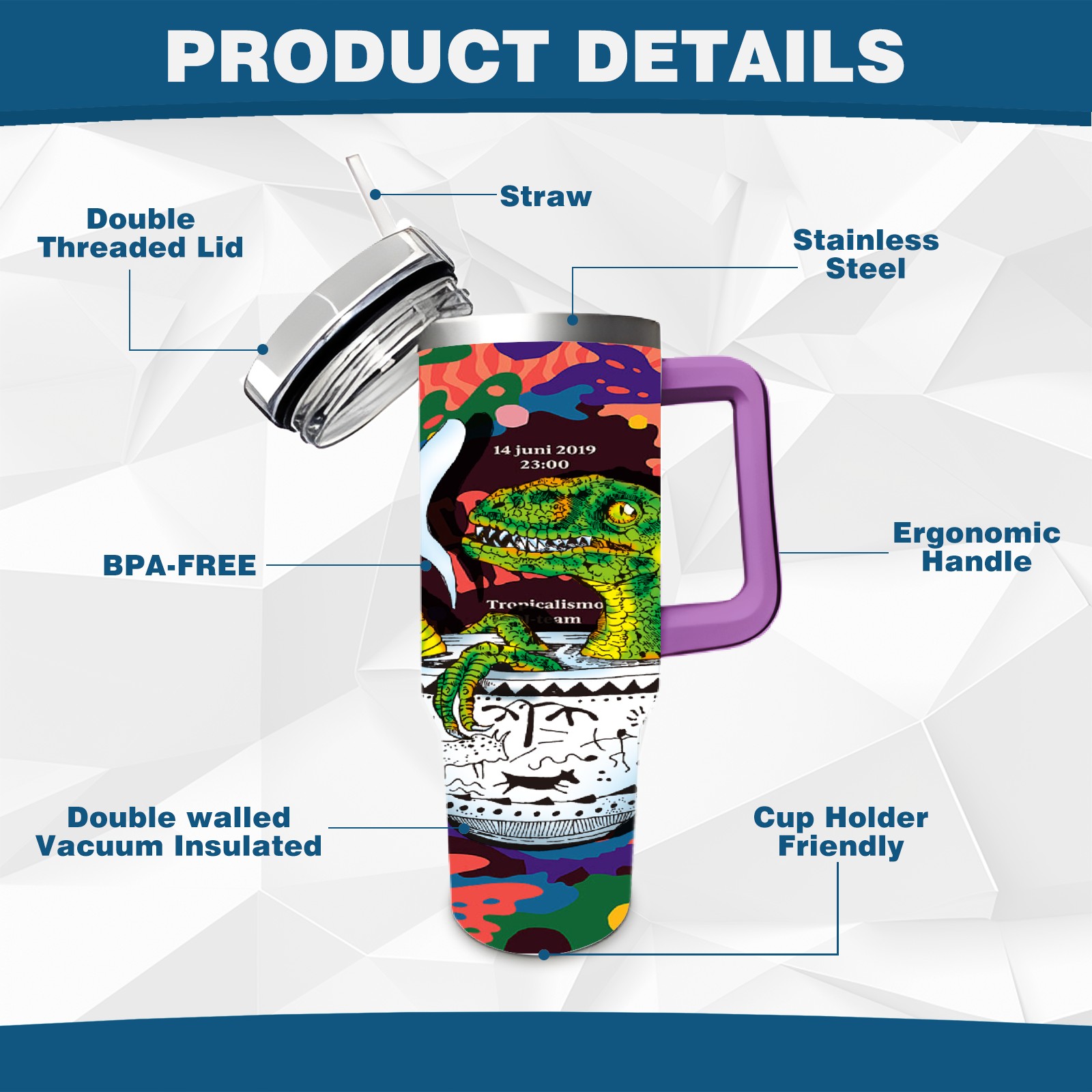 40oz 茶杯恐龙系列-迅猛龙3 thermos with lid and straw, leak-proof stainless steel, with handle, spill-proof bottle, convenient for travel(purple)