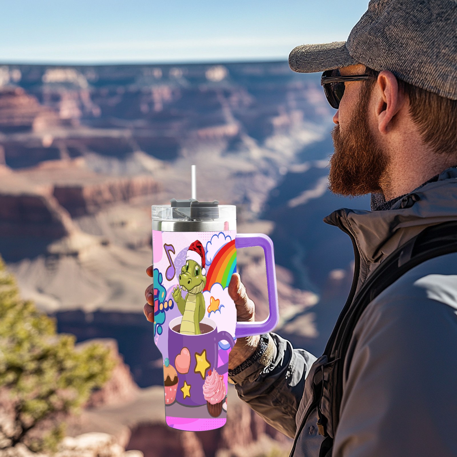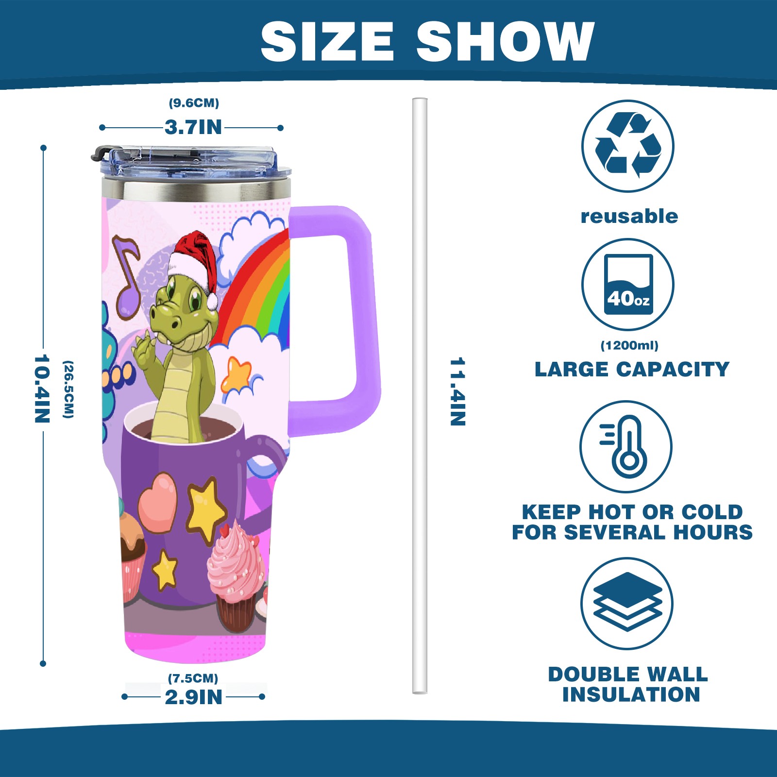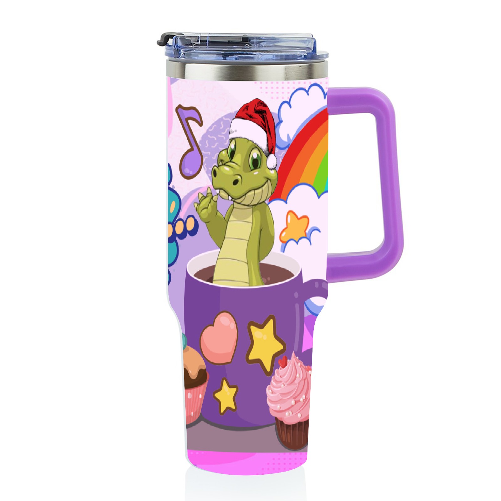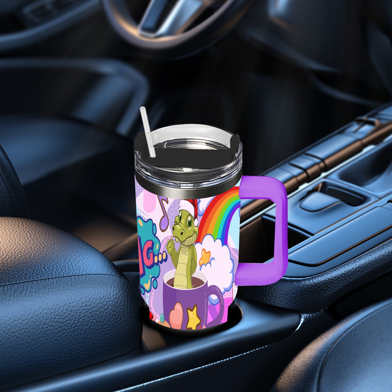 40oz 茶杯恐龙2 thermos with lid and straw, leak-proof stainless steel, with handle, spill-proof bottle, convenient for travel(purple)