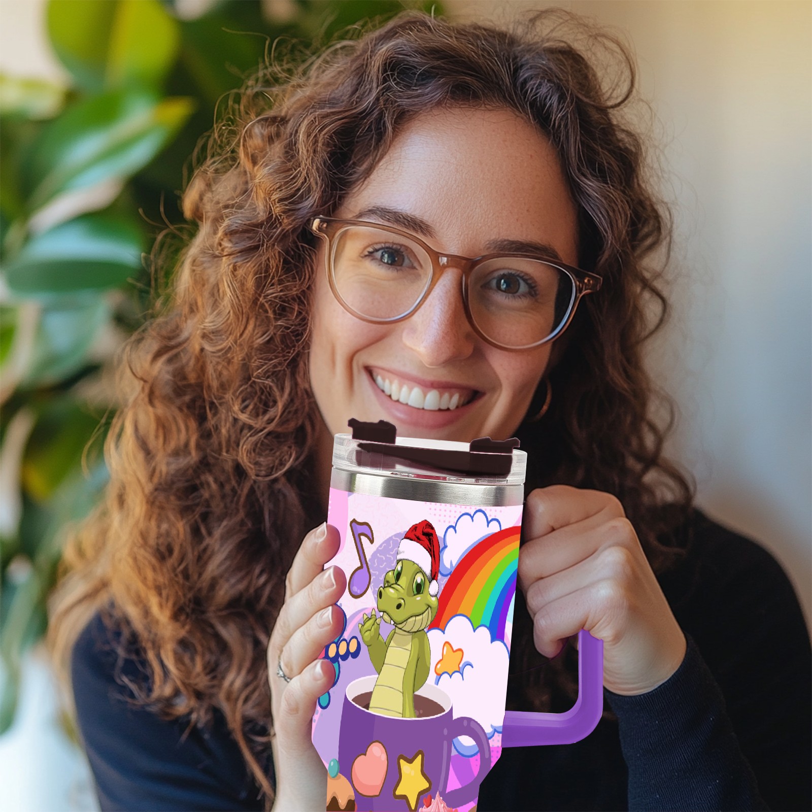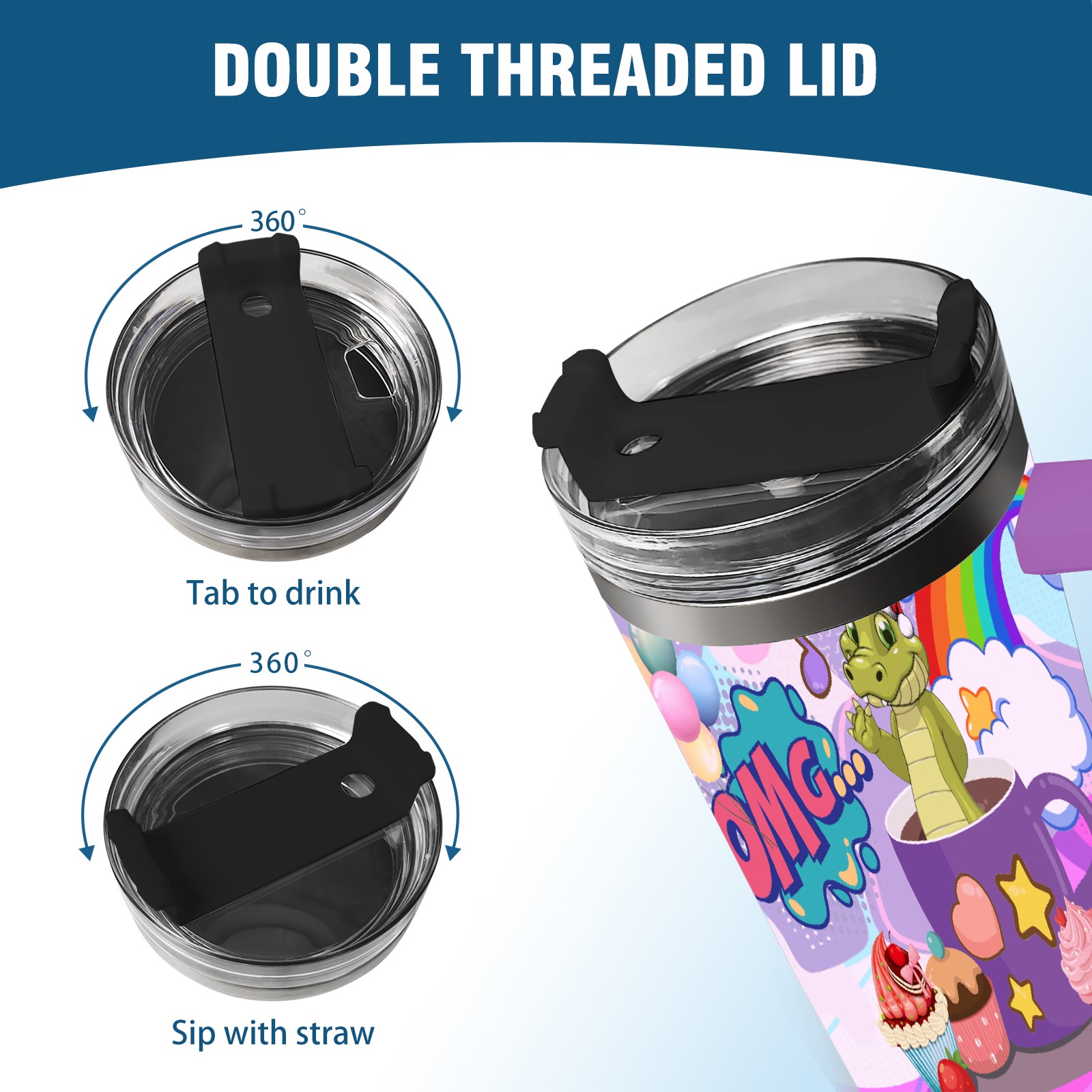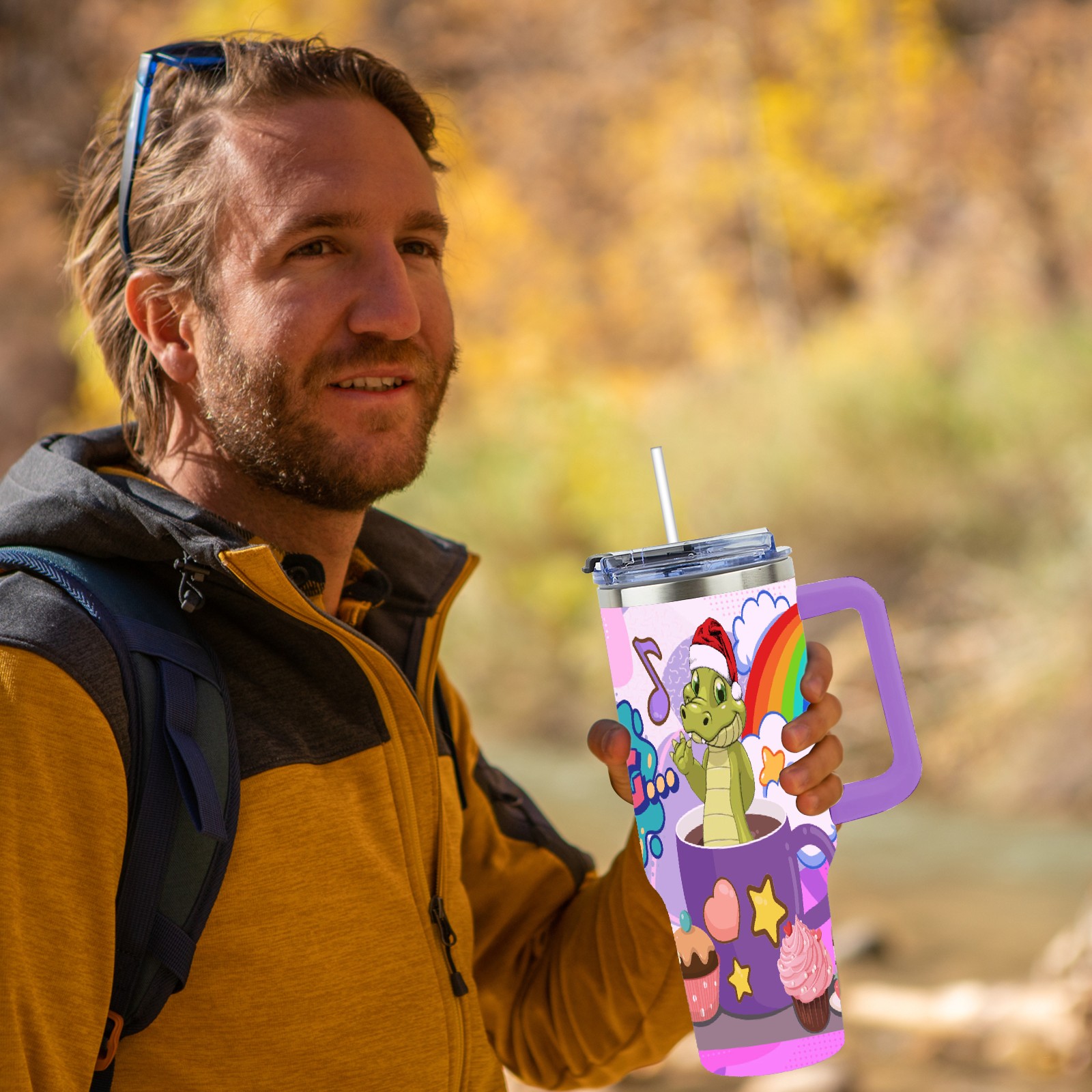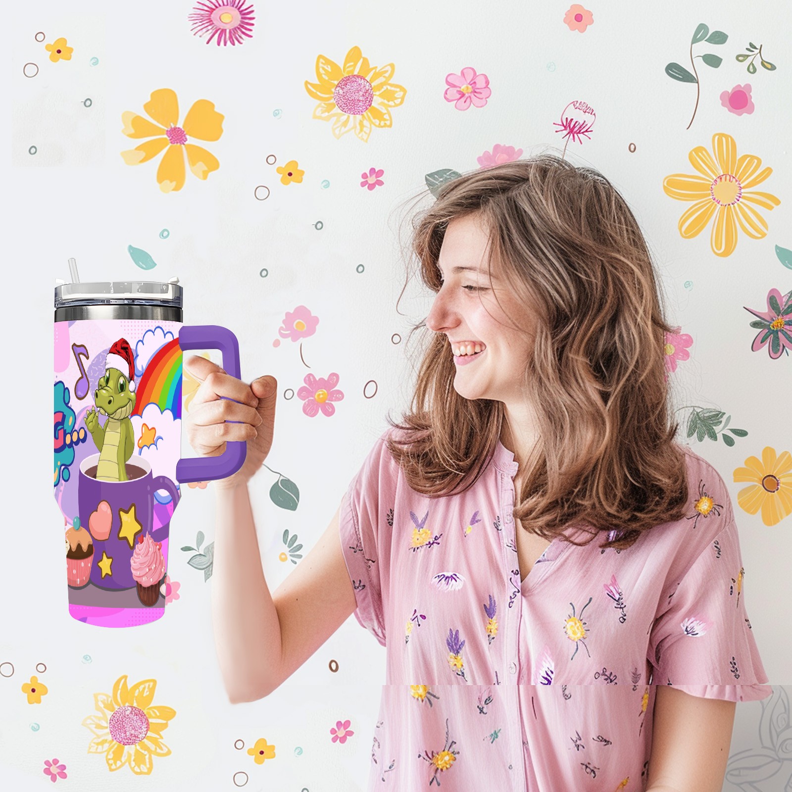 40oz 茶杯恐龙2 thermos with lid and straw, leak-proof stainless steel, with handle, spill-proof bottle, convenient for travel(purple)