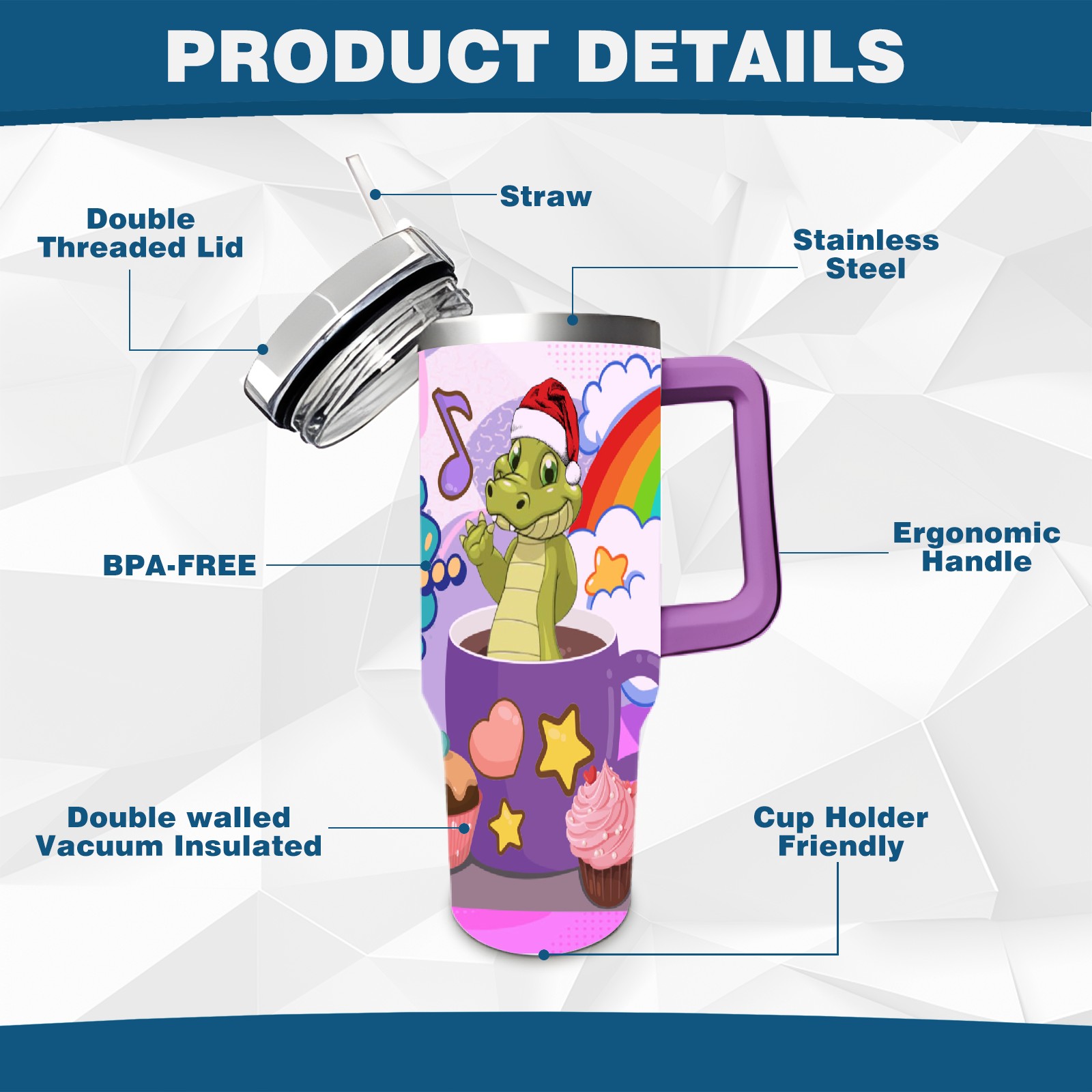 • <p>This multi-functional insulated water bottle features a simple and practical design, suitable for various daily scenarios. The ergonomic handle allows for easy one-handed drinking, and the detachable handle can be adjusted or removed as needed, making it convenient for commuting, exercising, or carrying to meetings. Made of high-quality stainless steel, it is BPA-free and features double-walled vacuum insulation technology that keeps drinks cold for 8 hours and hot for 6 hours, ensuring you can enjoy your beverage at the perfect temperature anytime, anywhere. The 40-ounce Christmas edition comes with a sliding lid, silicone straw, and a non-slip design. Accessories are dishwasher safe, and the narrow bottom and wide mouth design perfectly fits car cup holders. The exclusive flip-top straw lid is environmentally friendly and durable, with a one-touch leak-proof closure and two drinking modes: sip and gulp. A dust cover provides effective protection. This bottle is suitable for travel, office work, sports, camping, and other occasions, making it a thoughtful gift for friends and family.</p>