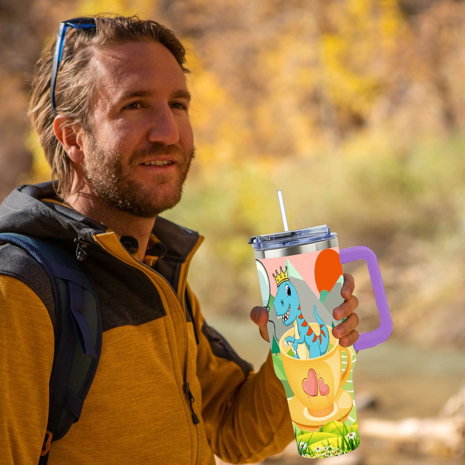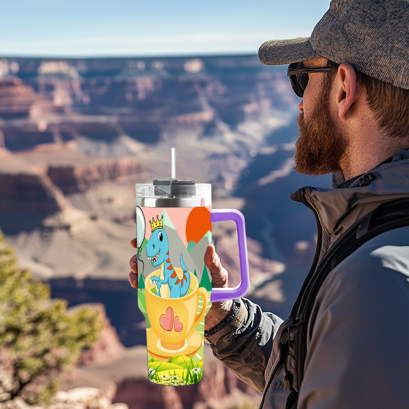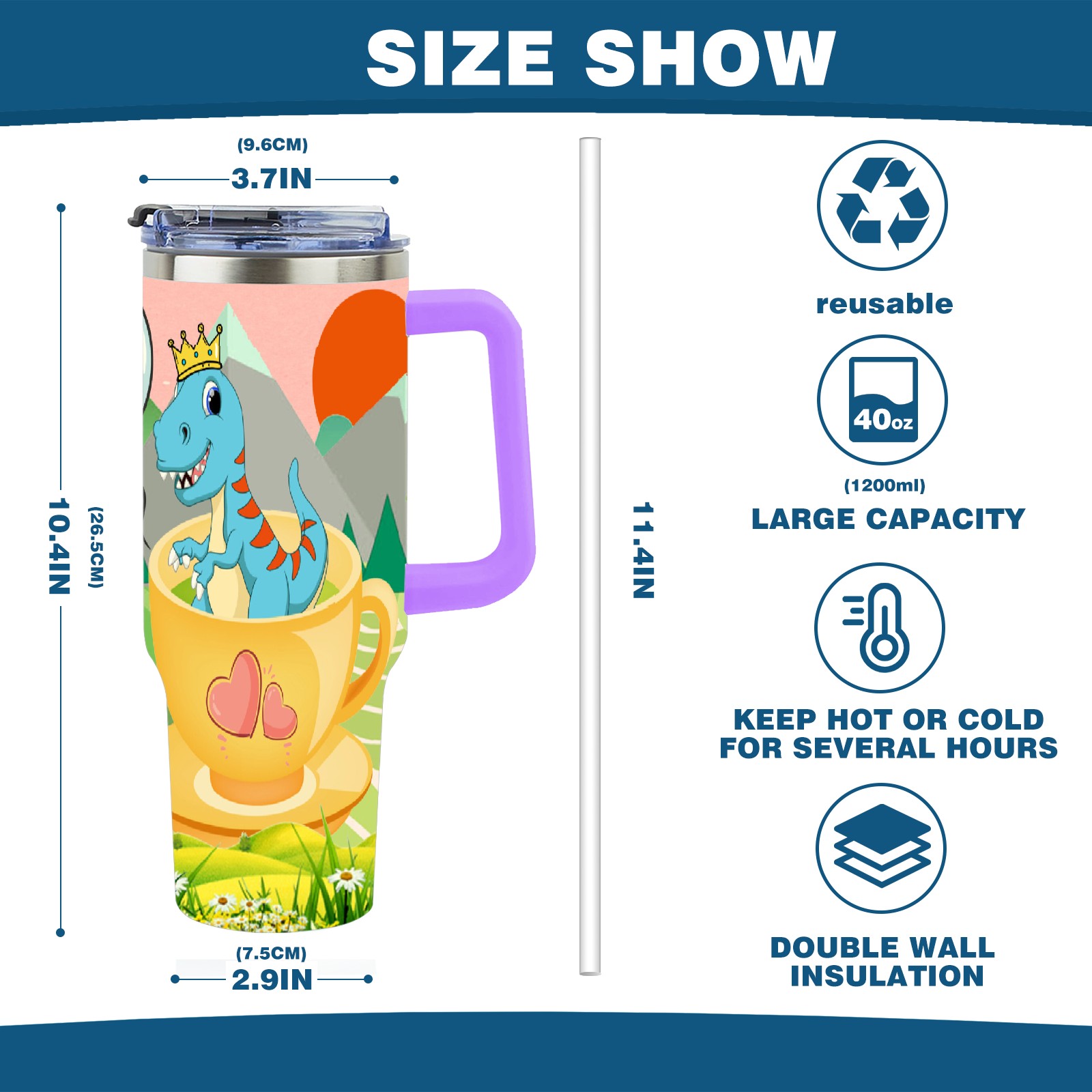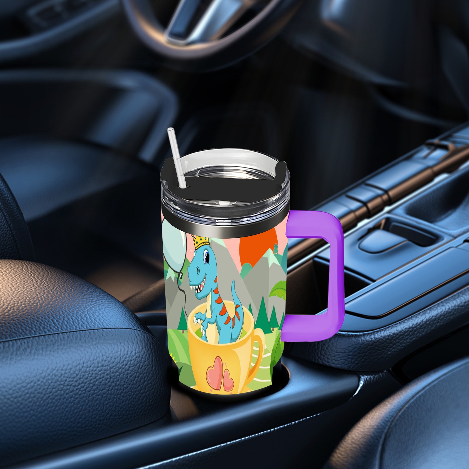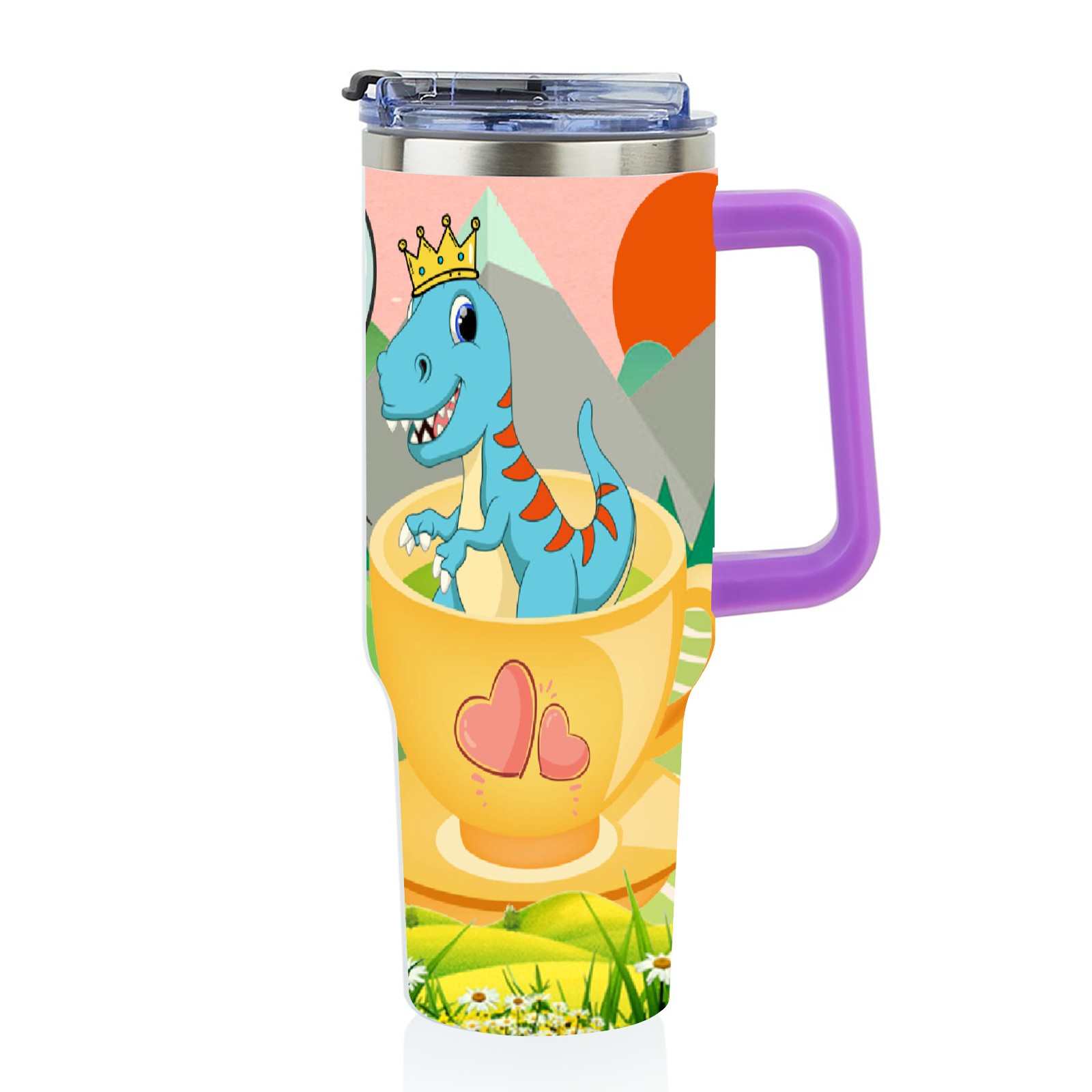 40oz 茶杯恐龙1 thermos with lid and straw, leak-proof stainless steel, with handle, spill-proof bottle, convenient for travel(purple)