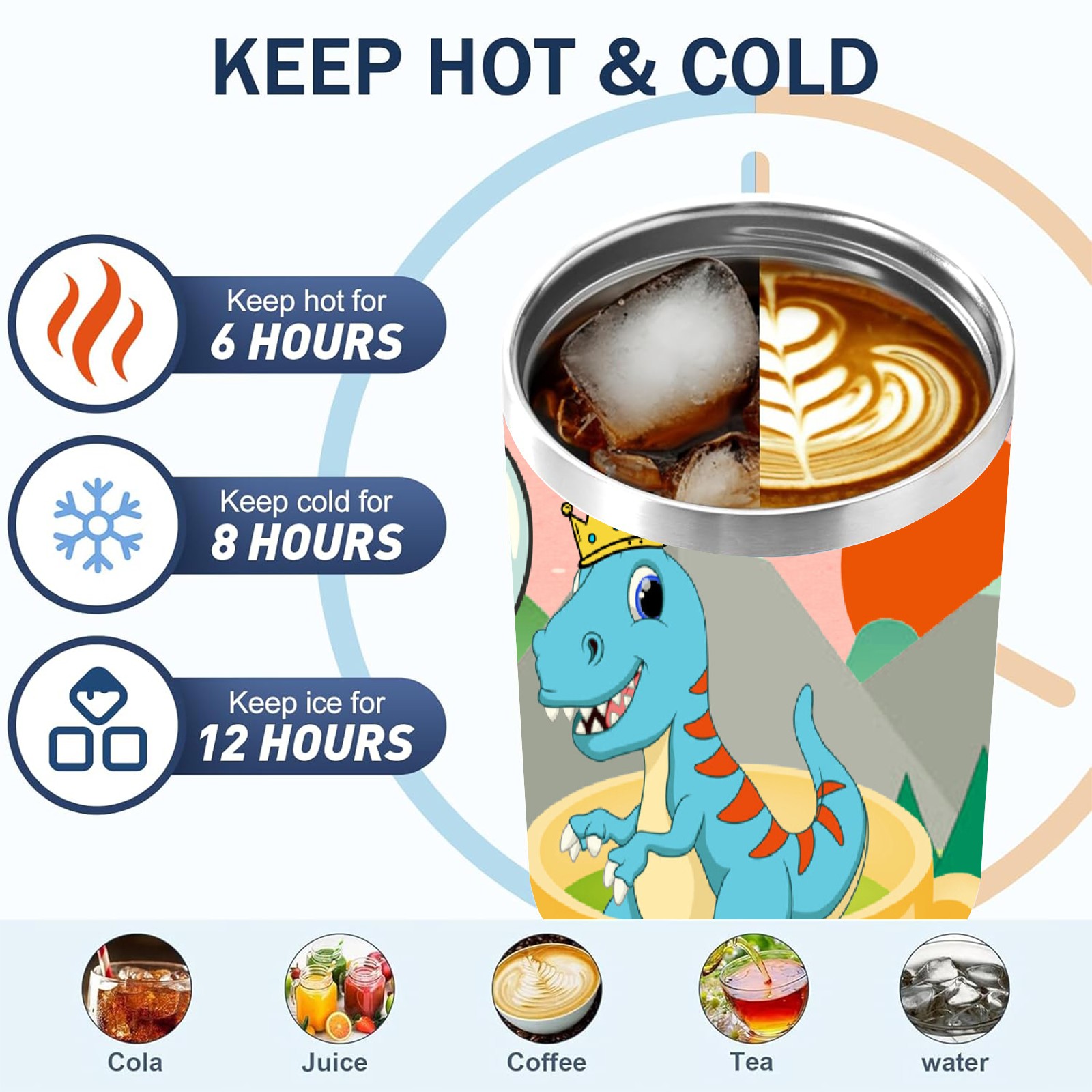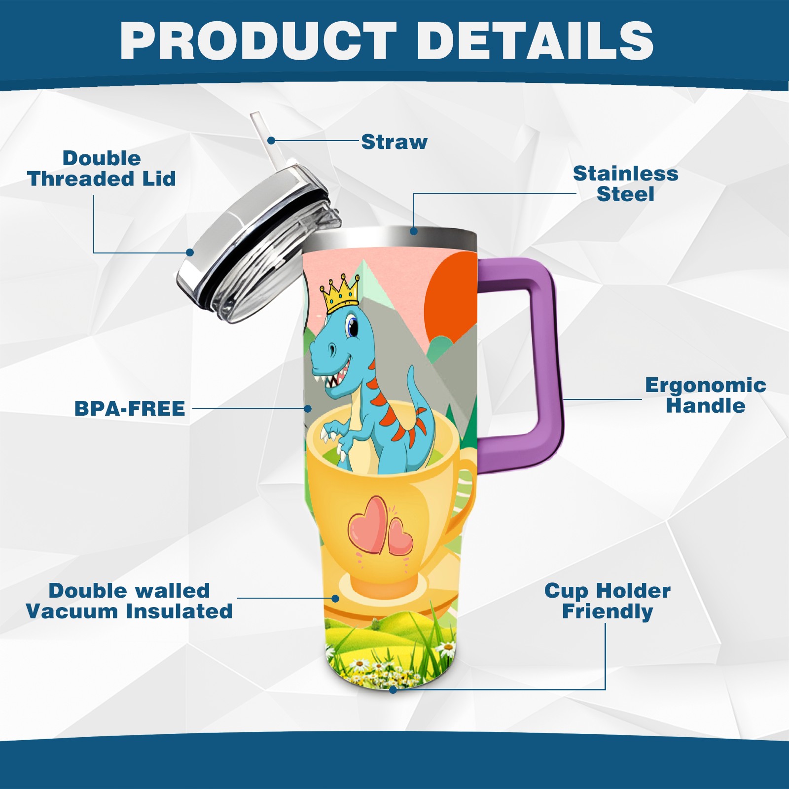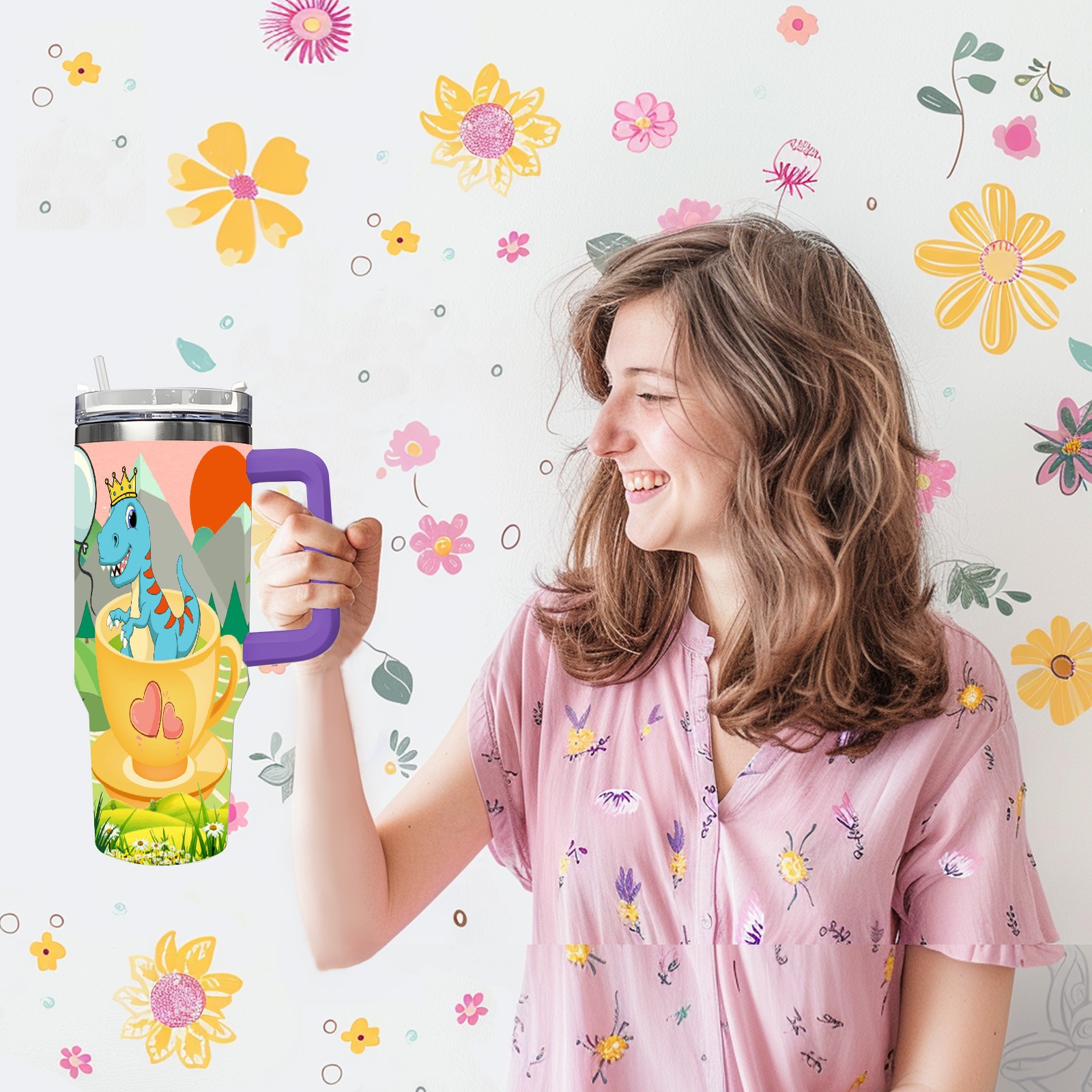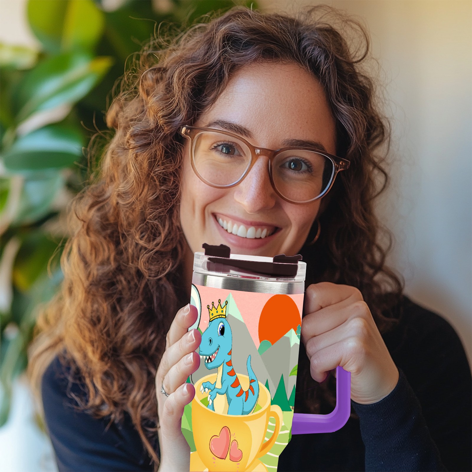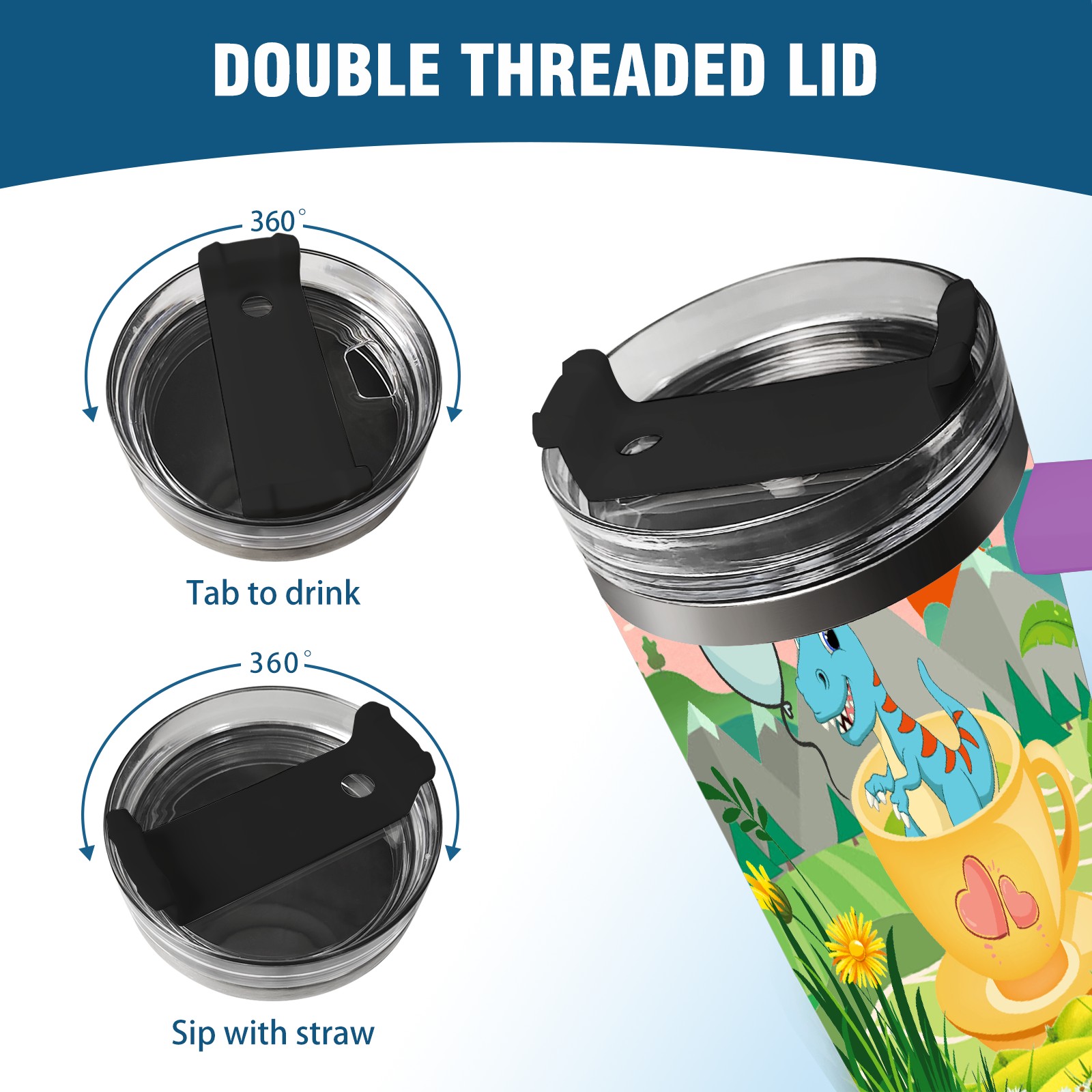 40oz 茶杯恐龙1 thermos with lid and straw, leak-proof stainless steel, with handle, spill-proof bottle, convenient for travel(purple)