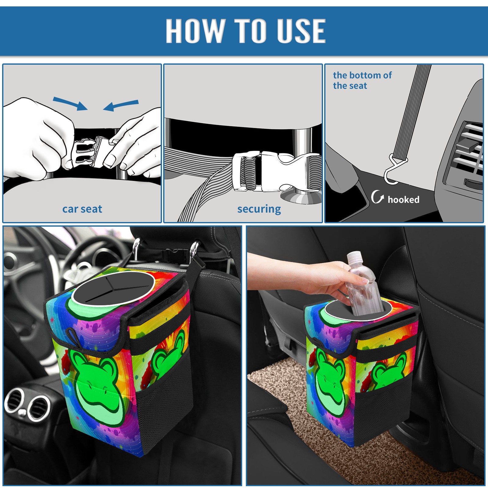 • <p>Keep your car neat with this practical car trash can—built for durability, versatility, and on-the-go convenience! Crafted from quality twill fabric with a waterproof lining, it prevents leaks, keeping seats/floors clean. Clean easily: empty directly or secure a disposable bag with side clips. Adjustable pull cord fits floor, seat, or headrest. 9.5x6.3x6.7 inches, ample space for daily trash, folds flat for storage. More than a trash can, it doubles as a storage bag for cups, toys, docs, and small gadgets—must-have car interior accessory. Installs in seconds on seats, console, or gear shift; adjustable straps keep it stable, no slipping on bumpy roads. Perfect gift for new car owners!</p>