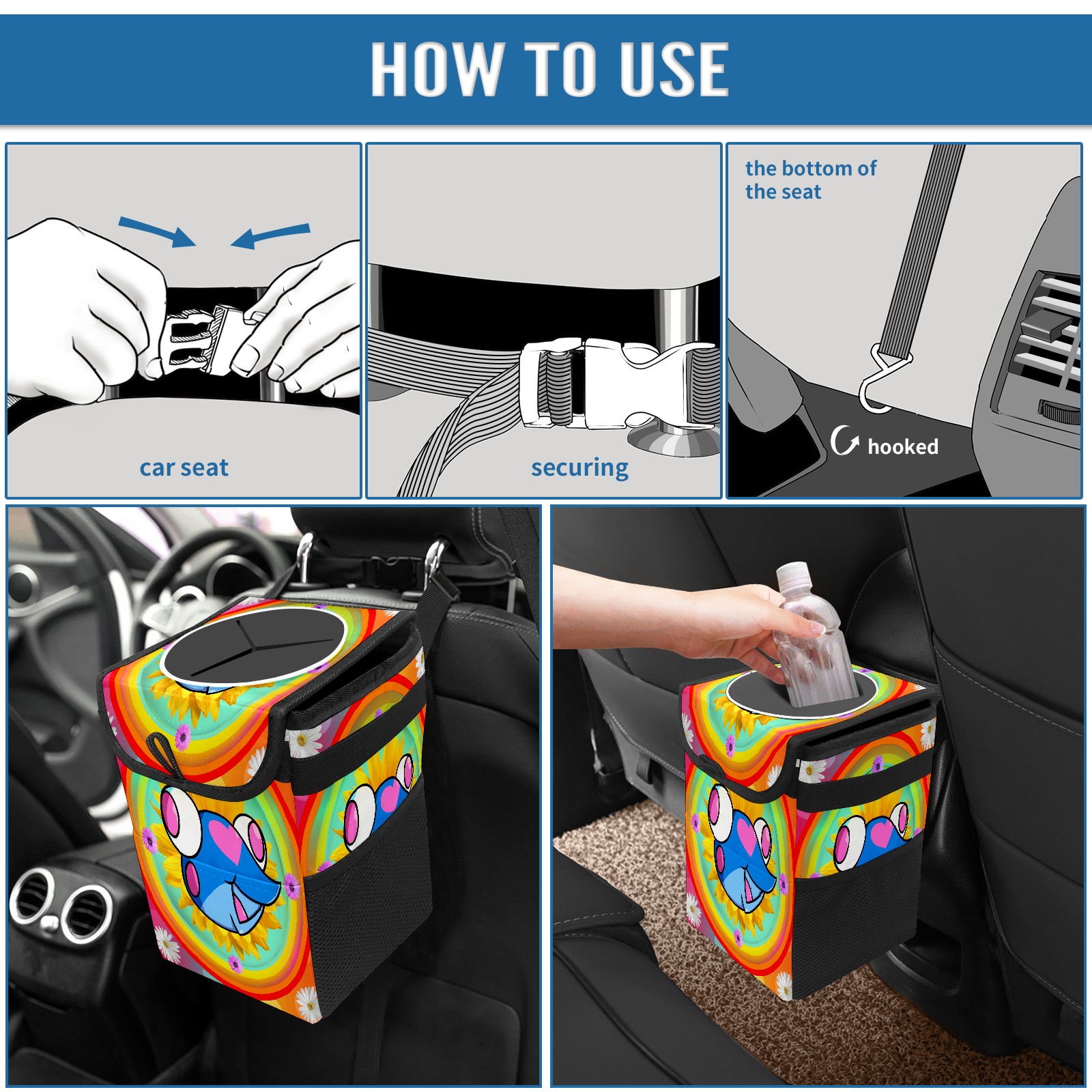 • <p>Keep your car neat with this practical car trash can—built for durability, versatility, and on-the-go convenience! Crafted from quality twill fabric with a waterproof lining, it prevents leaks, keeping seats/floors clean. Clean easily: empty directly or secure a disposable bag with side clips. Adjustable pull cord fits floor, seat, or headrest. 9.5x6.3x6.7 inches, ample space for daily trash, folds flat for storage. More than a trash can, it doubles as a storage bag for cups, toys, docs, and small gadgets—must-have car interior accessory. Installs in seconds on seats, console, or gear shift; adjustable straps keep it stable, no slipping on bumpy roads. Perfect gift for new car owners!</p>