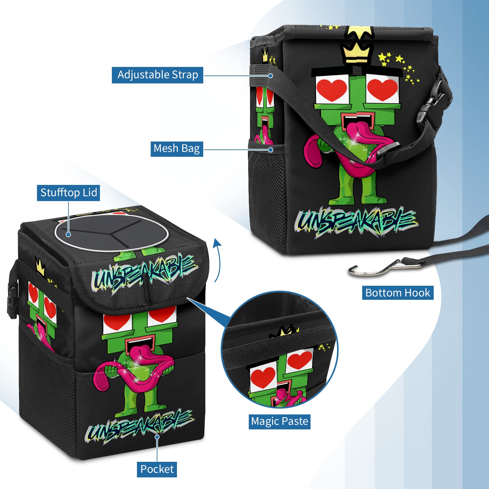 • <p>Keep your car neat with this practical car trash can—built for durability, versatility, and on-the-go convenience! Crafted from quality twill fabric with a waterproof lining, it prevents leaks, keeping seats/floors clean. Clean easily: empty directly or secure a disposable bag with side clips. Adjustable pull cord fits floor, seat, or headrest. 9.5x6.3x6.7 inches, ample space for daily trash, folds flat for storage. More than a trash can, it doubles as a storage bag for cups, toys, docs, and small gadgets—must-have car interior accessory. Installs in seconds on seats, console, or gear shift; adjustable straps keep it stable, no slipping on bumpy roads. Perfect gift for new car owners!</p>