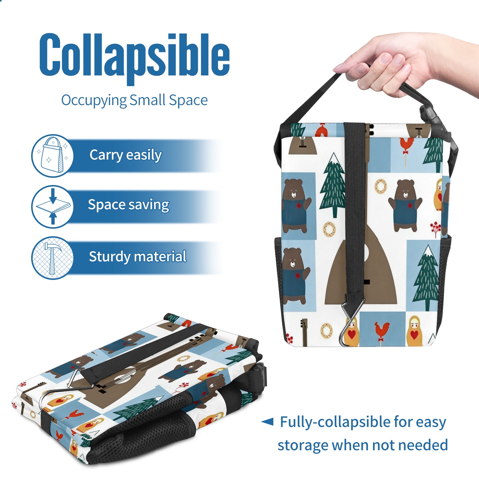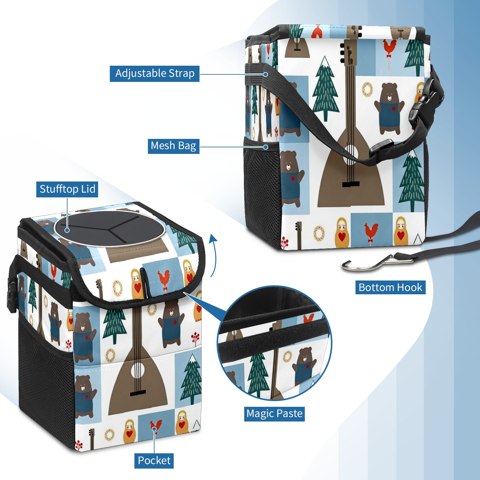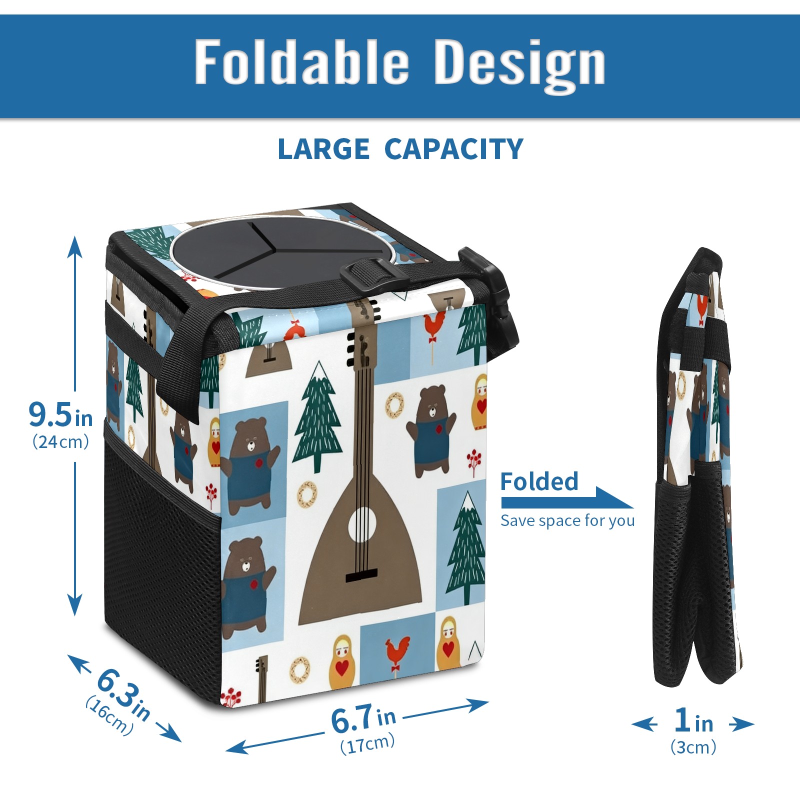 <p><strong> Keep Your Car Spotless!</strong></p><p>Our small, collapsible car trash can is the ultimate solution for a clutter-free ride. With a secure lid, multiple pockets, and stable hanging design, it's a must-have accessory.</p><p><strong>Key Features</strong></p><ul><li><strong>Odor Control:</strong> Rubber-sealed lid traps smells; works with standard trash bags.</li><li><strong>Extra Storage:</strong> Mesh pockets and front pouch keep essentials handy.</li><li><strong>Secure Fit:</strong> Strap and hooks ensure it stays in place on any surface.</li><li><strong>Space-Saving:</strong> Fold flat when not in use to maximize storage.</li><li><strong>Stylish &amp; Durable:</strong> Full-print twill fabric is built to last.</li></ul><p><strong>Specs</strong></p><p>Size: 24*17*16cm | Material: Twill Weave + Webbing | Care: Hand wash, avoid sun exposure.</p>