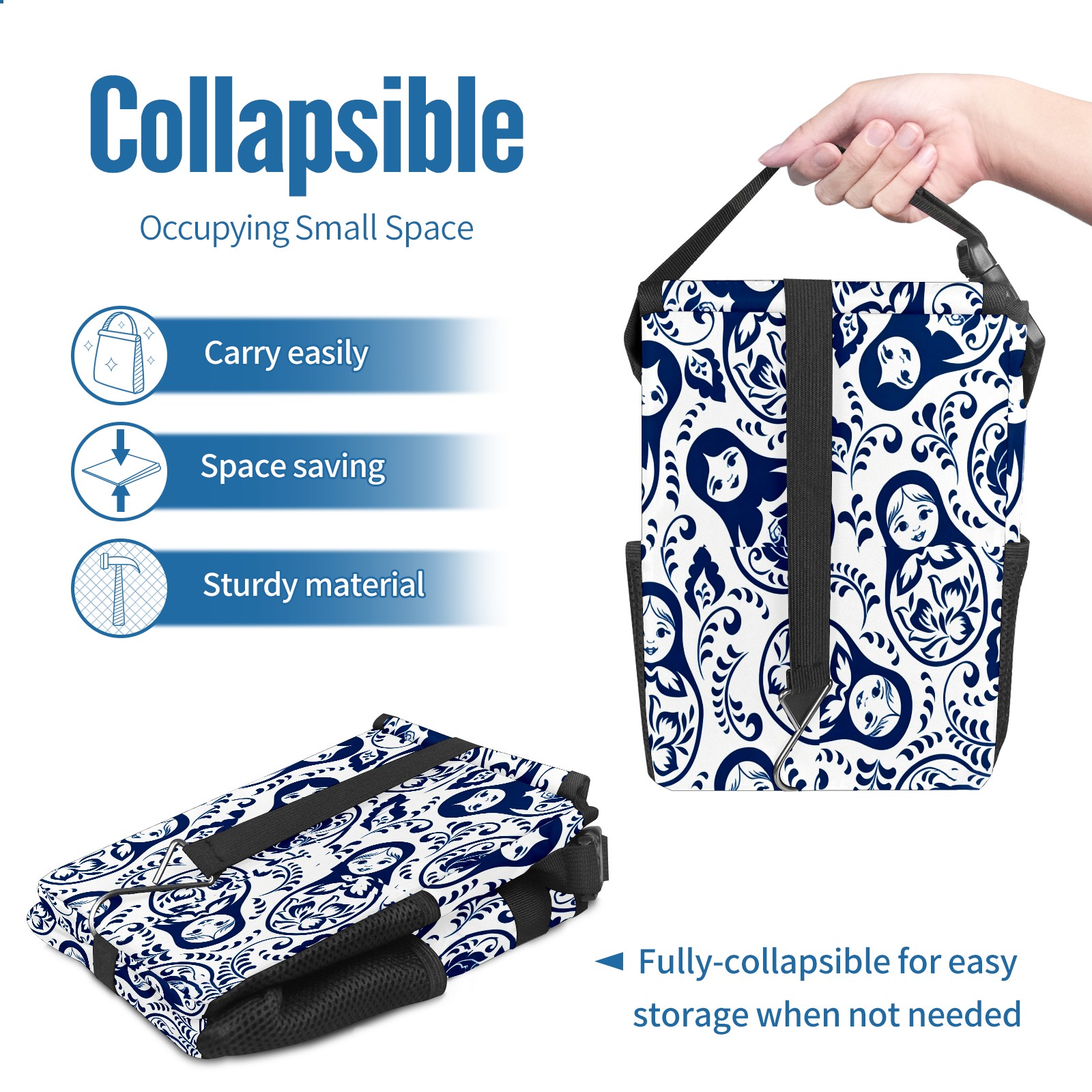 <p><strong> Keep Your Car Spotless!</strong></p><p>Our small, collapsible car trash can is the ultimate solution for a clutter-free ride. With a secure lid, multiple pockets, and stable hanging design, it's a must-have accessory.</p><p><strong>Key Features</strong></p><ul><li><strong>Odor Control:</strong> Rubber-sealed lid traps smells; works with standard trash bags.</li><li><strong>Extra Storage:</strong> Mesh pockets and front pouch keep essentials handy.</li><li><strong>Secure Fit:</strong> Strap and hooks ensure it stays in place on any surface.</li><li><strong>Space-Saving:</strong> Fold flat when not in use to maximize storage.</li><li><strong>Stylish &amp; Durable:</strong> Full-print twill fabric is built to last.</li></ul><p><strong>Specs</strong></p><p>Size: 24*17*16cm | Material: Twill Weave + Webbing | Care: Hand wash, avoid sun exposure.</p>