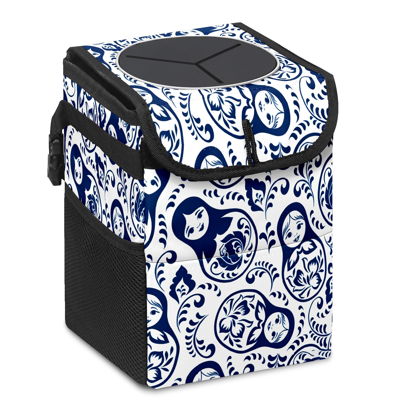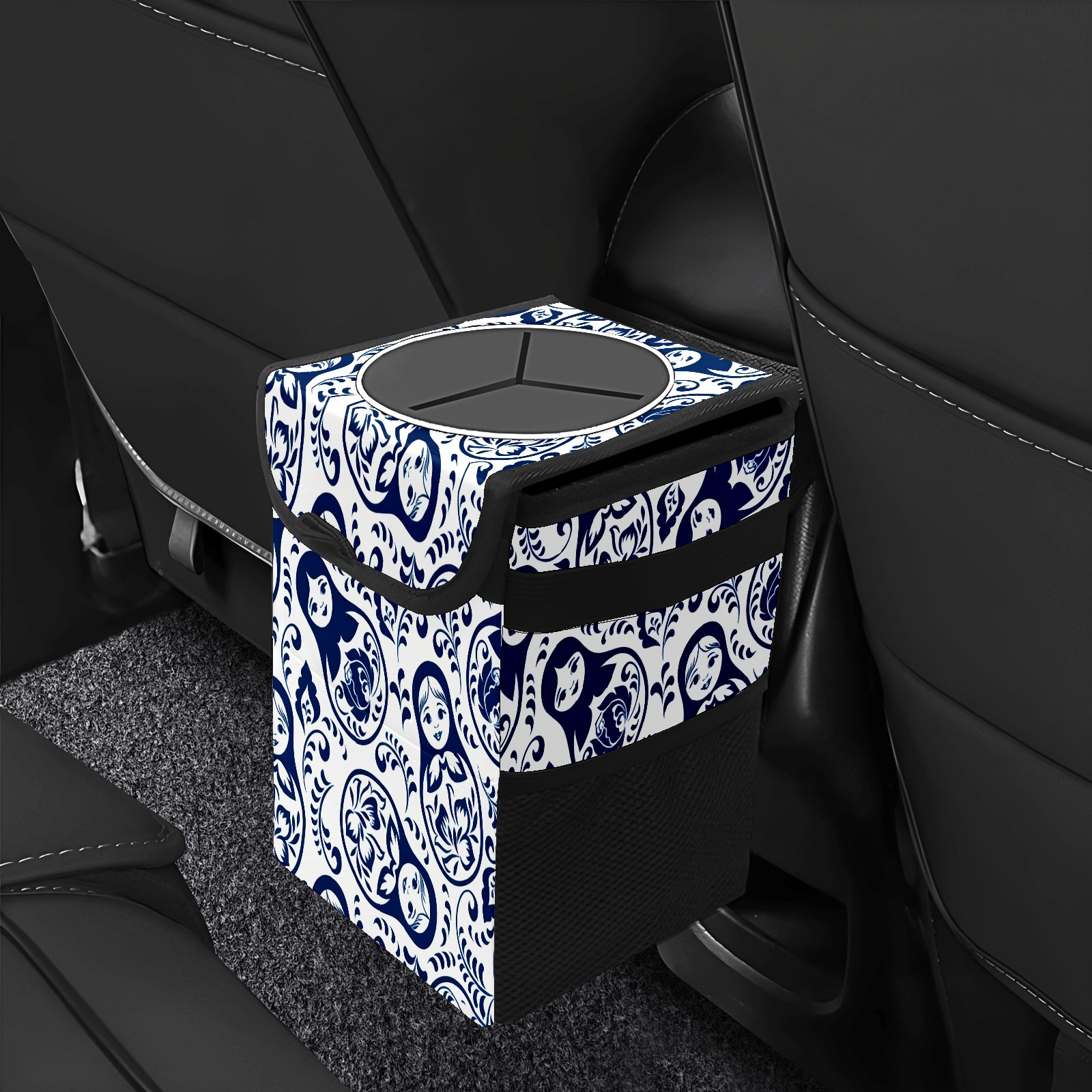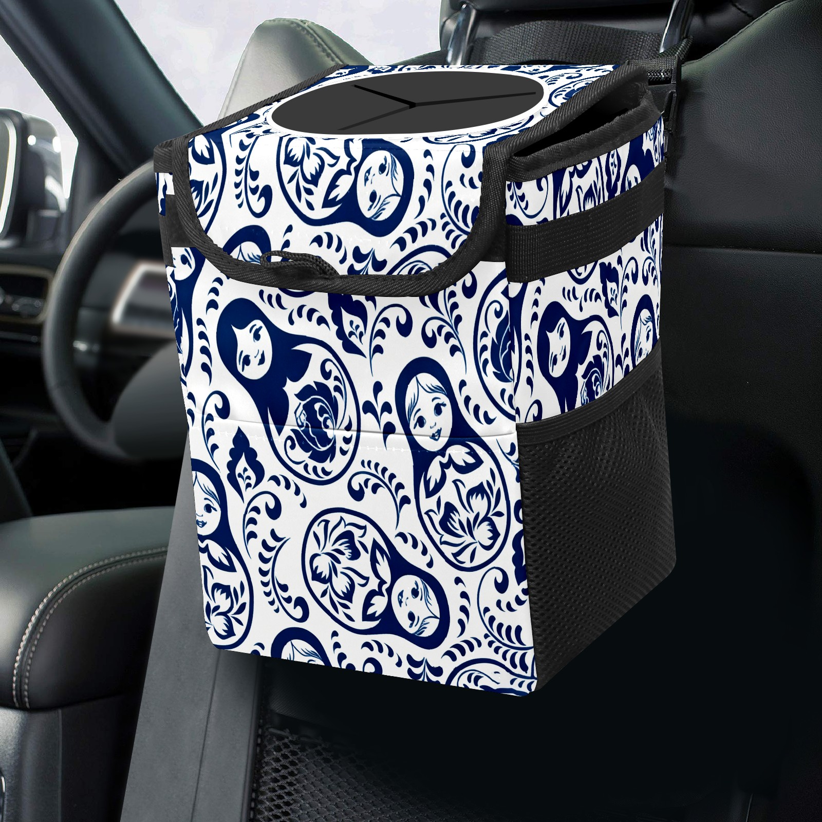 Small Collapsible Car Trash Can with Lid, Hanging Garbage Bin with Storage Pockets, Elegant Patterns Blue for Front/Back Seat, Car Interior Organizer Accessory