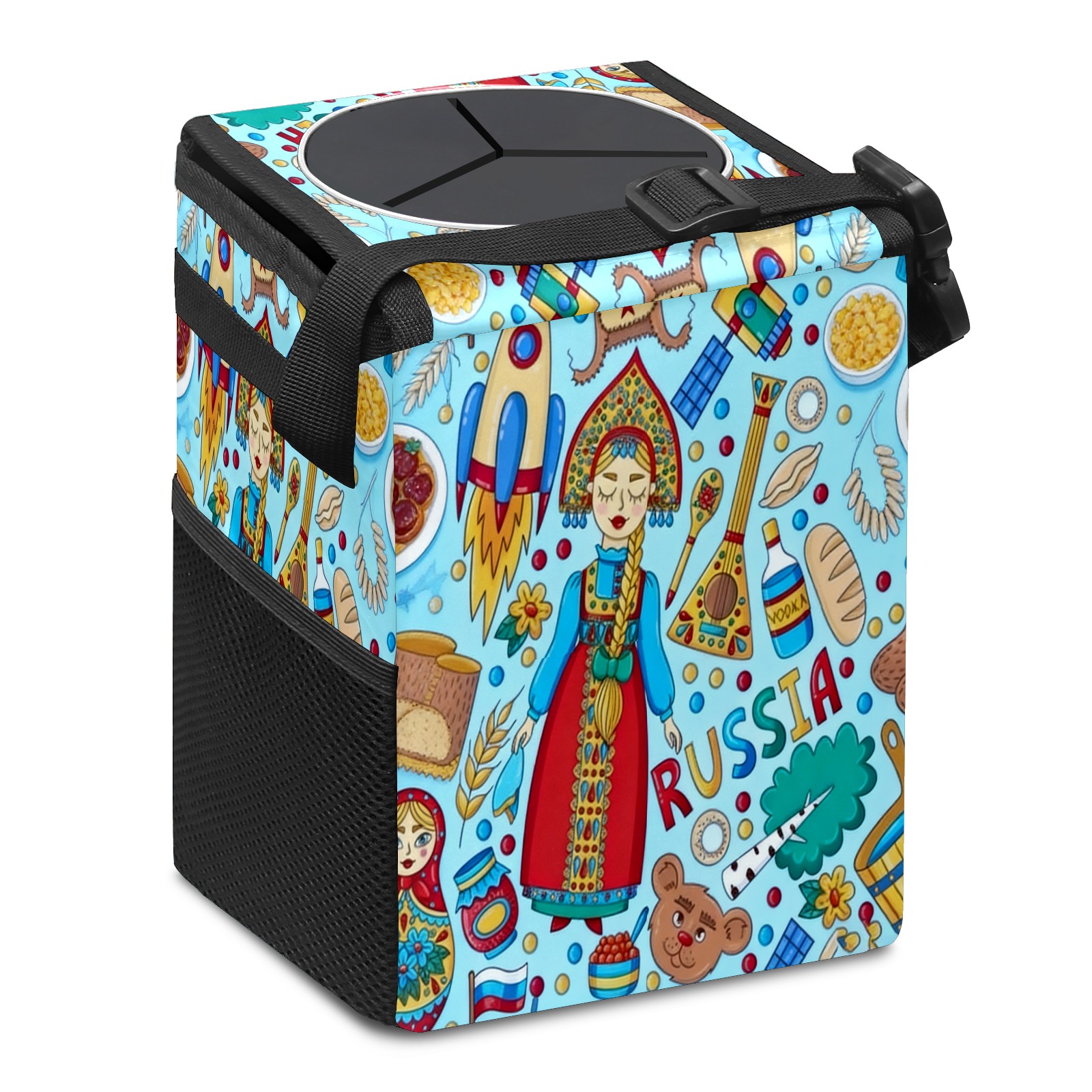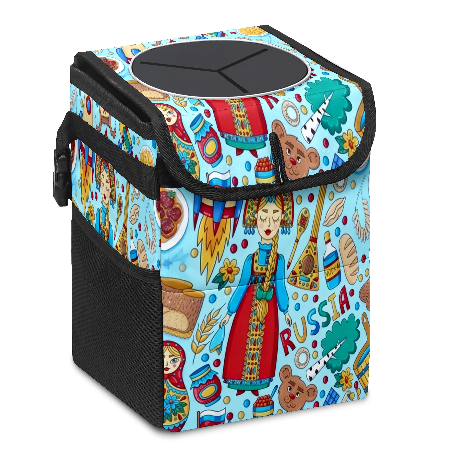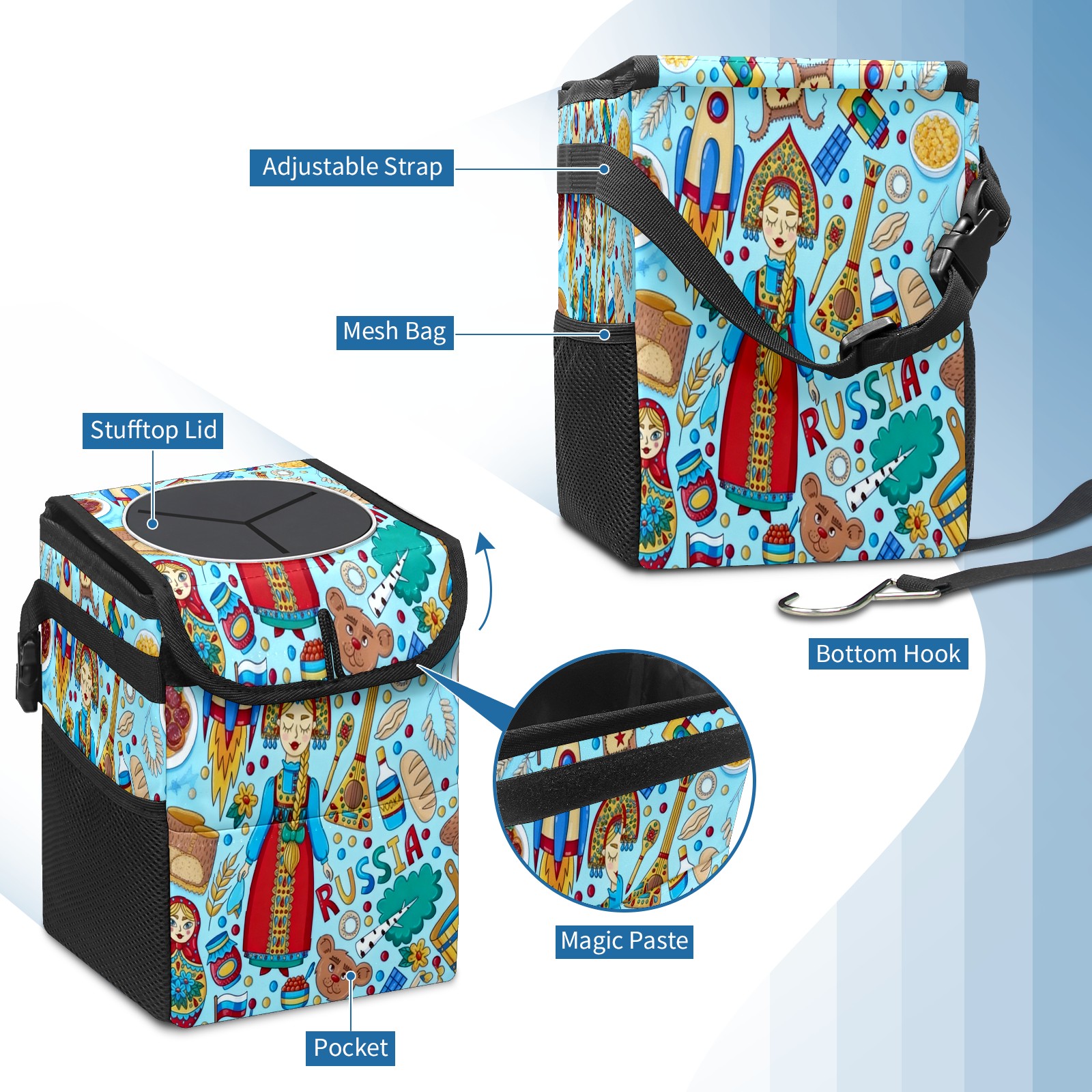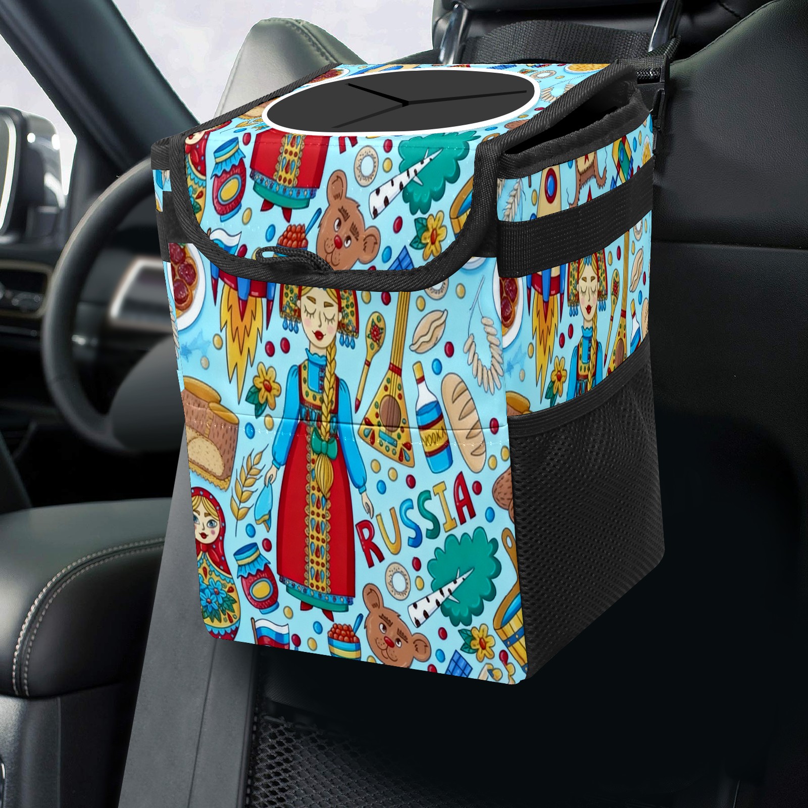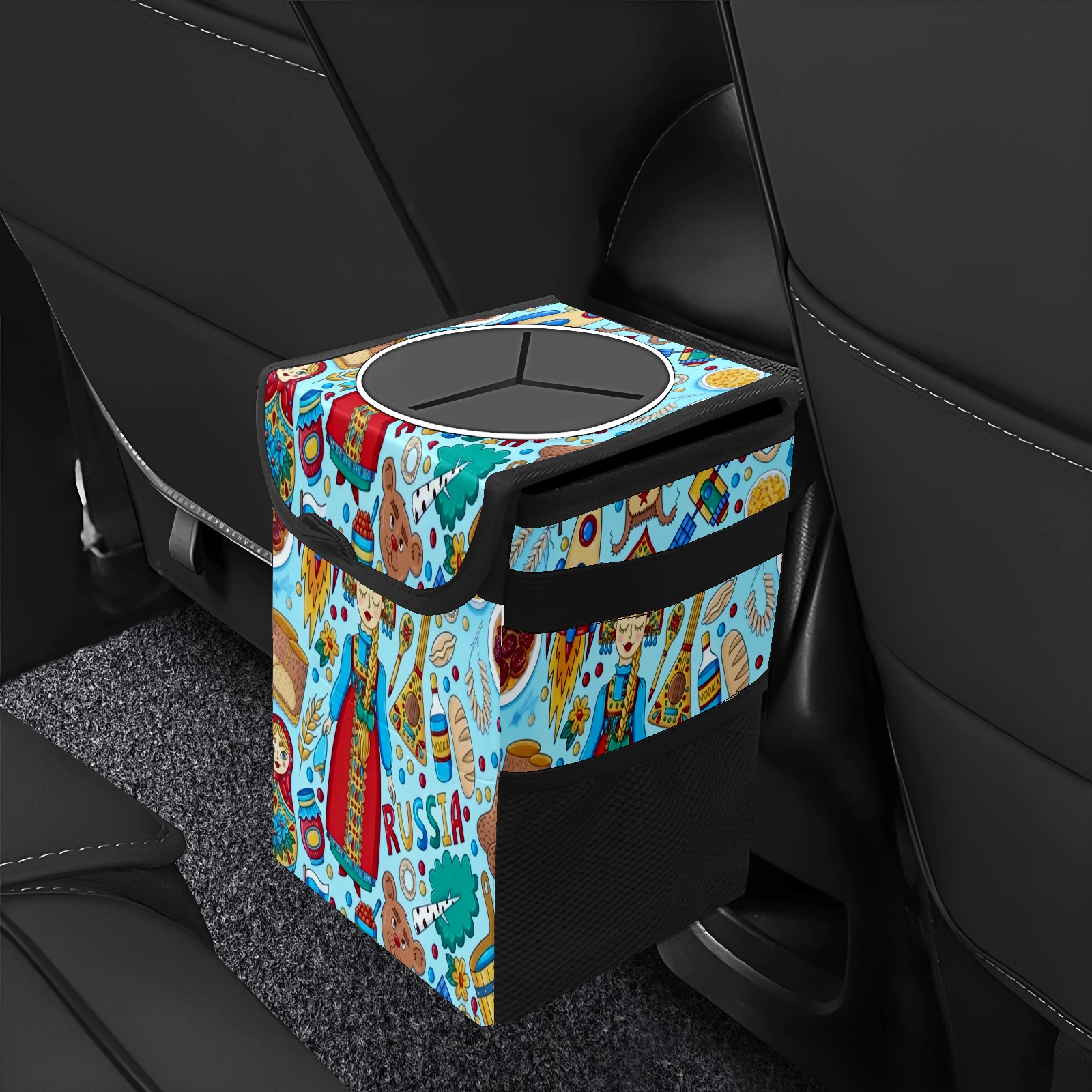 Small Collapsible Car Trash Can with Lid, Hanging Garbage Bin with Storage Pockets, Vibrant Folk Blue for Front/Back Seat, Car Interior Organizer Accessory