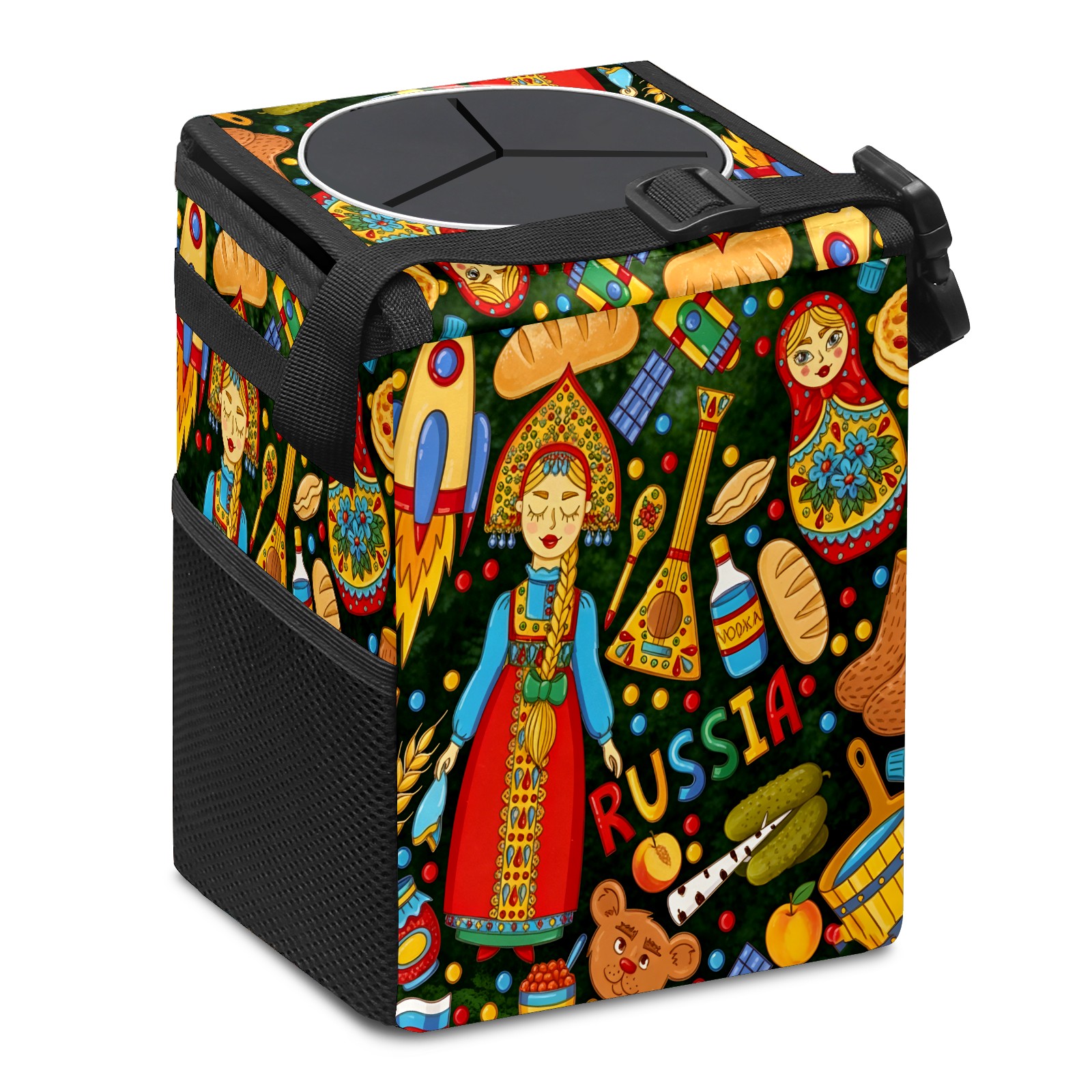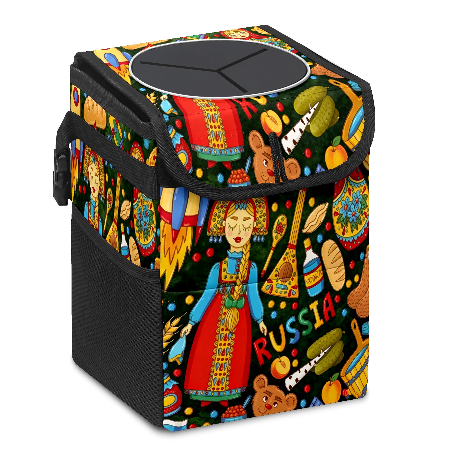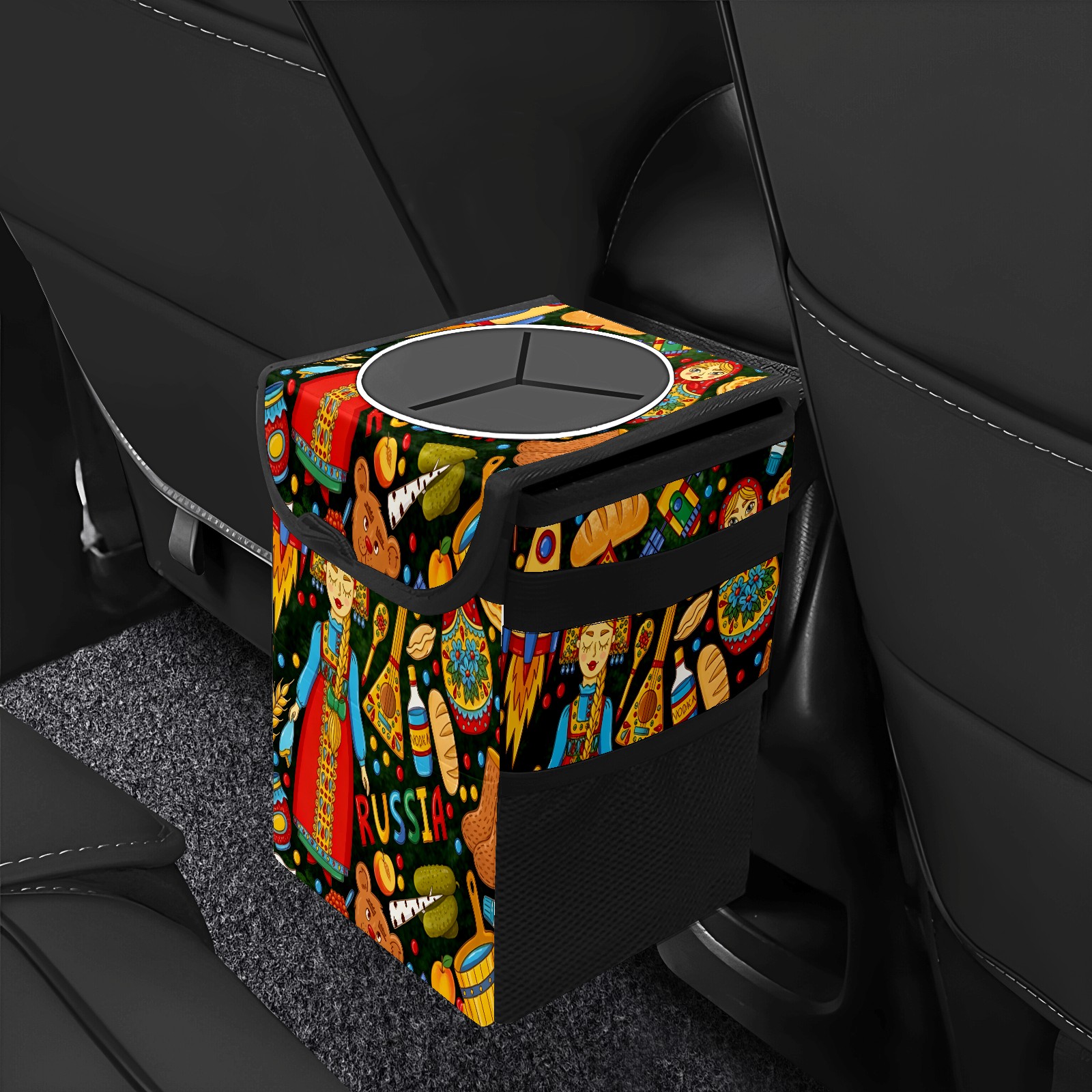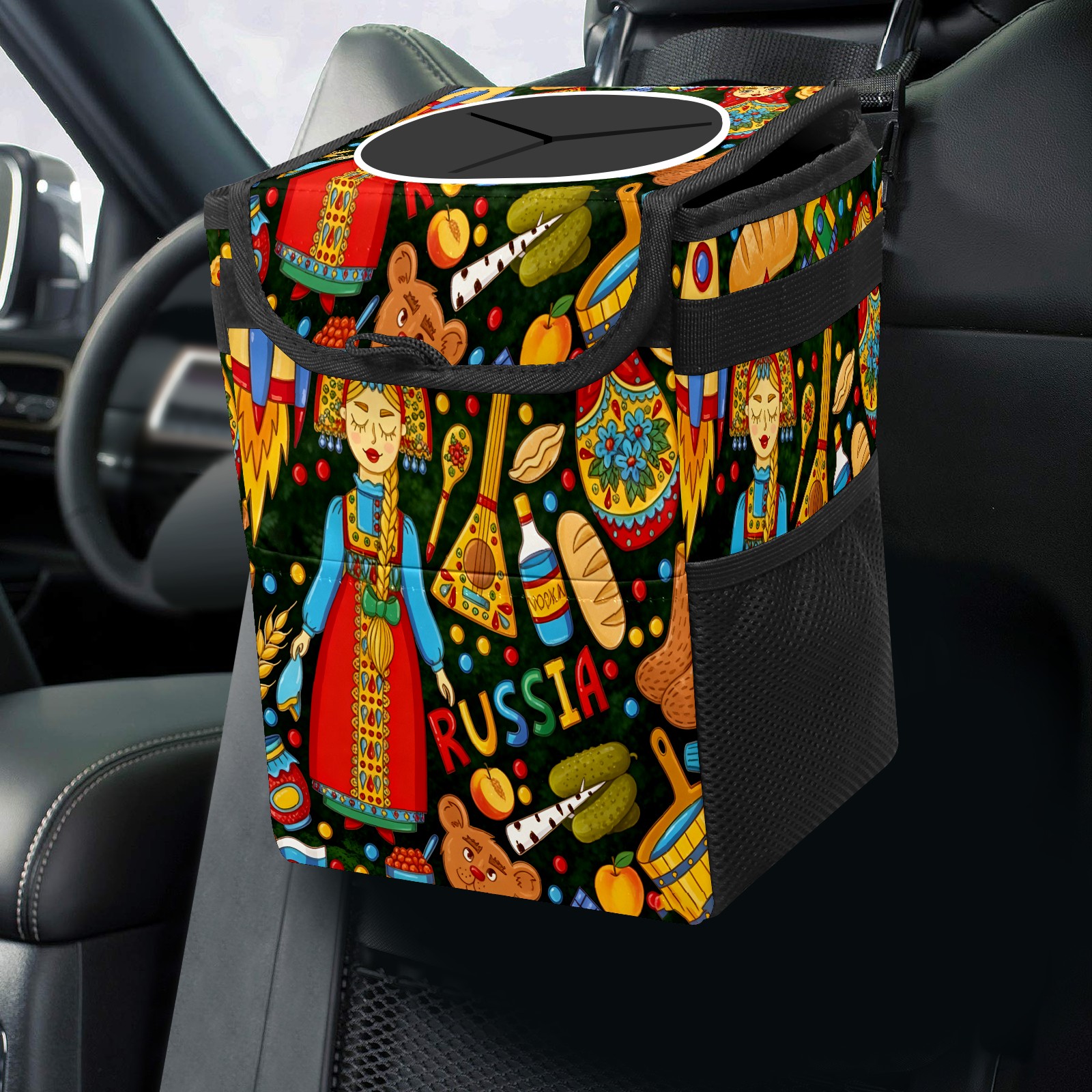 Small Collapsible Car Trash Can with Lid, Hanging Garbage Bin with Storage Pockets, Vibrant Folk Multi for Front/Back Seat, Car Interior Organizer Accessory