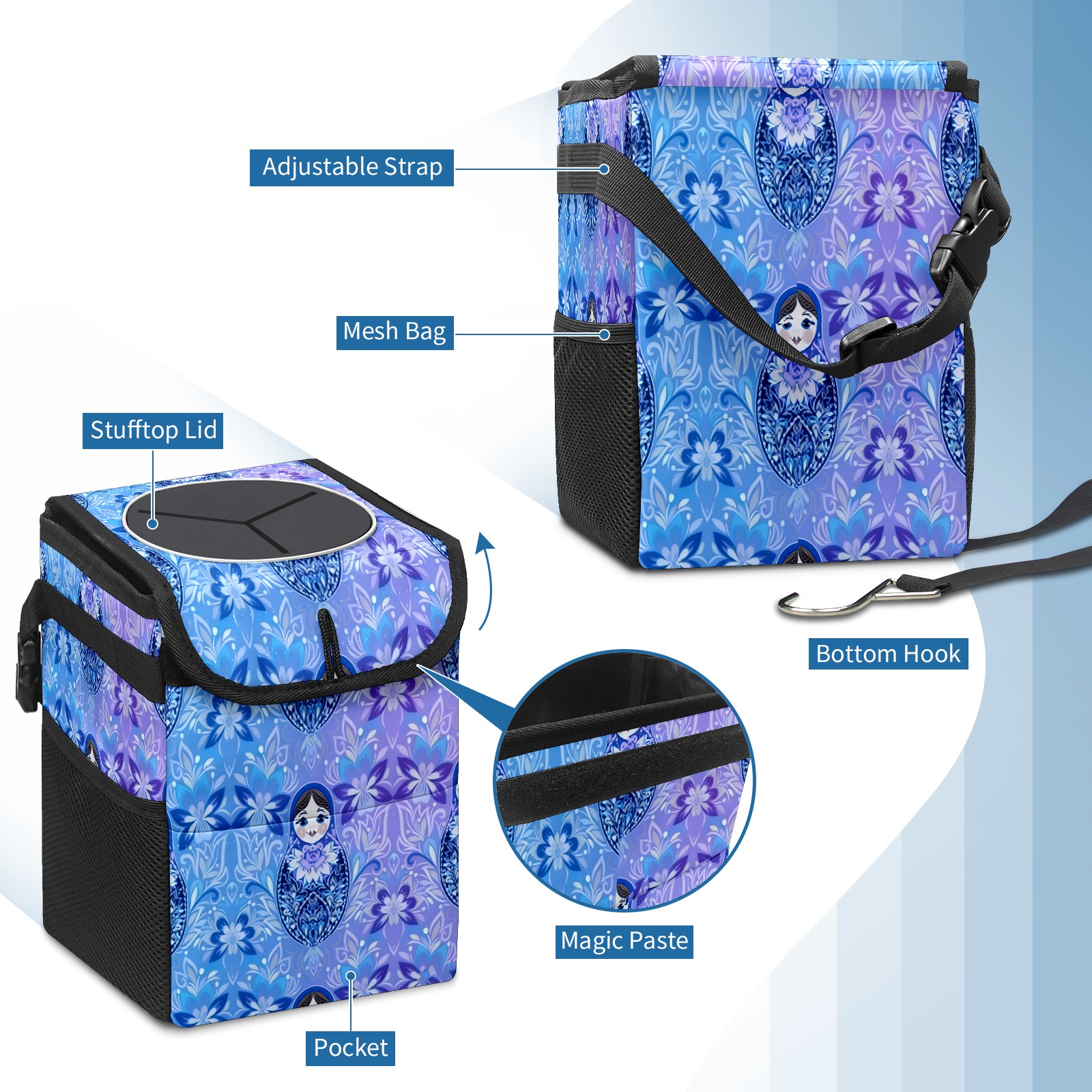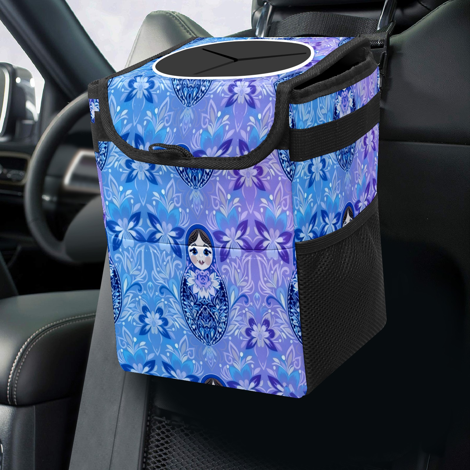 Small Collapsible Car Trash Can with Lid, Hanging Garbage Bin with Storage Pockets, Dreamy Patterns Blue for Front/Back Seat, Car Interior Organizer Accessory
