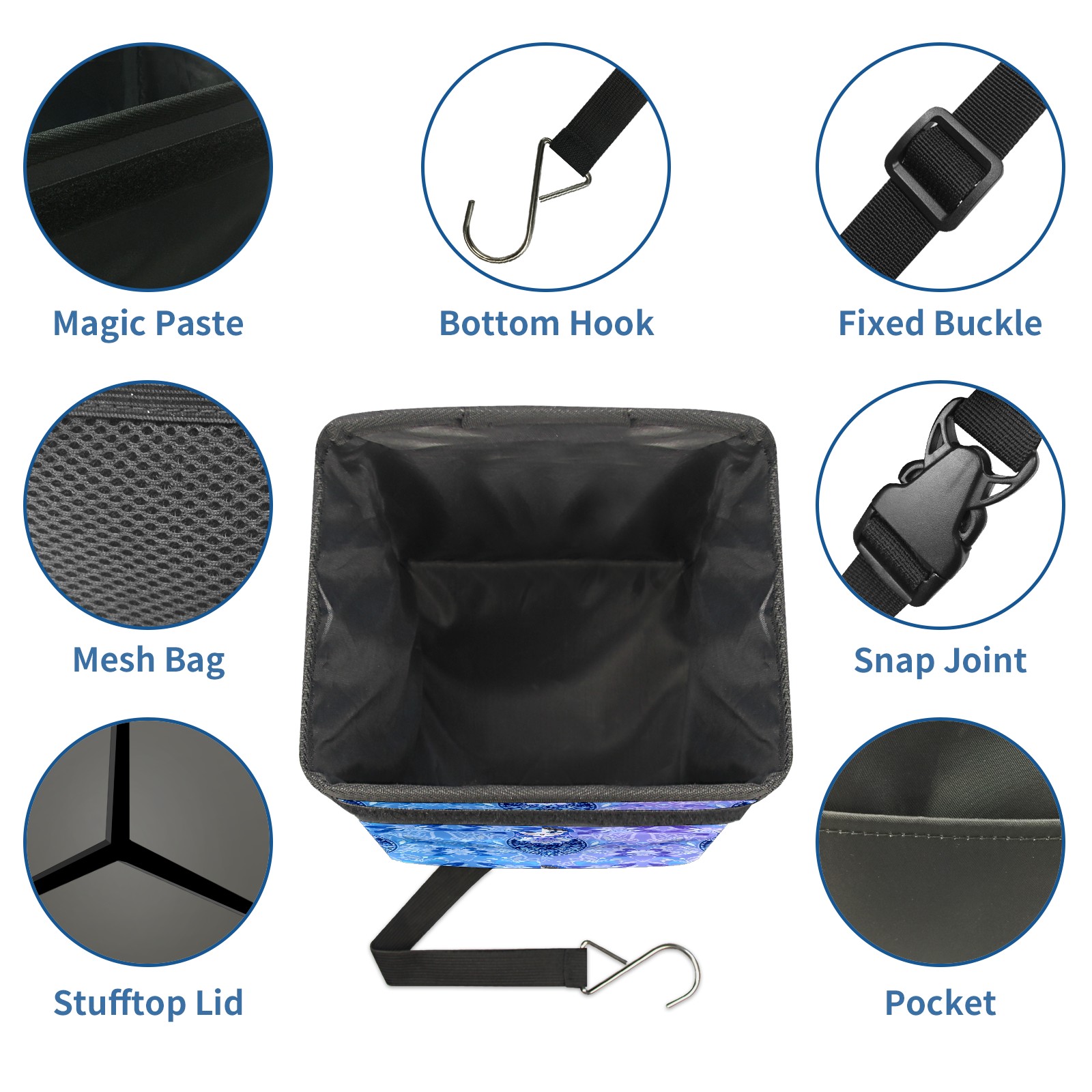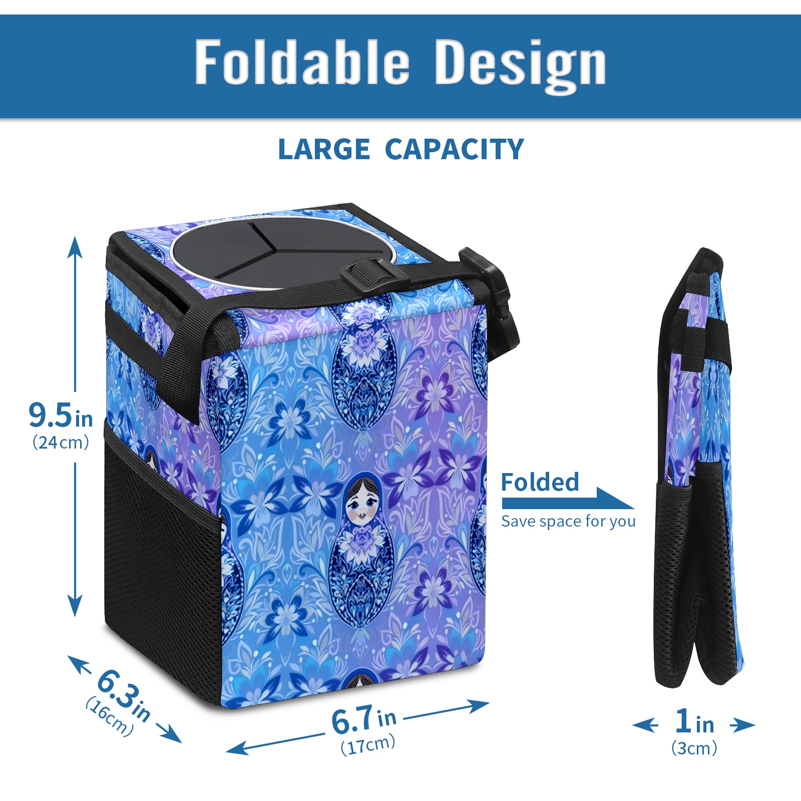 <p><strong> Keep Your Car Spotless!</strong></p><p>Our small, collapsible car trash can is the ultimate solution for a clutter-free ride. With a secure lid, multiple pockets, and stable hanging design, it's a must-have accessory.</p><p><strong>Key Features</strong></p><ul><li><strong>Odor Control:</strong> Rubber-sealed lid traps smells; works with standard trash bags.</li><li><strong>Extra Storage:</strong> Mesh pockets and front pouch keep essentials handy.</li><li><strong>Secure Fit:</strong> Strap and hooks ensure it stays in place on any surface.</li><li><strong>Space-Saving:</strong> Fold flat when not in use to maximize storage.</li><li><strong>Stylish &amp; Durable:</strong> Full-print twill fabric is built to last.</li></ul><p><strong>Specs</strong></p><p>Size: 24*17*16cm | Material: Twill Weave + Webbing | Care: Hand wash, avoid sun exposure.</p>