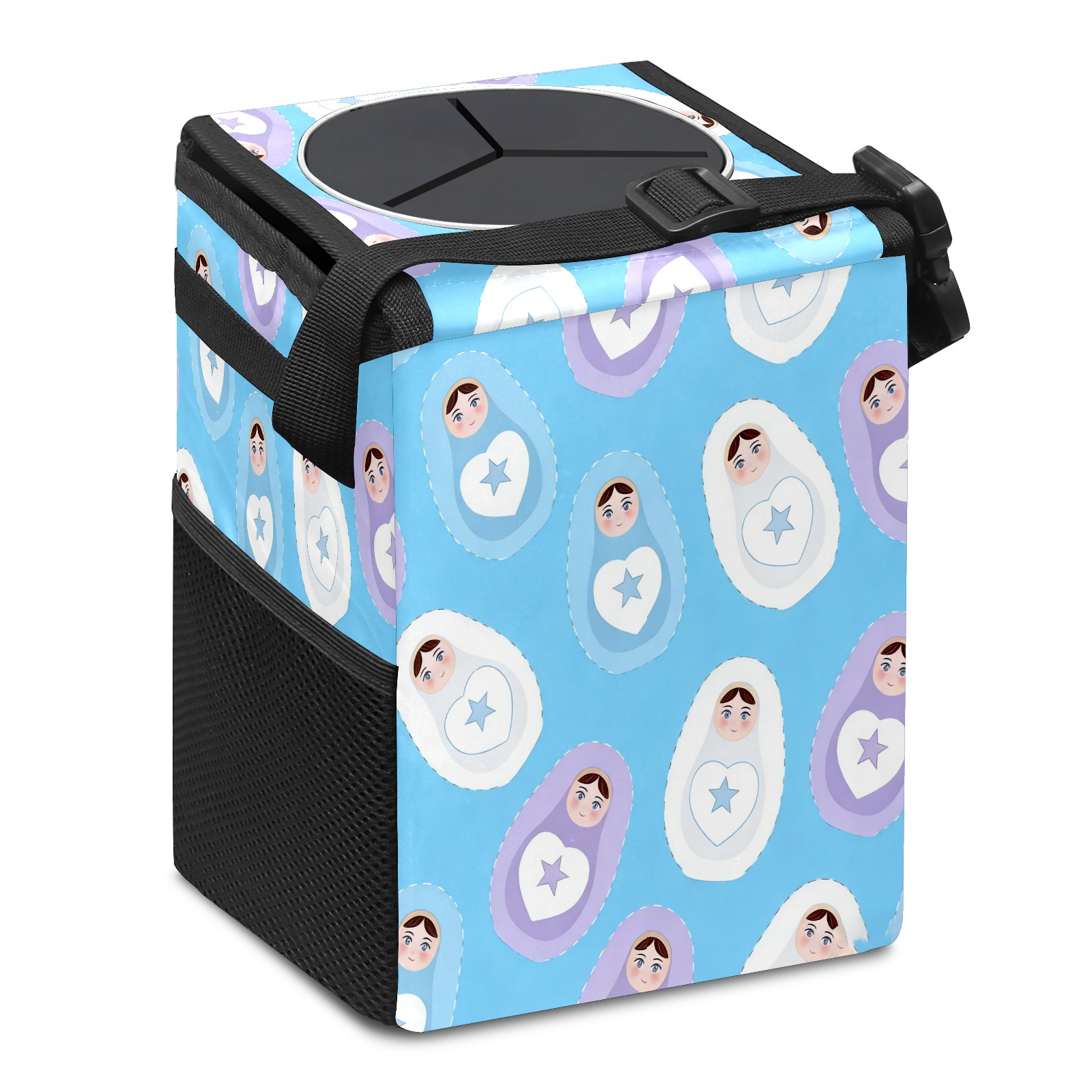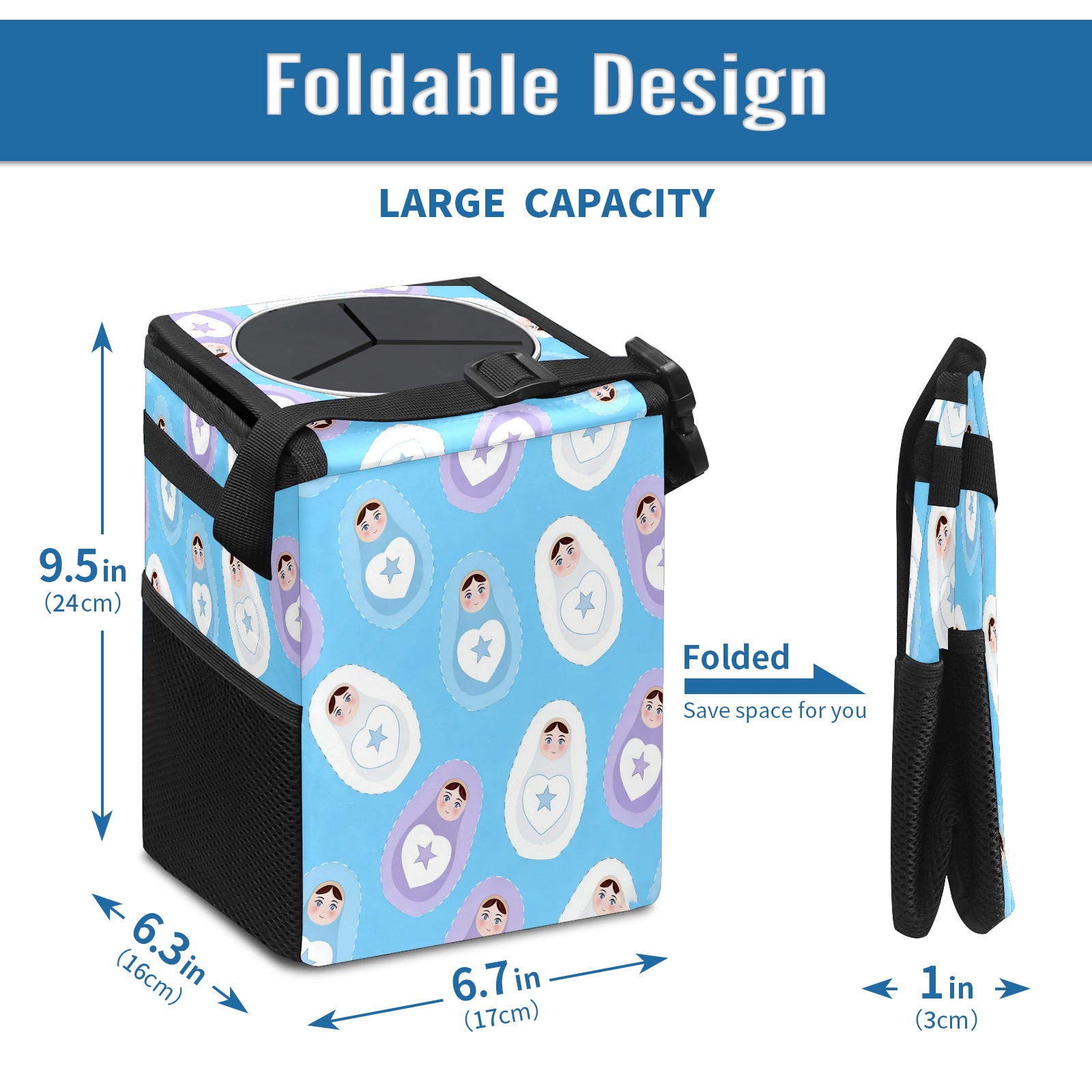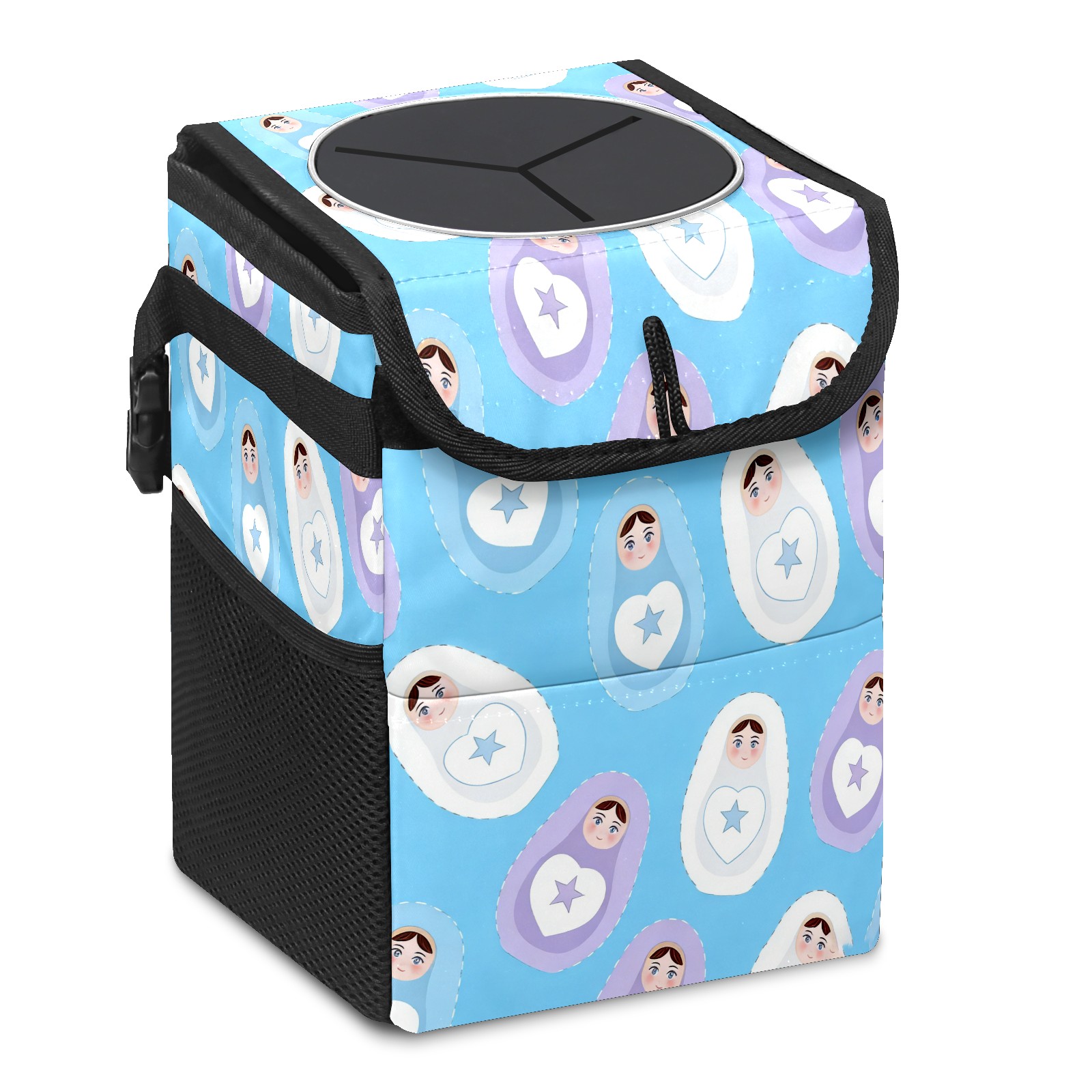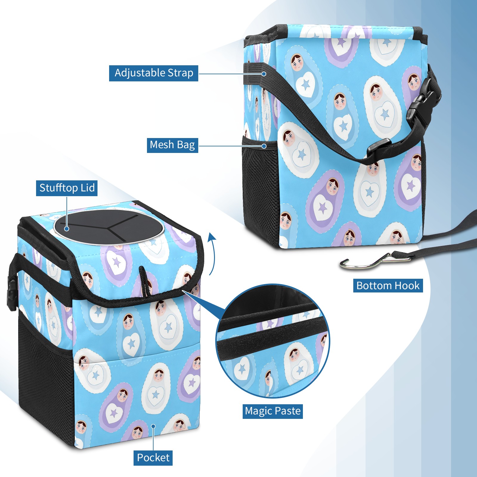 Small Collapsible Car Trash Can with Lid, Hanging Garbage Bin with Storage Pockets, Calm Dolls Blue for Front/Back Seat, Car Interior Organizer Accessory