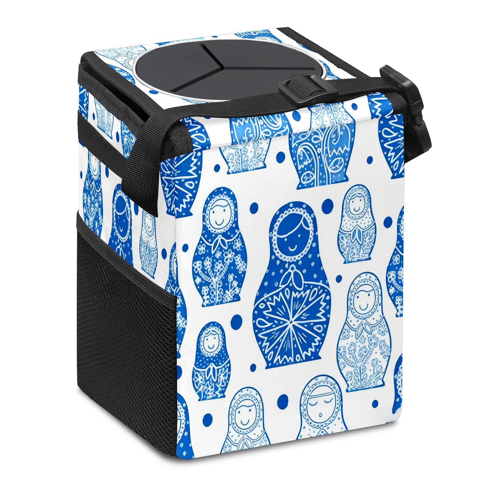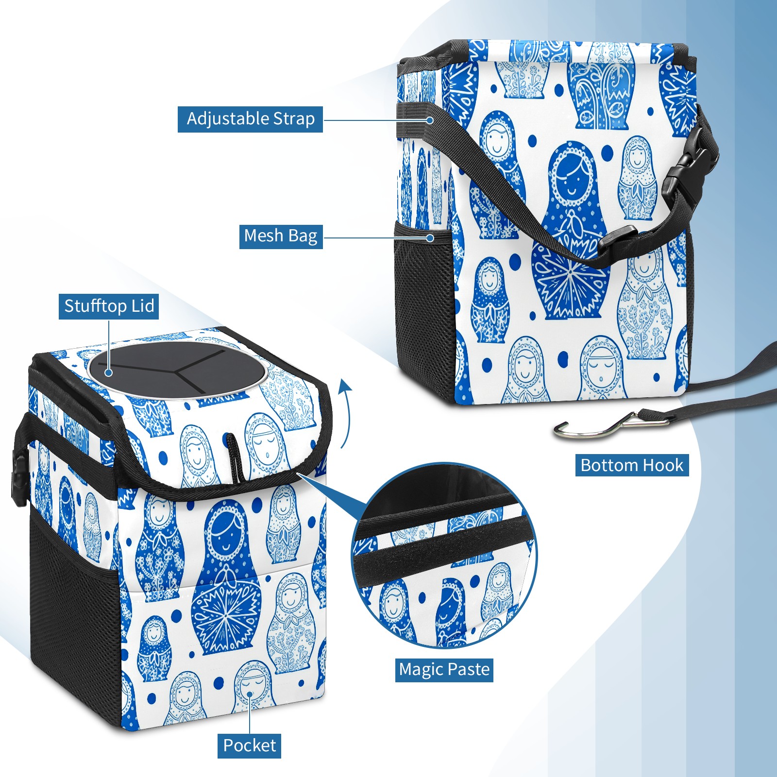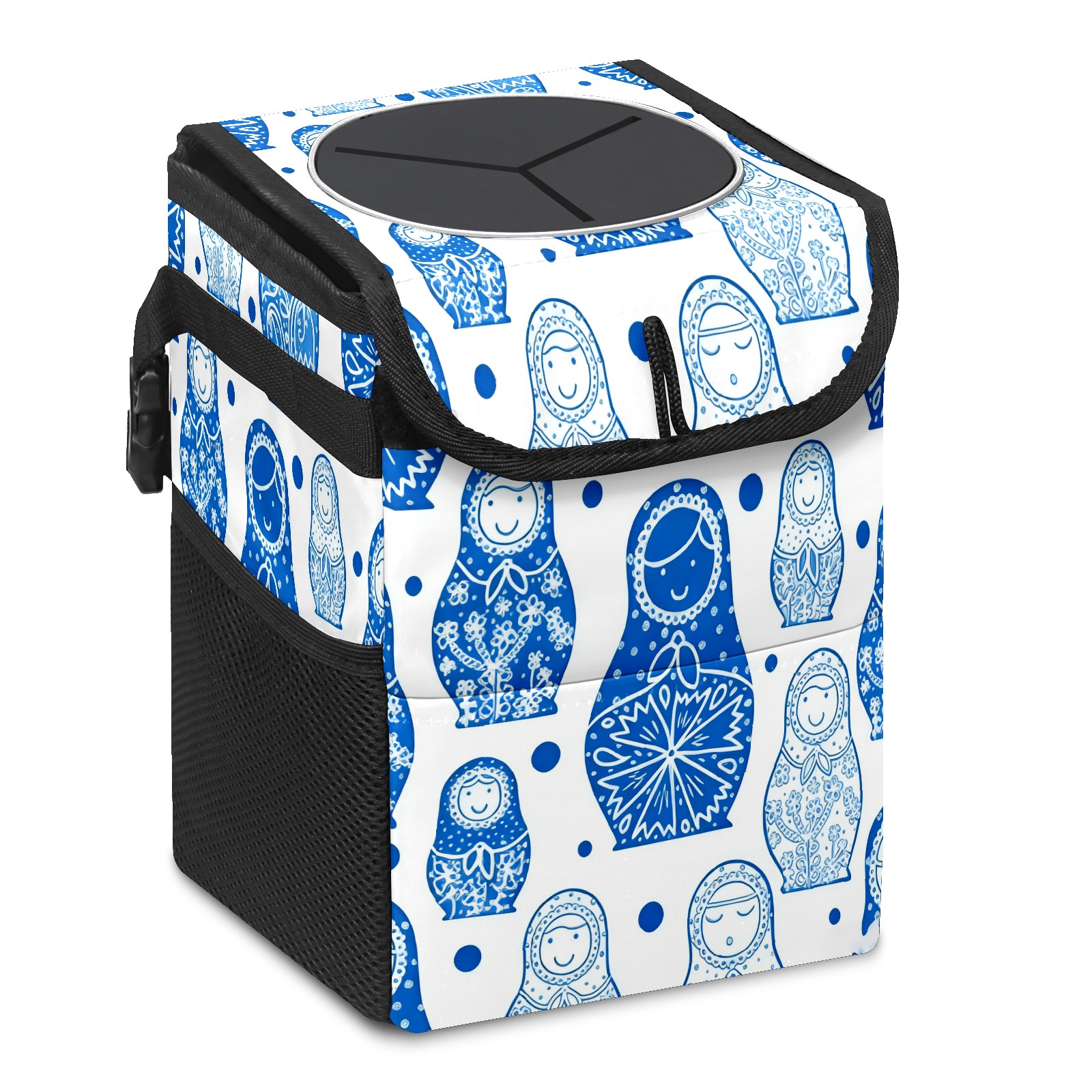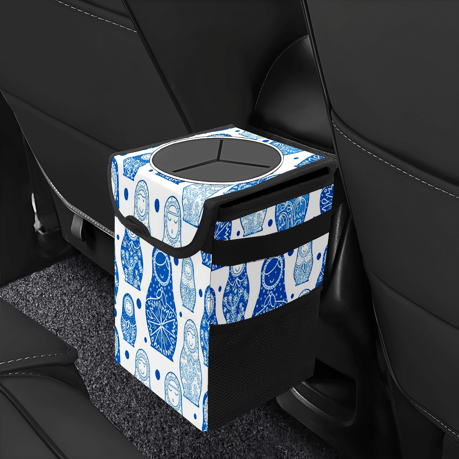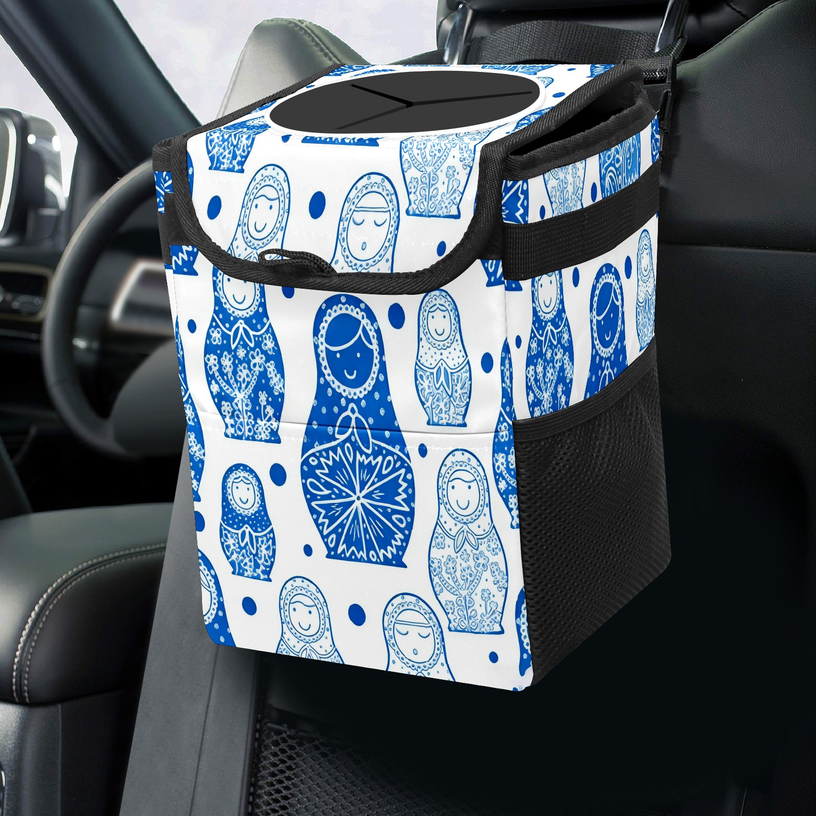 Small Collapsible Car Trash Can with Lid, Hanging Garbage Bin with Storage Pockets, Charming Dolls Blue for Front/Back Seat, Car Interior Organizer Accessory