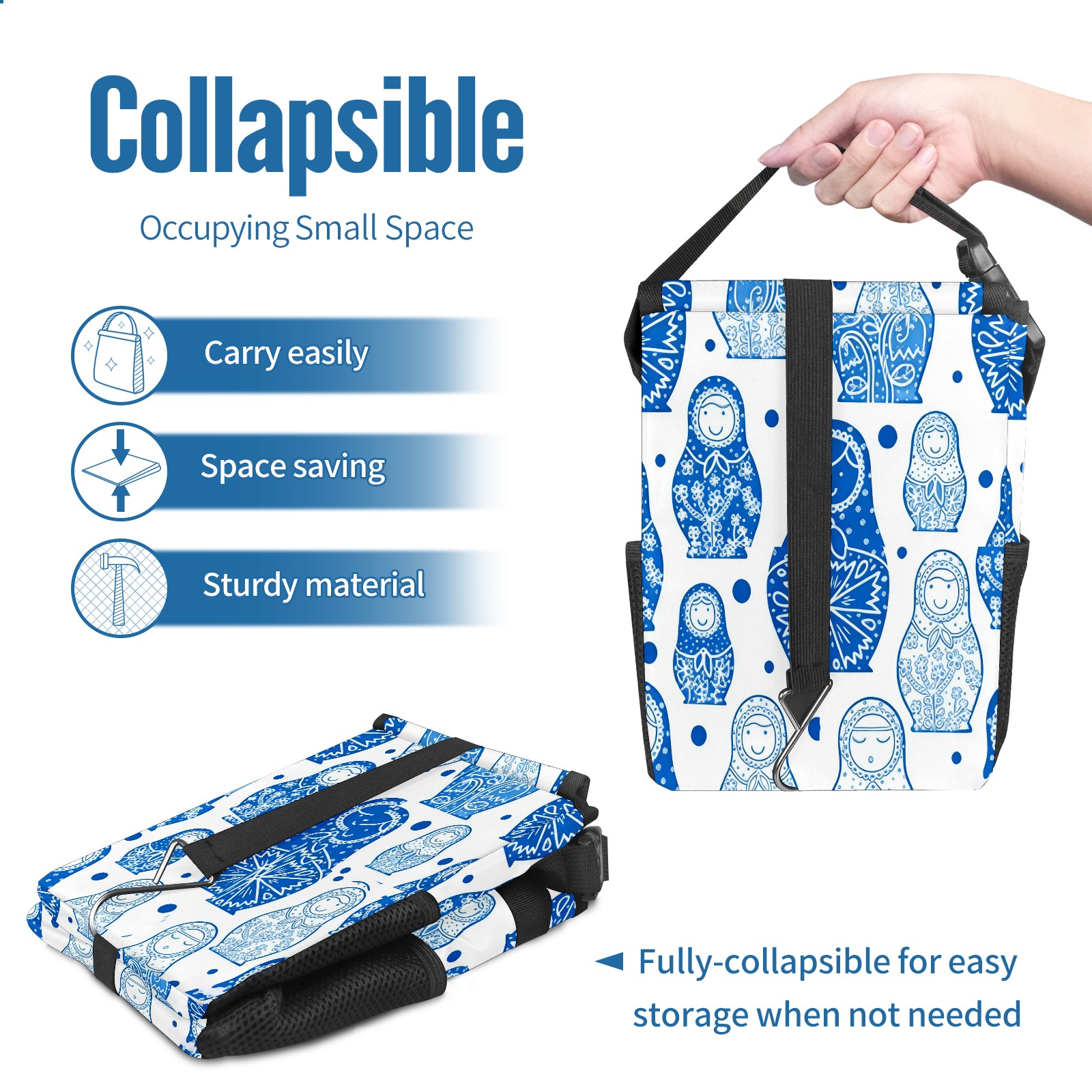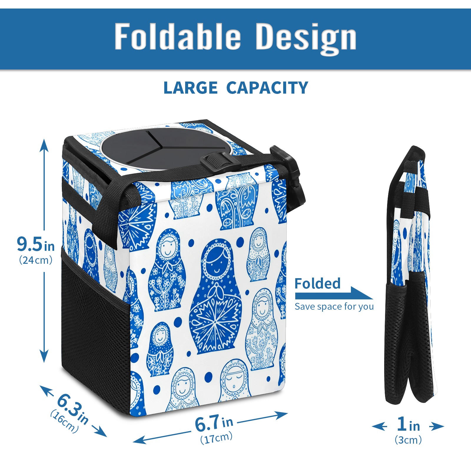 <p><strong> Keep Your Car Spotless!</strong></p><p>Our small, collapsible car trash can is the ultimate solution for a clutter-free ride. With a secure lid, multiple pockets, and stable hanging design, it's a must-have accessory.</p><p><strong>Key Features</strong></p><ul><li><strong>Odor Control:</strong> Rubber-sealed lid traps smells; works with standard trash bags.</li><li><strong>Extra Storage:</strong> Mesh pockets and front pouch keep essentials handy.</li><li><strong>Secure Fit:</strong> Strap and hooks ensure it stays in place on any surface.</li><li><strong>Space-Saving:</strong> Fold flat when not in use to maximize storage.</li><li><strong>Stylish &amp; Durable:</strong> Full-print twill fabric is built to last.</li></ul><p><strong>Specs</strong></p><p>Size: 24*17*16cm | Material: Twill Weave + Webbing | Care: Hand wash, avoid sun exposure.</p>
