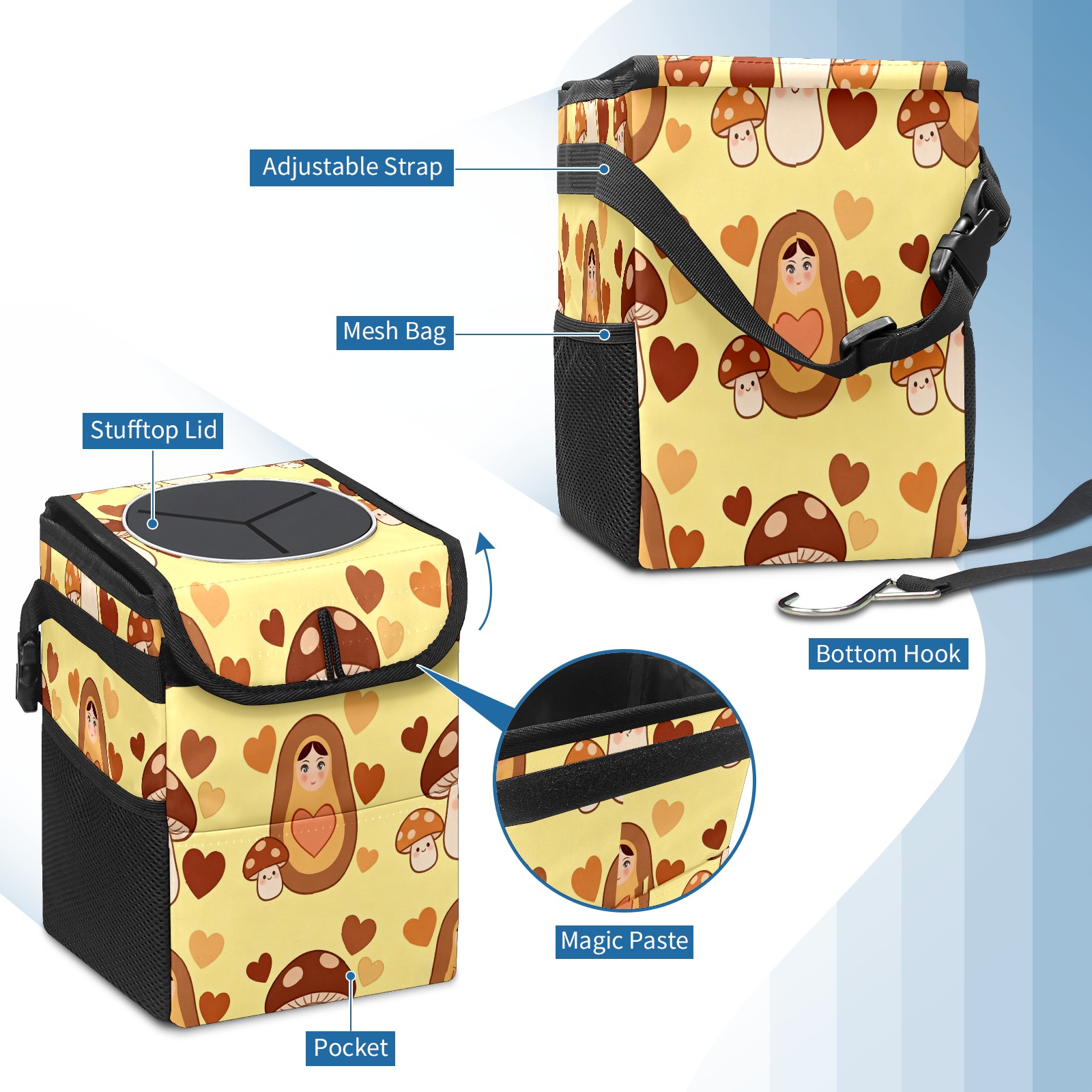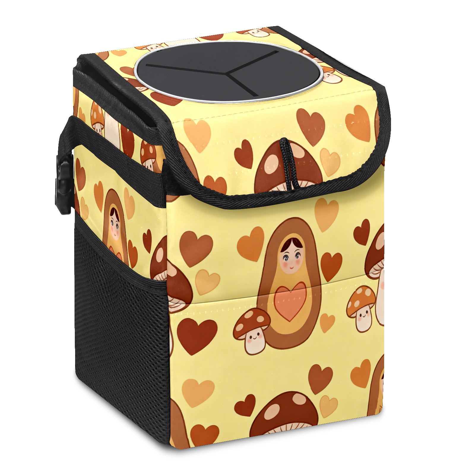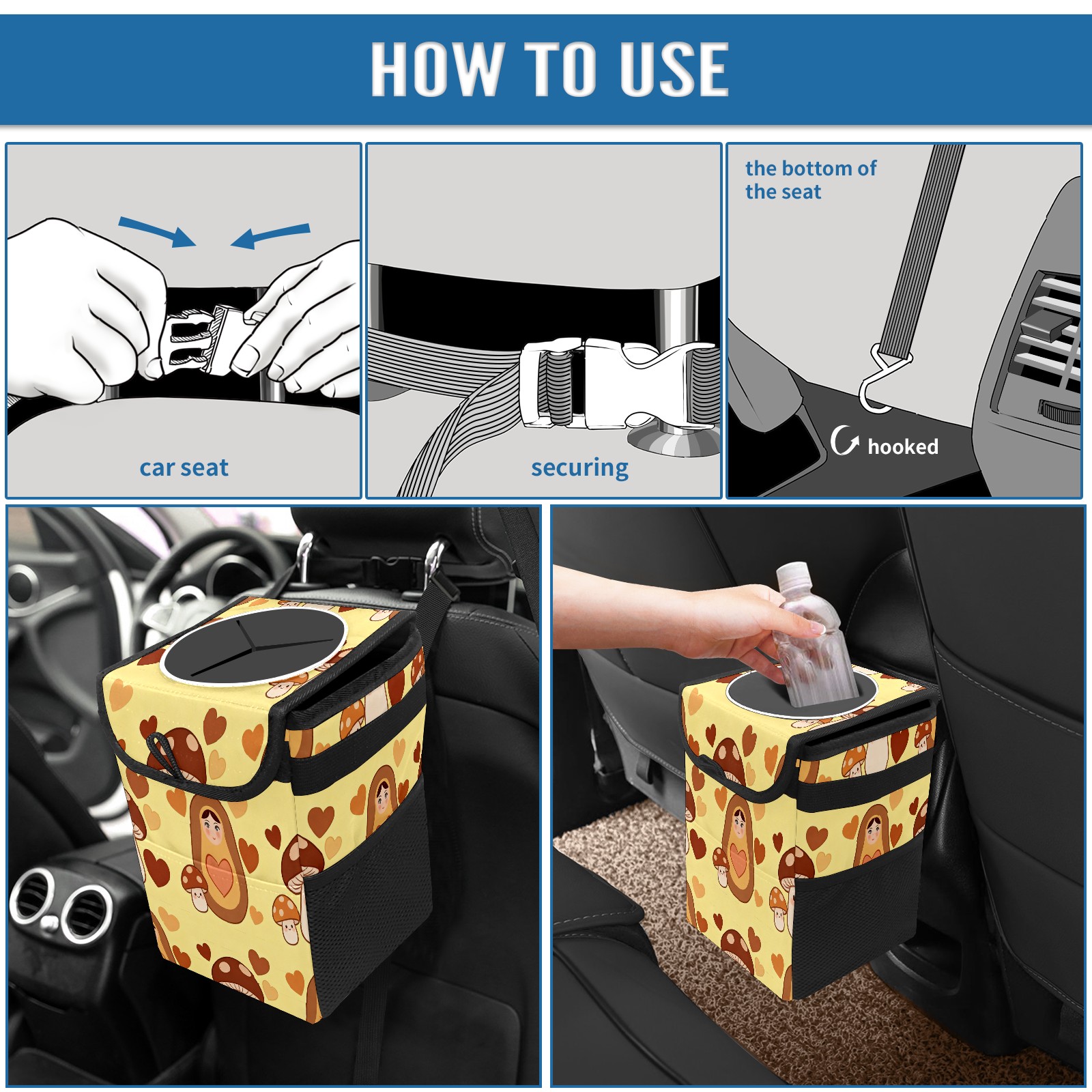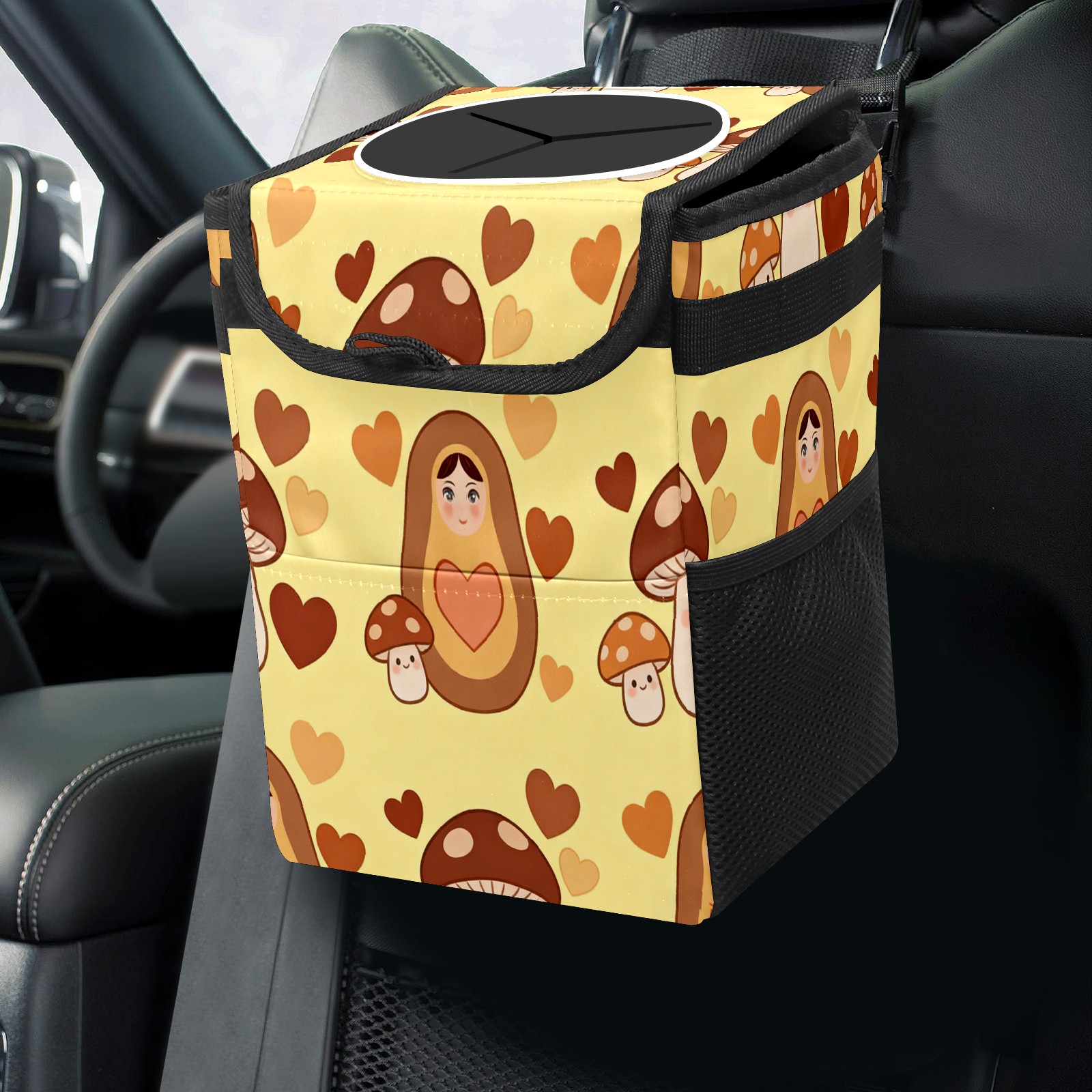 <p><strong> Keep Your Car Spotless!</strong></p><p>Our small, collapsible car trash can is the ultimate solution for a clutter-free ride. With a secure lid, multiple pockets, and stable hanging design, it's a must-have accessory.</p><p><strong>Key Features</strong></p><ul><li><strong>Odor Control:</strong> Rubber-sealed lid traps smells; works with standard trash bags.</li><li><strong>Extra Storage:</strong> Mesh pockets and front pouch keep essentials handy.</li><li><strong>Secure Fit:</strong> Strap and hooks ensure it stays in place on any surface.</li><li><strong>Space-Saving:</strong> Fold flat when not in use to maximize storage.</li><li><strong>Stylish &amp; Durable:</strong> Full-print twill fabric is built to last.</li></ul><p><strong>Specs</strong></p><p>Size: 24*17*16cm | Material: Twill Weave + Webbing | Care: Hand wash, avoid sun exposure.</p>