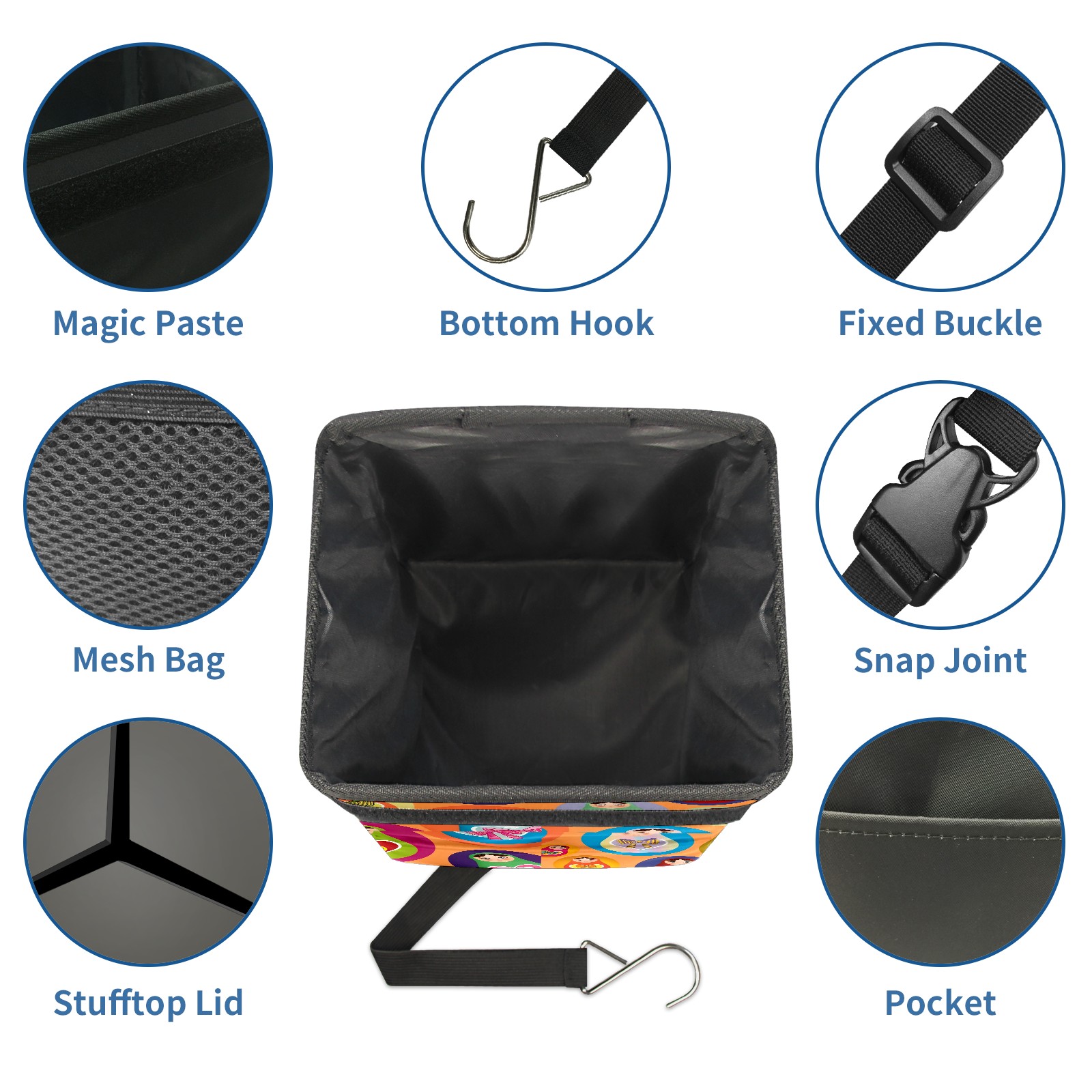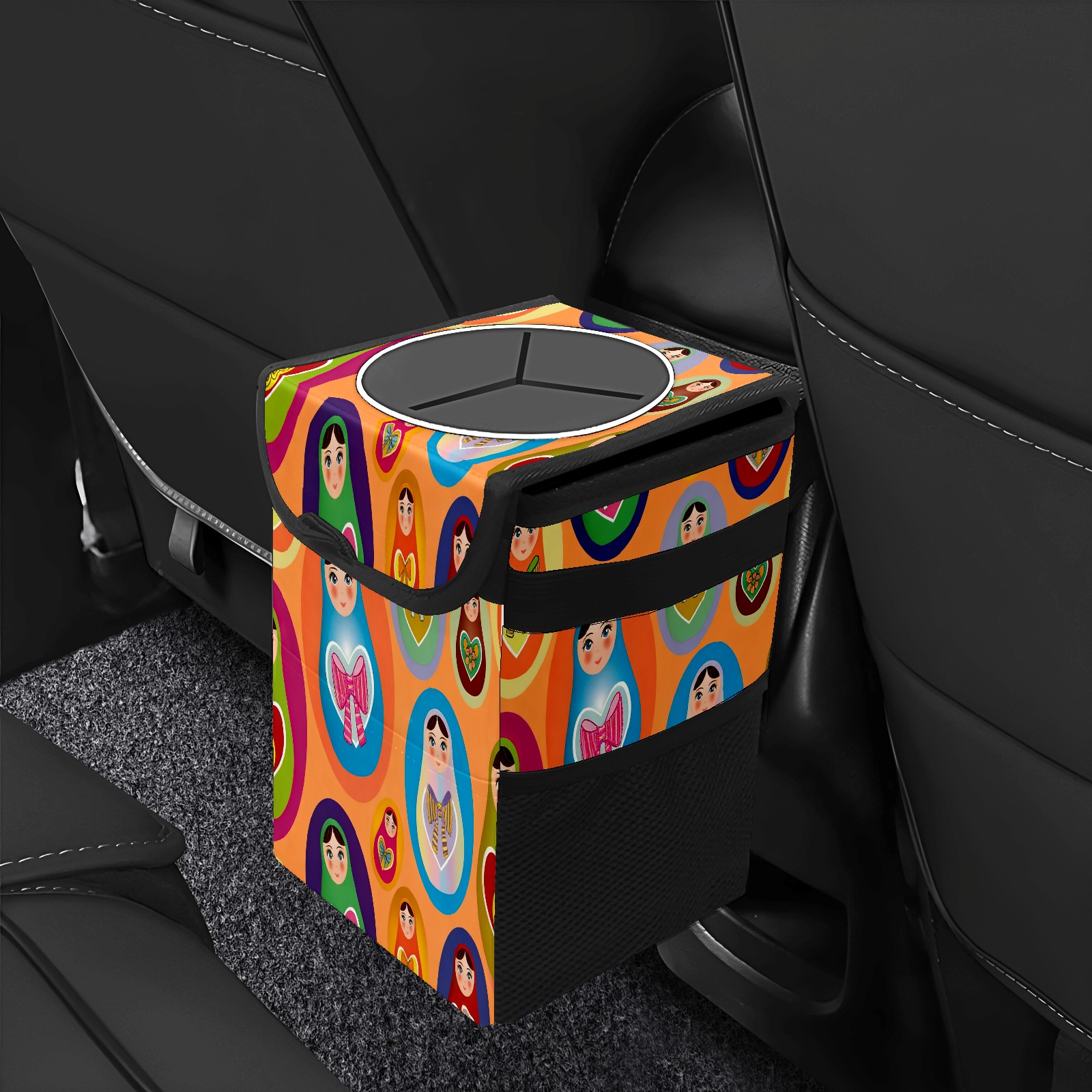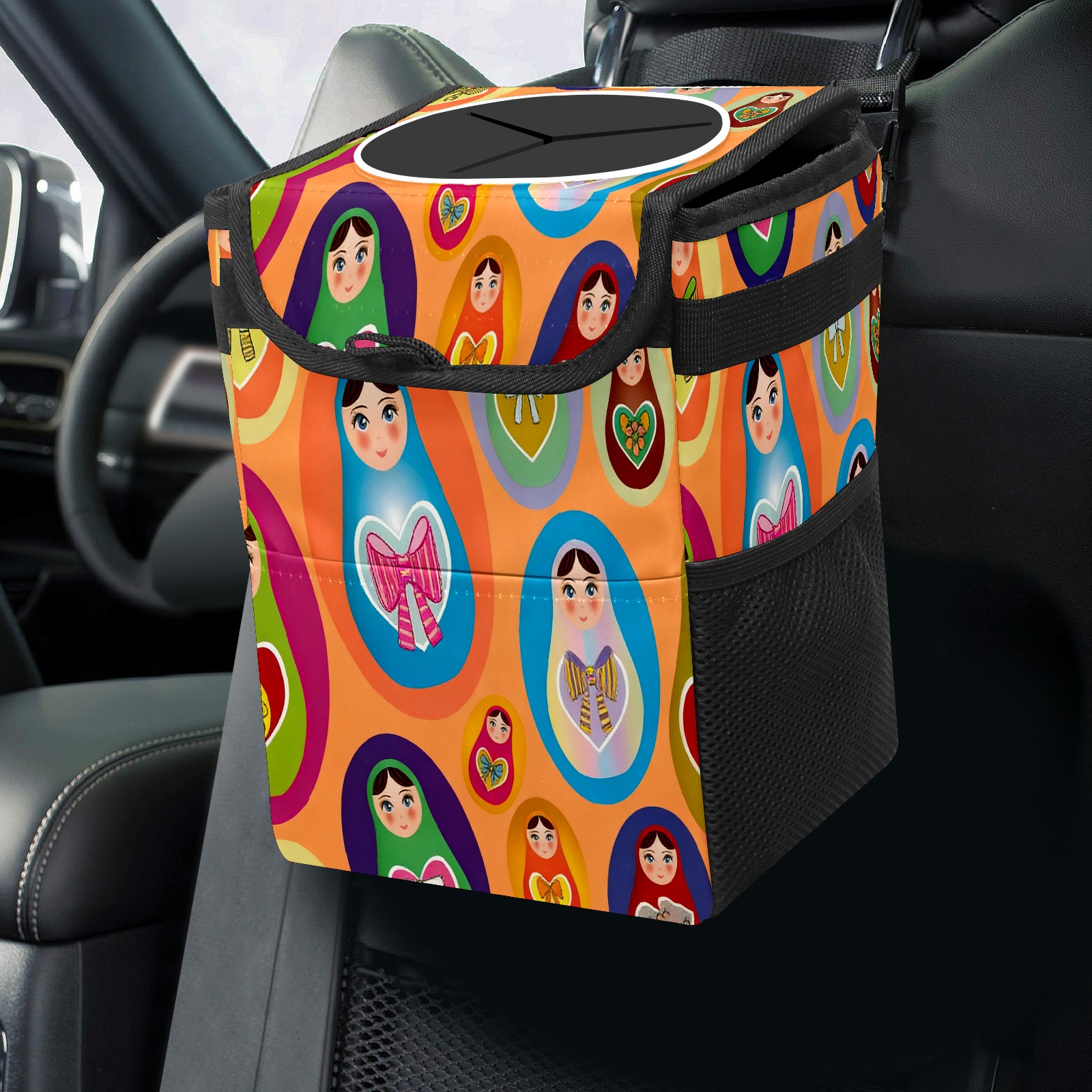 Small Collapsible Car Trash Can with Lid, Hanging Garbage Bin with Storage Pockets, Vibrant Dolls Orange for Front/Back Seat, Car Interior Organizer Accessory