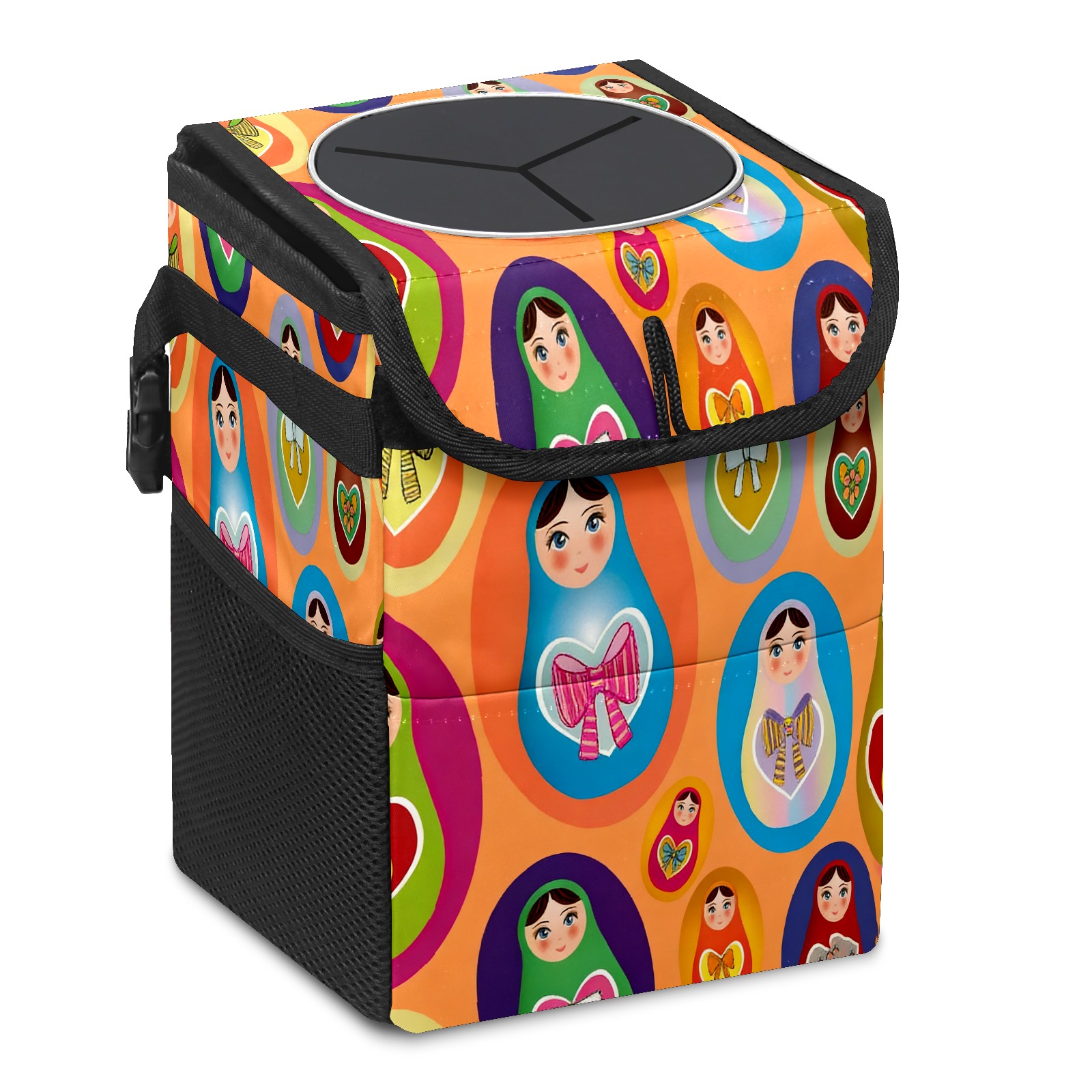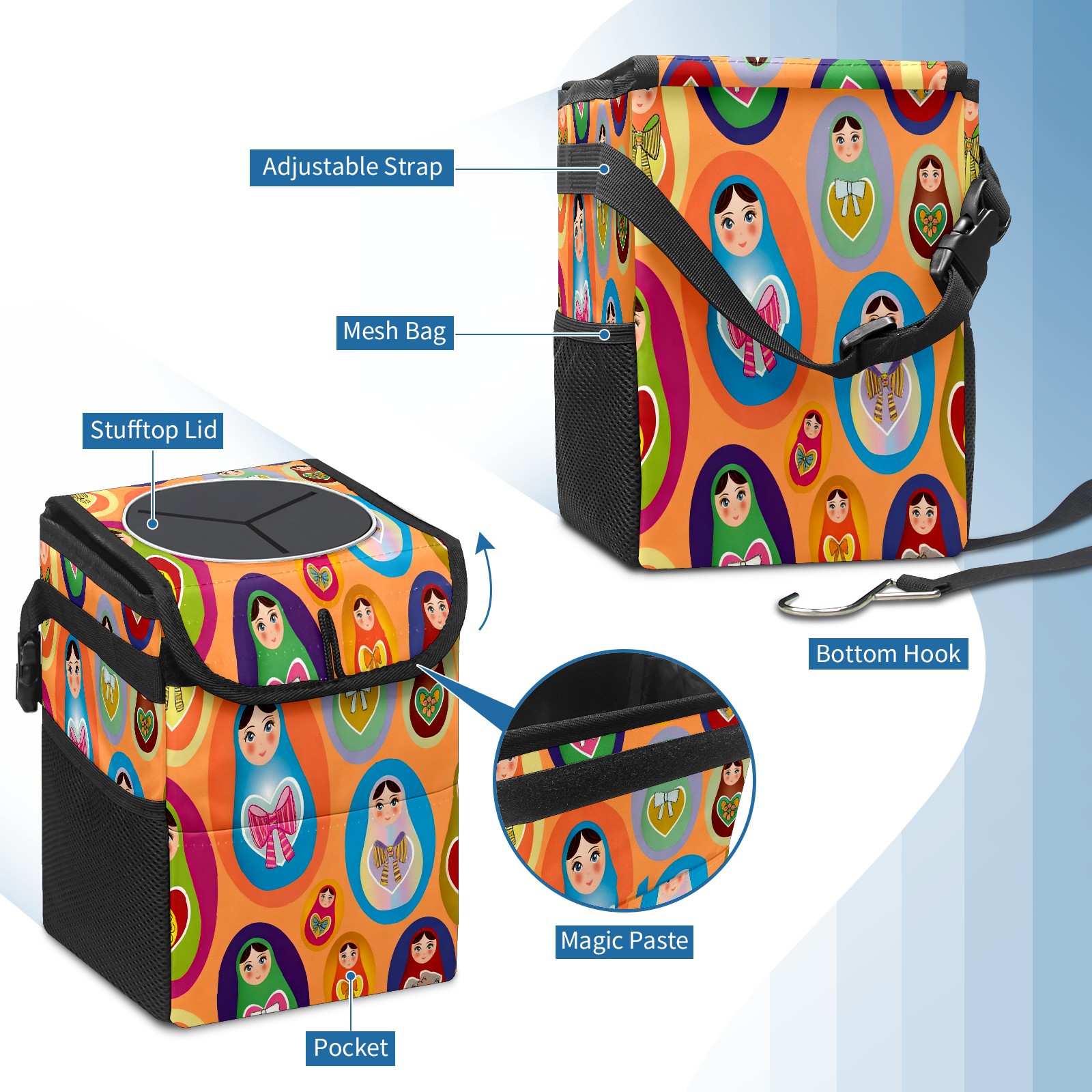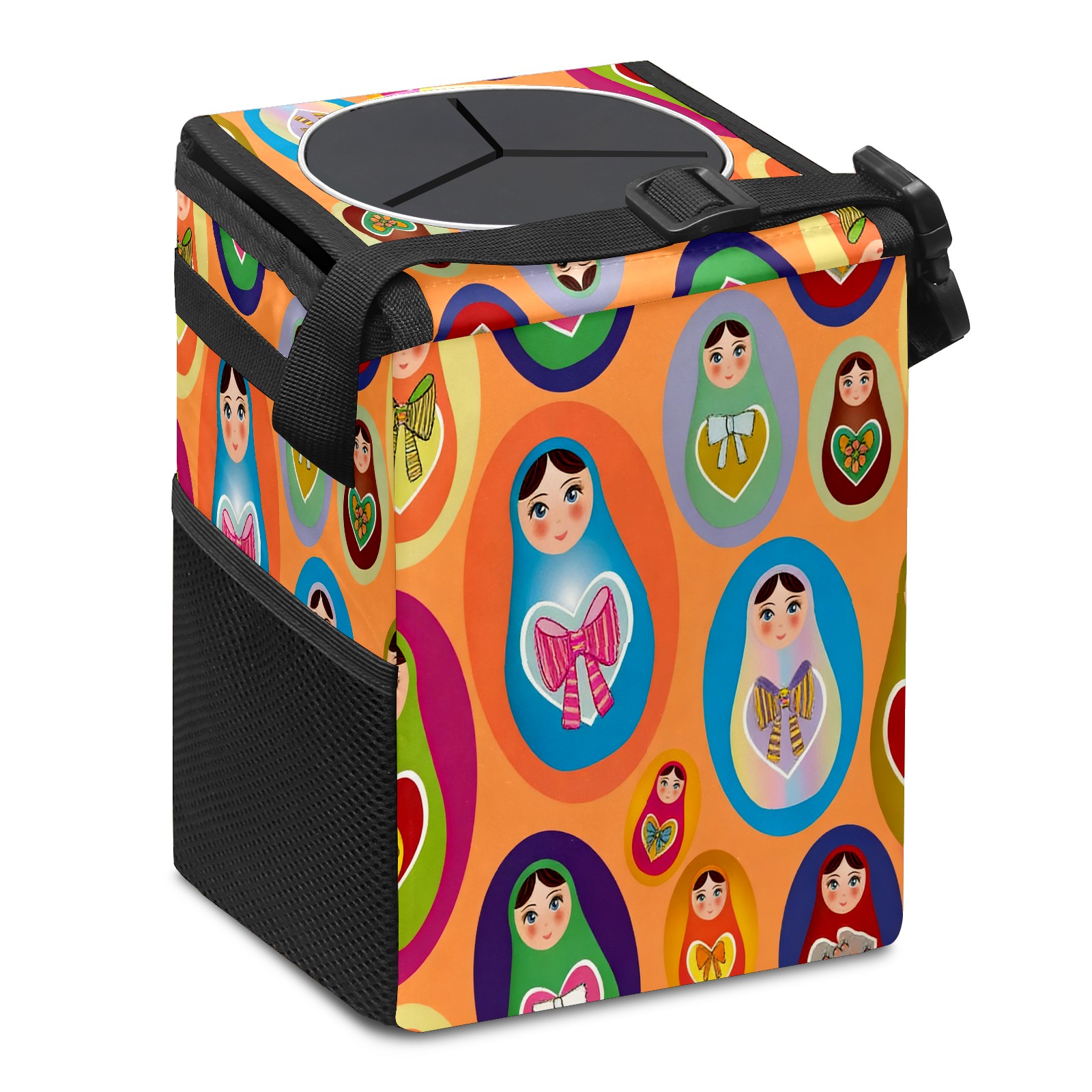 Small Collapsible Car Trash Can with Lid, Hanging Garbage Bin with Storage Pockets, Vibrant Dolls Orange for Front/Back Seat, Car Interior Organizer Accessory