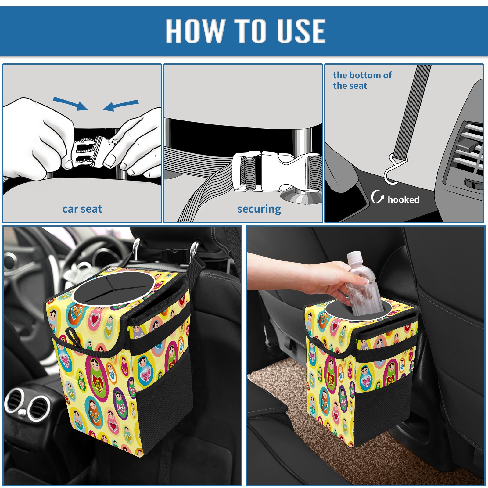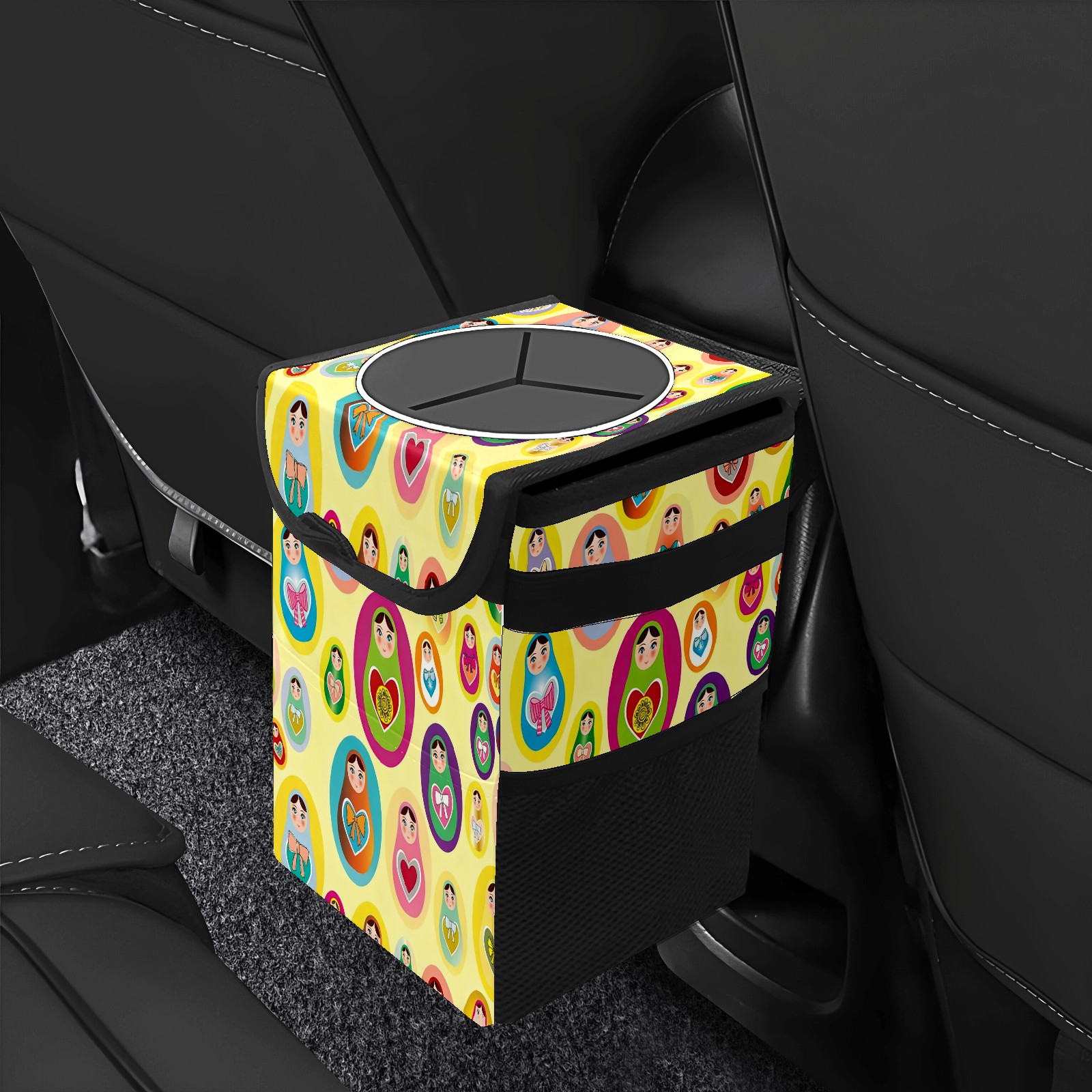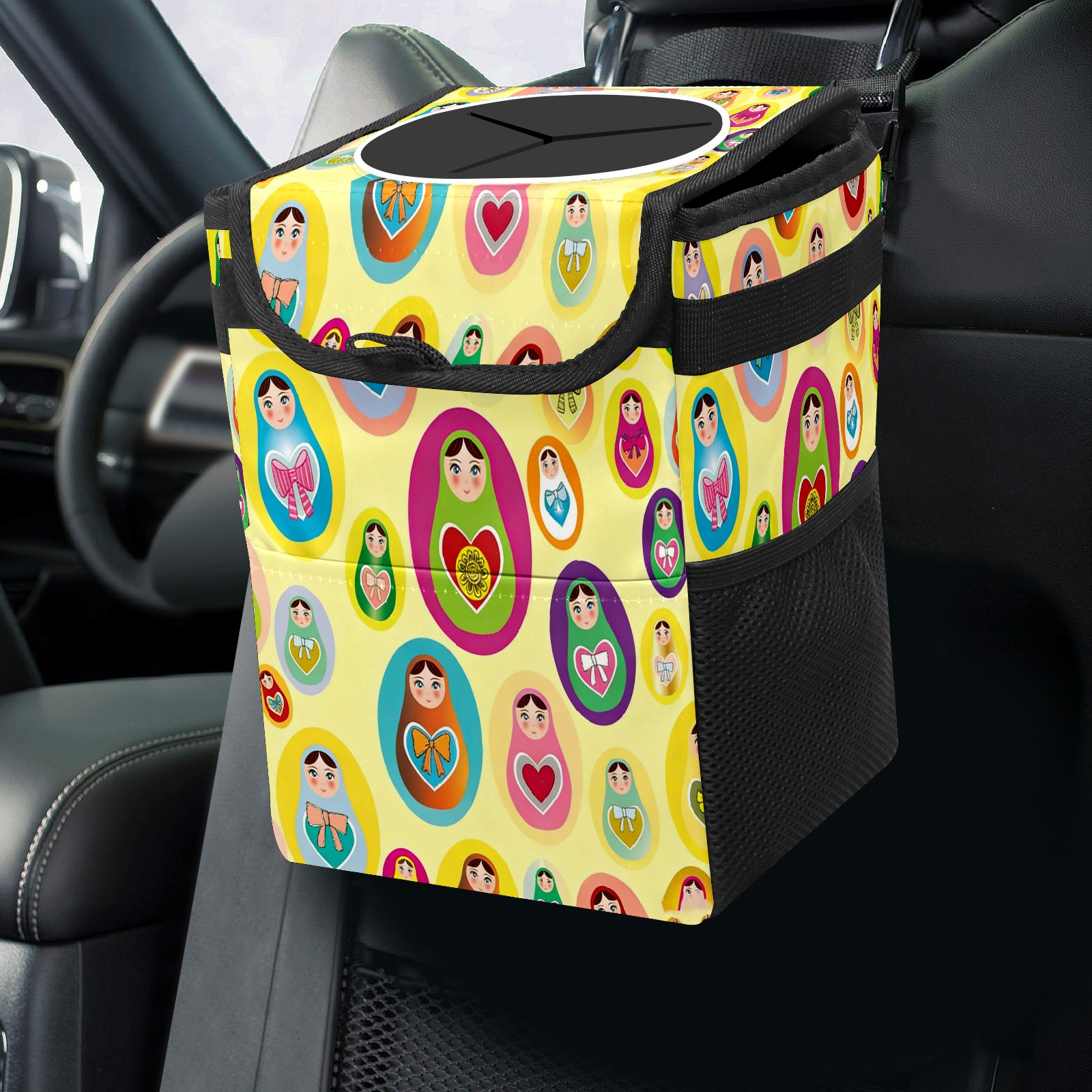 Small Collapsible Car Trash Can with Lid, Hanging Garbage Bin with Storage Pockets, Lively Dolls Yellow for Front/Back Seat, Car Interior Organizer Accessory