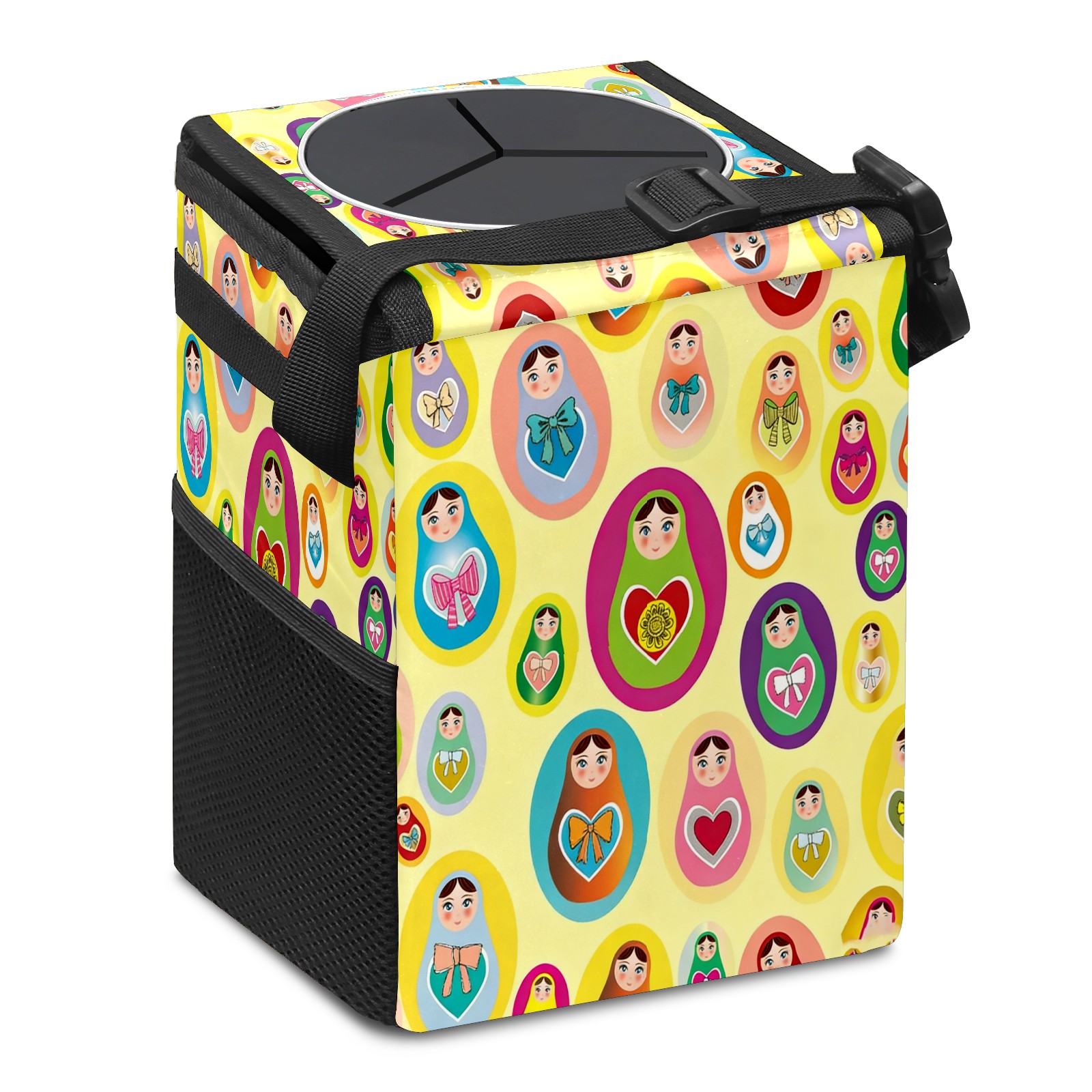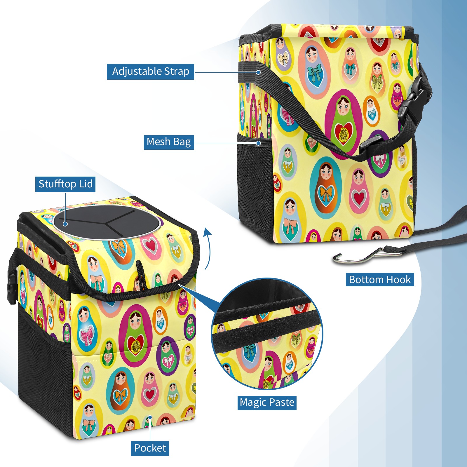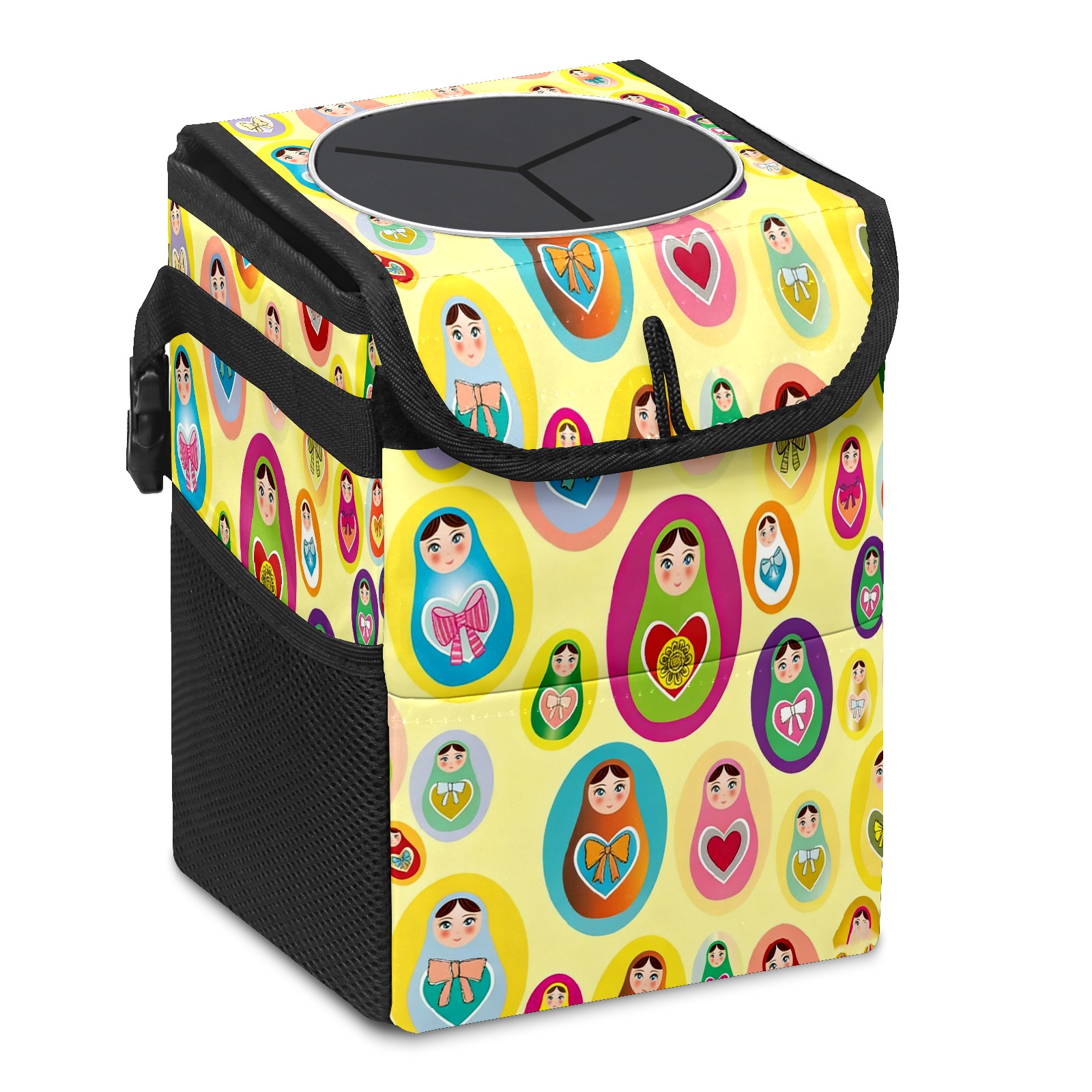 Small Collapsible Car Trash Can with Lid, Hanging Garbage Bin with Storage Pockets, Lively Dolls Yellow for Front/Back Seat, Car Interior Organizer Accessory