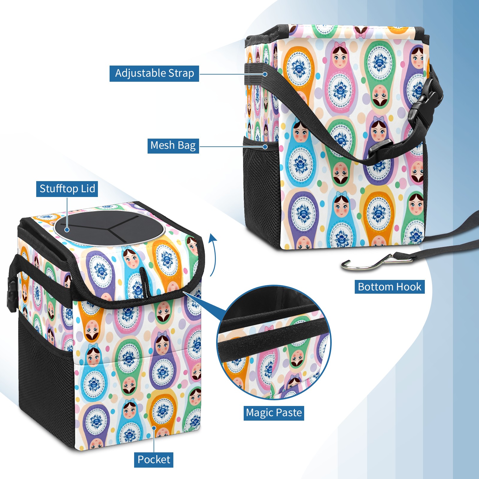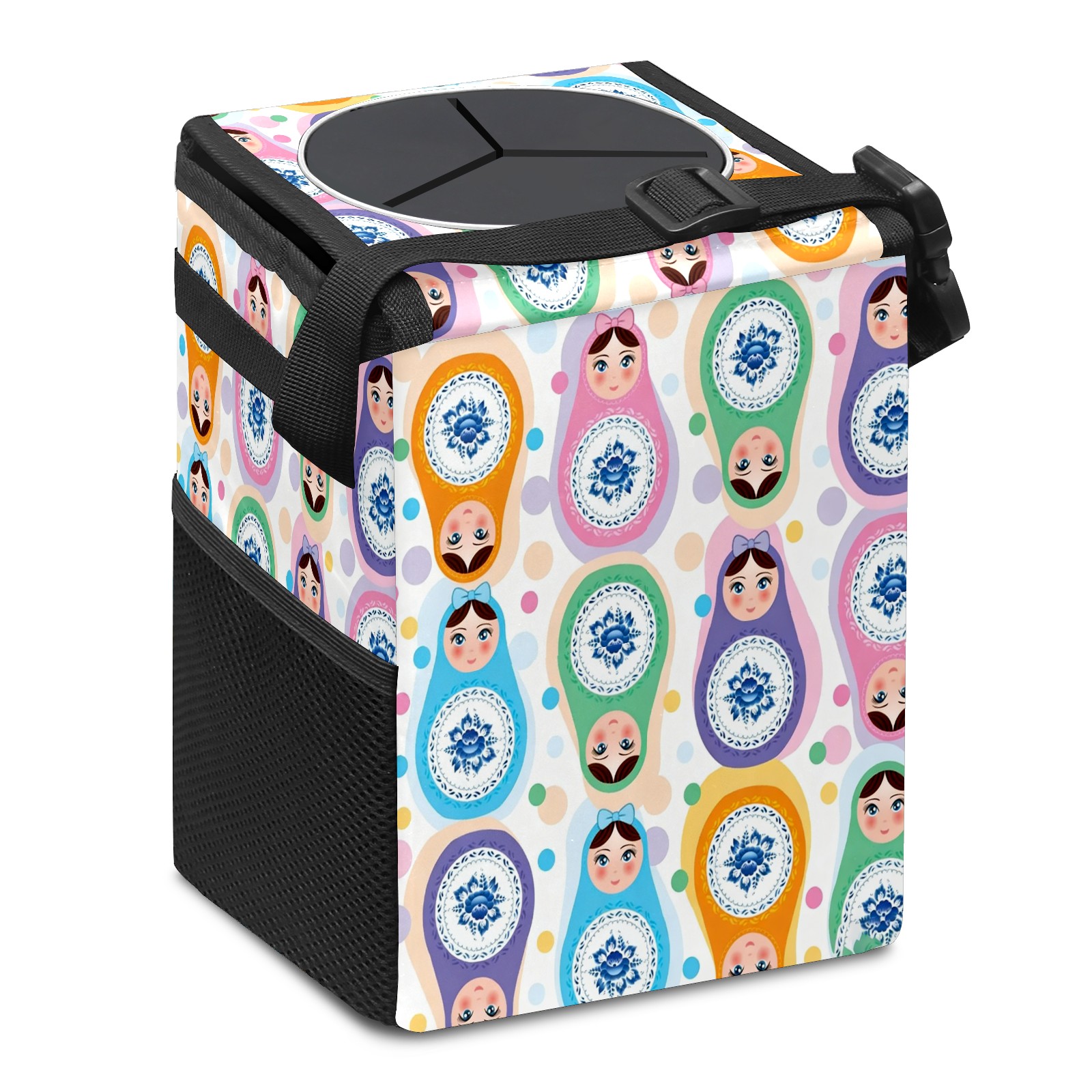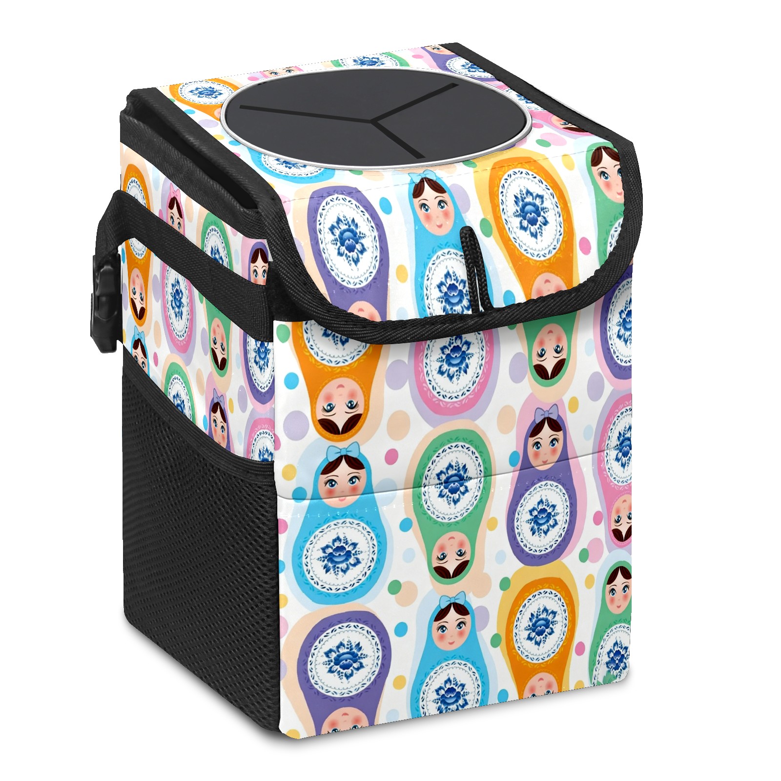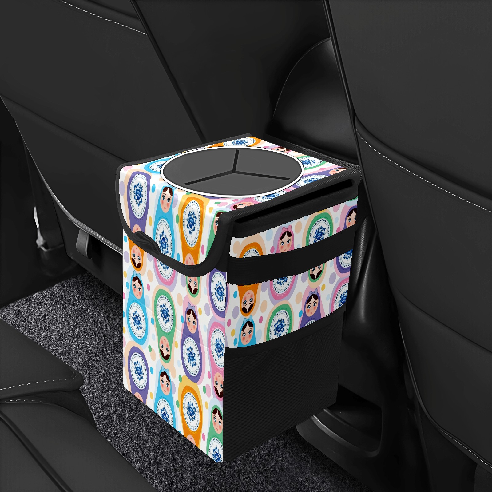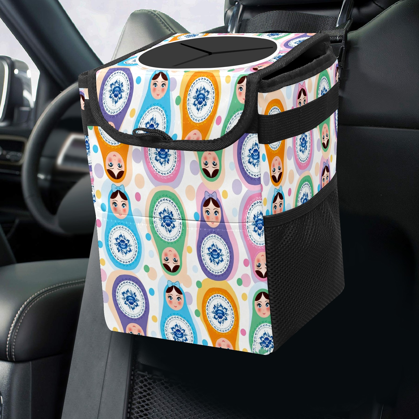 Small Collapsible Car Trash Can with Lid, Hanging Garbage Bin with Storage Pockets, Colorful Dolls White for Front/Back Seat, Car Interior Organizer Accessory