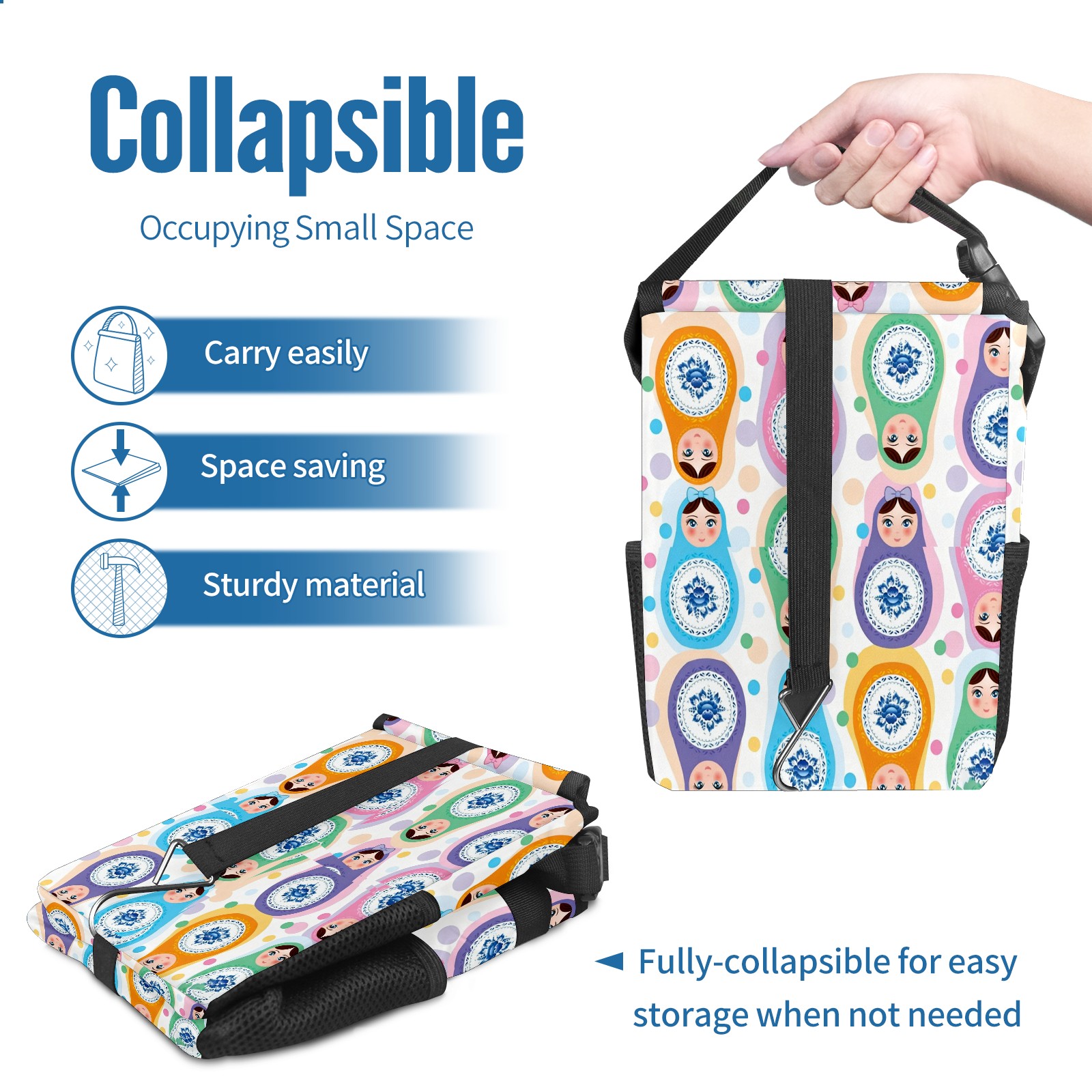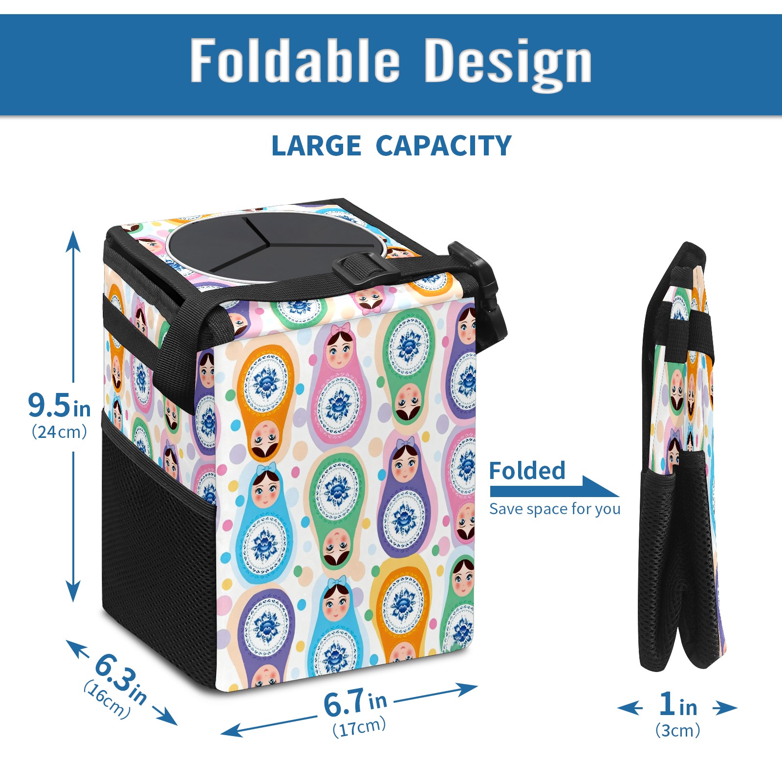 <p><strong> Keep Your Car Spotless!</strong></p><p>Our small, collapsible car trash can is the ultimate solution for a clutter-free ride. With a secure lid, multiple pockets, and stable hanging design, it's a must-have accessory.</p><p><strong>Key Features</strong></p><ul><li><strong>Odor Control:</strong> Rubber-sealed lid traps smells; works with standard trash bags.</li><li><strong>Extra Storage:</strong> Mesh pockets and front pouch keep essentials handy.</li><li><strong>Secure Fit:</strong> Strap and hooks ensure it stays in place on any surface.</li><li><strong>Space-Saving:</strong> Fold flat when not in use to maximize storage.</li><li><strong>Stylish &amp; Durable:</strong> Full-print twill fabric is built to last.</li></ul><p><strong>Specs</strong></p><p>Size: 24*17*16cm | Material: Twill Weave + Webbing | Care: Hand wash, avoid sun exposure.</p>