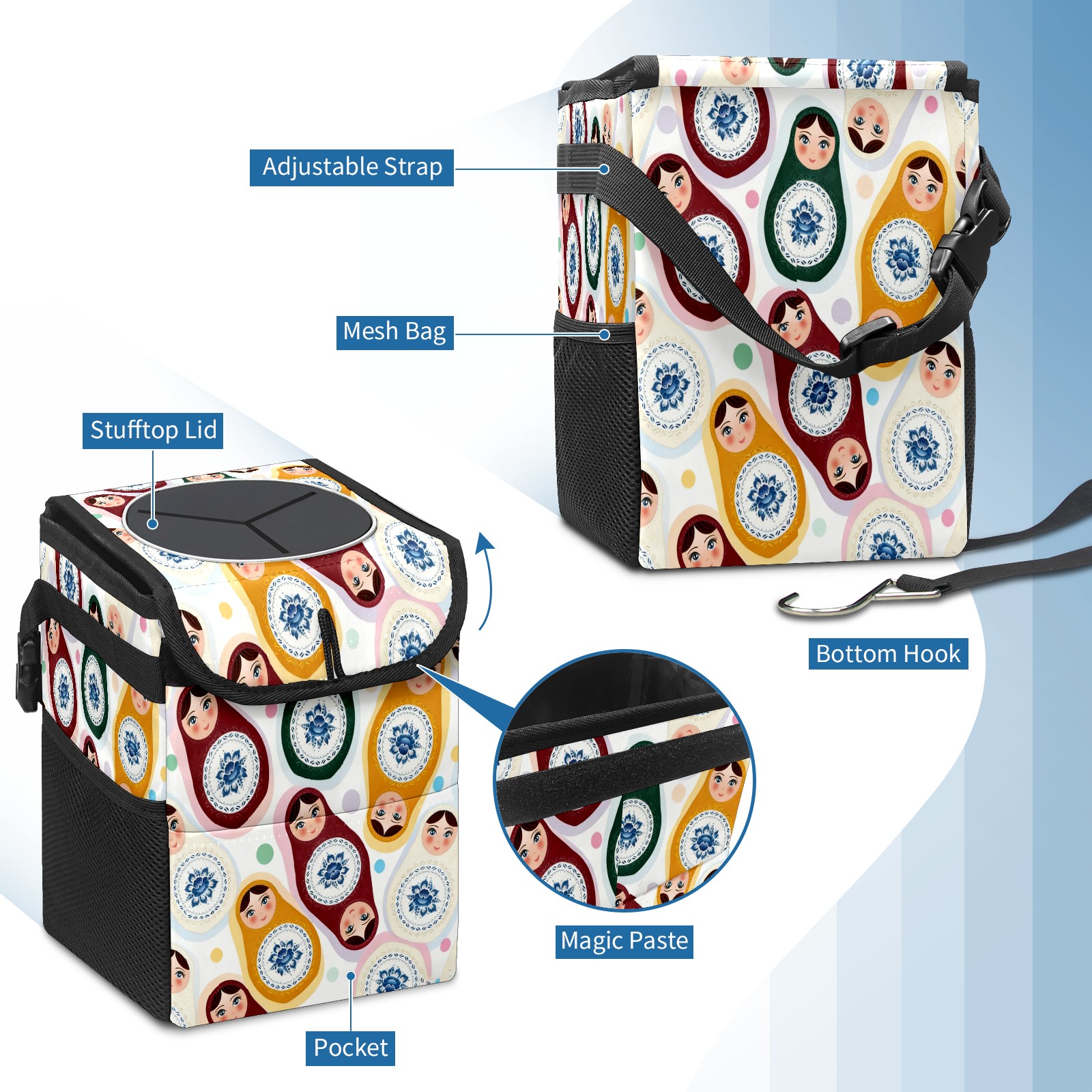 <p><strong> Keep Your Car Spotless!</strong></p><p>Our small, collapsible car trash can is the ultimate solution for a clutter-free ride. With a secure lid, multiple pockets, and stable hanging design, it's a must-have accessory.</p><p><strong>Key Features</strong></p><ul><li><strong>Odor Control:</strong> Rubber-sealed lid traps smells; works with standard trash bags.</li><li><strong>Extra Storage:</strong> Mesh pockets and front pouch keep essentials handy.</li><li><strong>Secure Fit:</strong> Strap and hooks ensure it stays in place on any surface.</li><li><strong>Space-Saving:</strong> Fold flat when not in use to maximize storage.</li><li><strong>Stylish &amp; Durable:</strong> Full-print twill fabric is built to last.</li></ul><p><strong>Specs</strong></p><p>Size: 24*17*16cm | Material: Twill Weave + Webbing | Care: Hand wash, avoid sun exposure.</p>