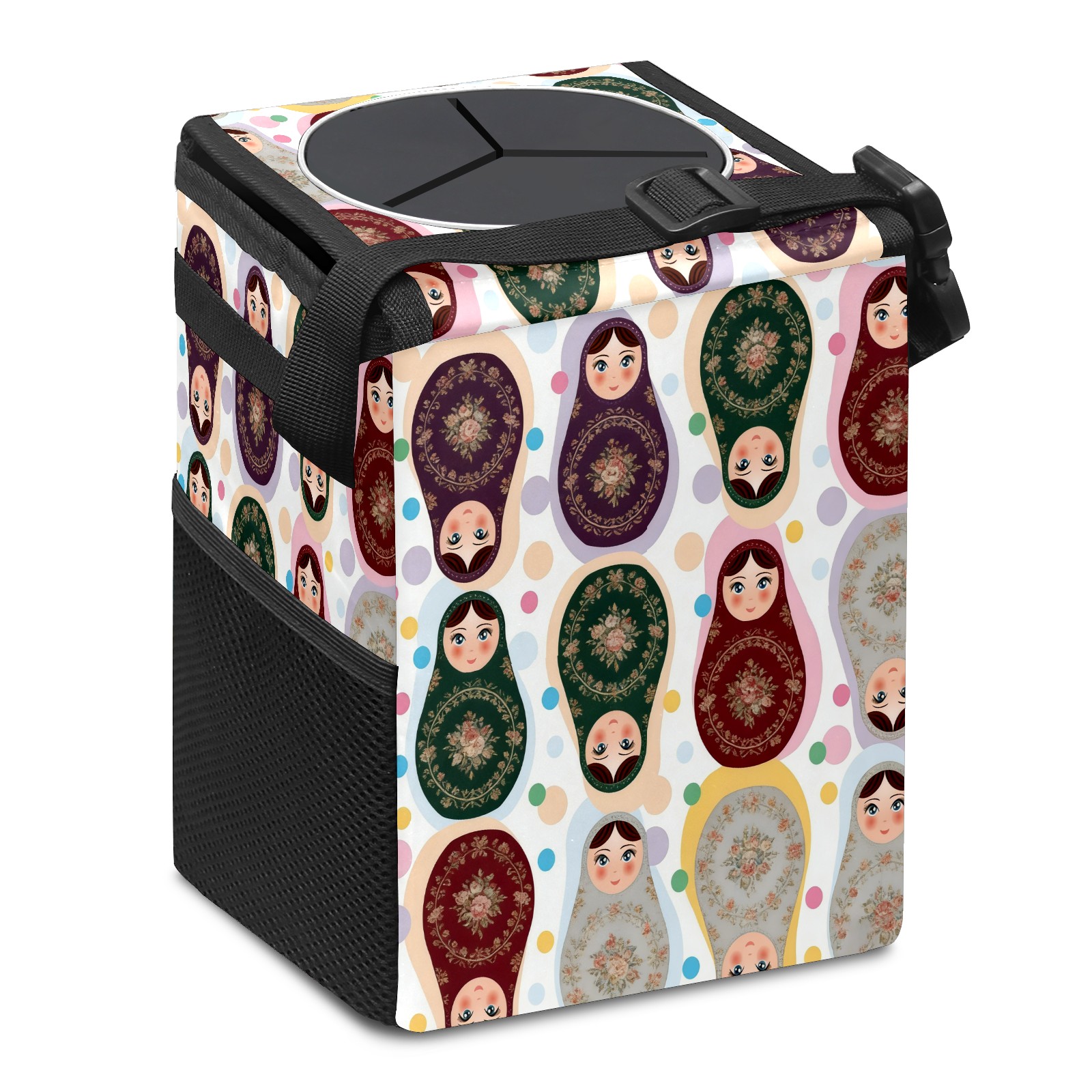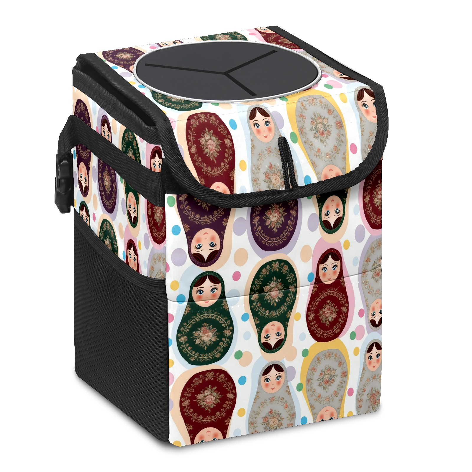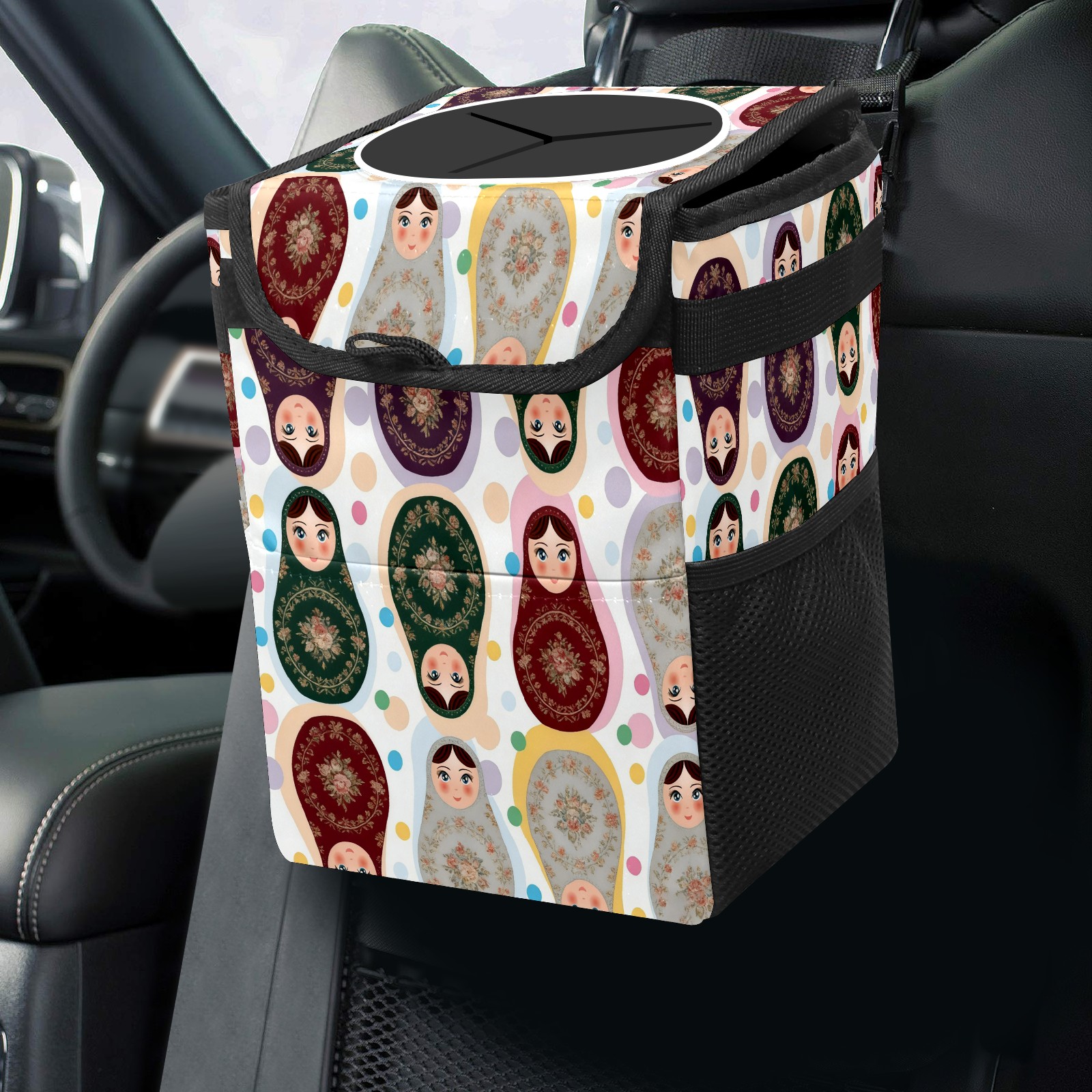 Small Collapsible Car Trash Can with Lid, Hanging Garbage Bin with Storage Pockets, Vintage Dolls Brown for Front/Back Seat, Car Interior Organizer Accessory