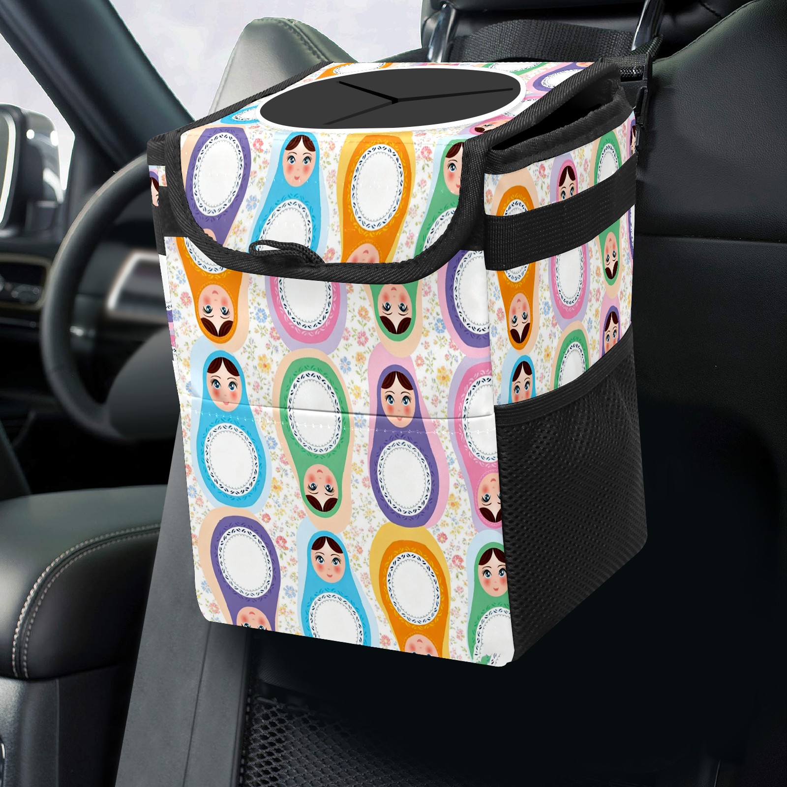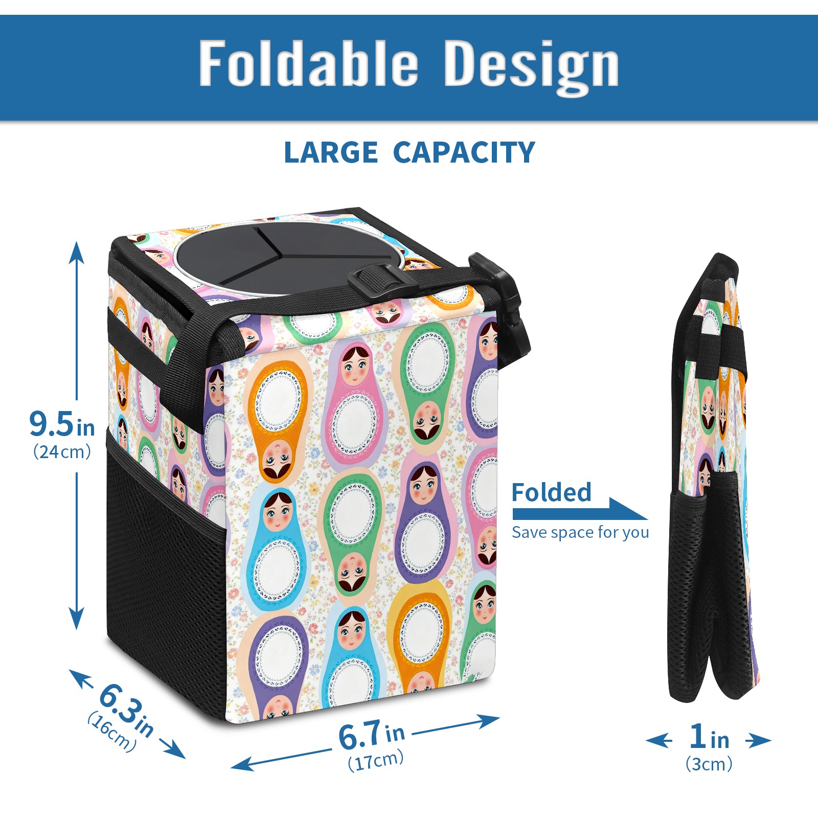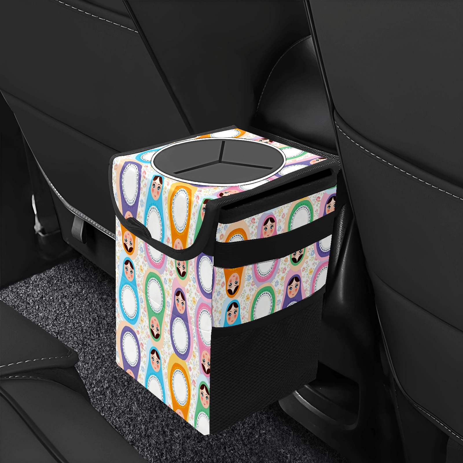 Small Collapsible Car Trash Can with Lid, Hanging Garbage Bin with Storage Pockets, Romantic Dolls Pink for Front/Back Seat, Car Interior Organizer Accessory