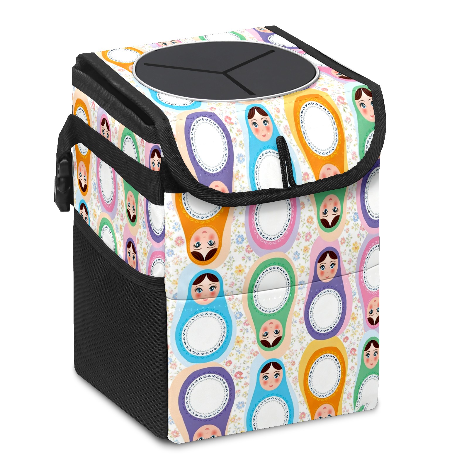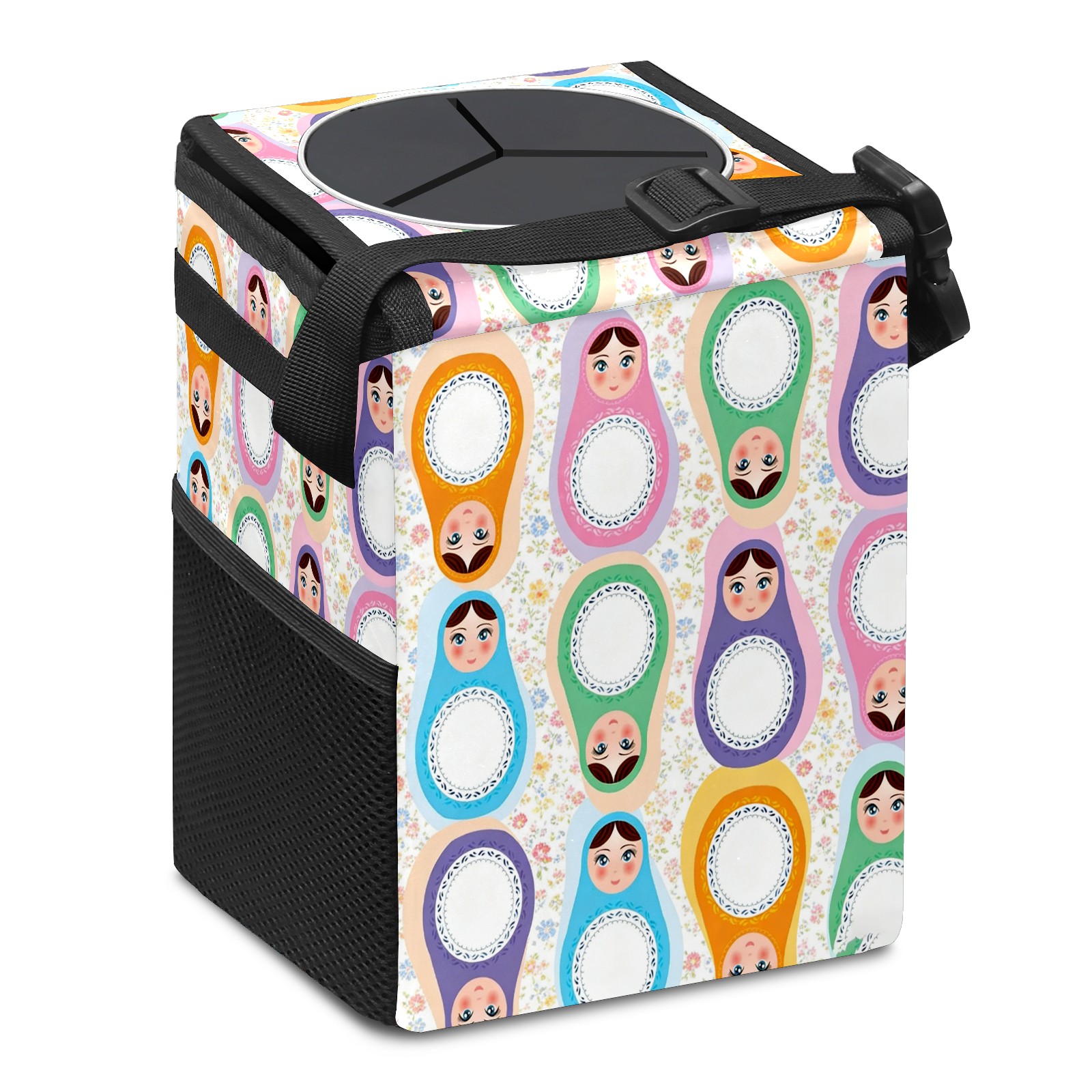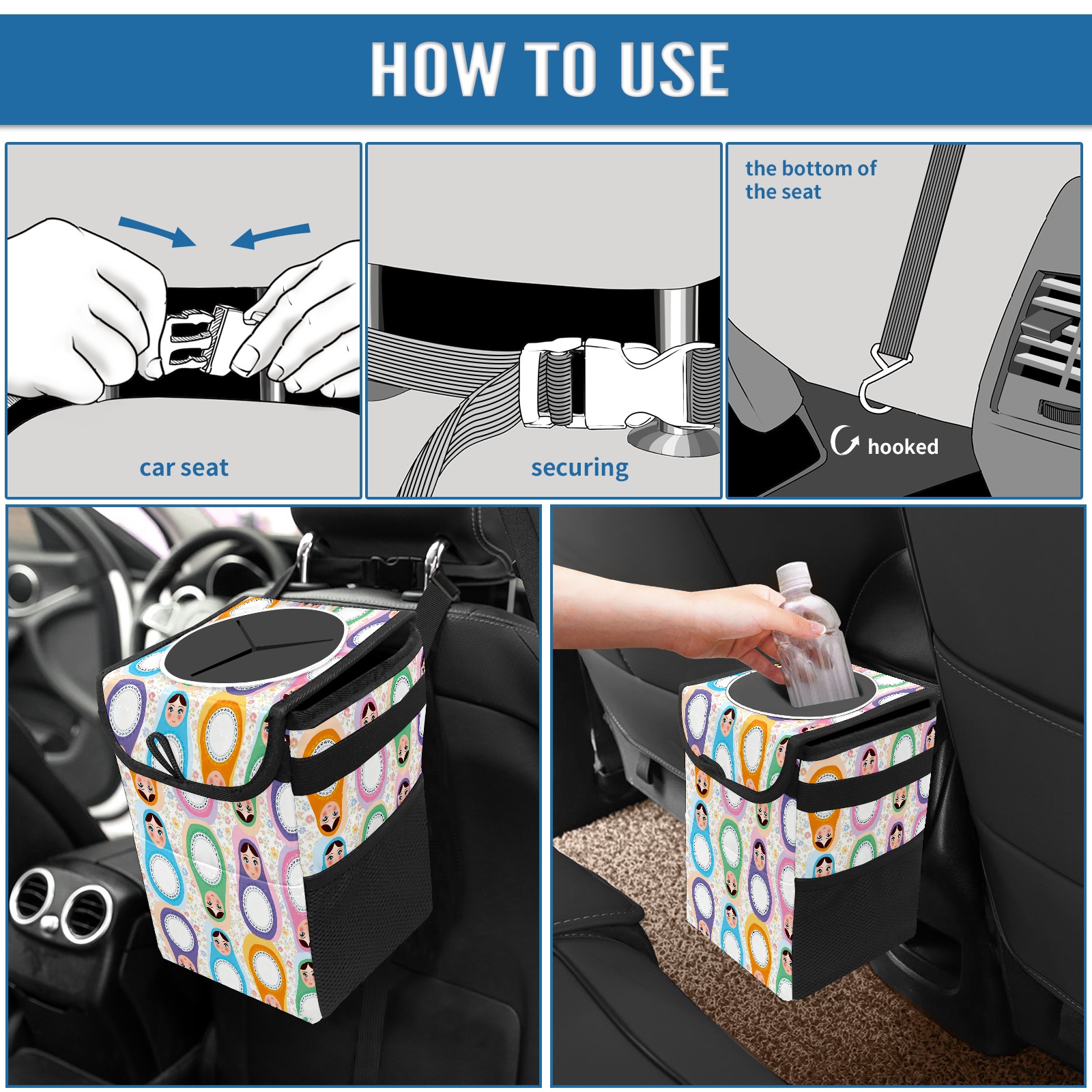 Small Collapsible Car Trash Can with Lid, Hanging Garbage Bin with Storage Pockets, Romantic Dolls Pink for Front/Back Seat, Car Interior Organizer Accessory