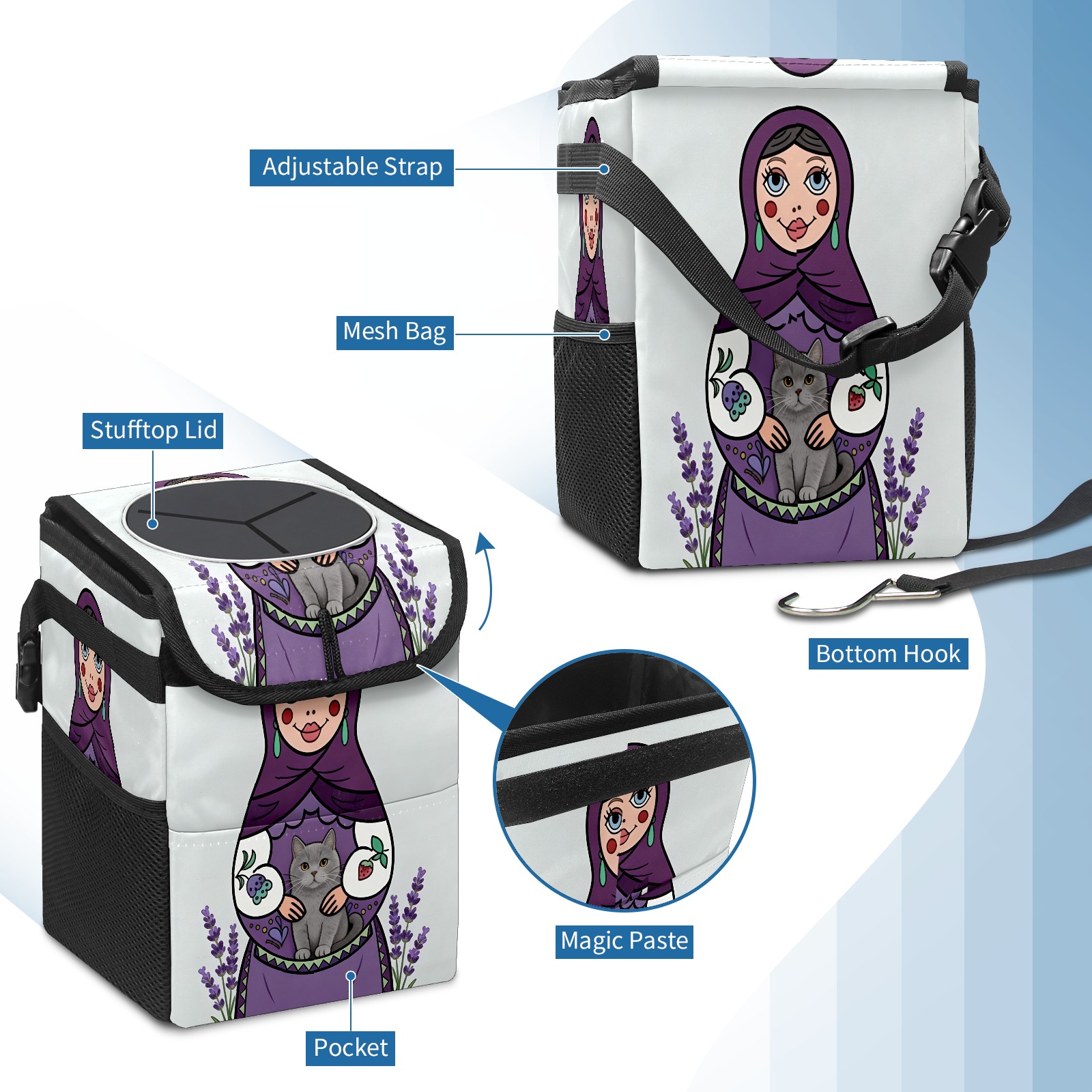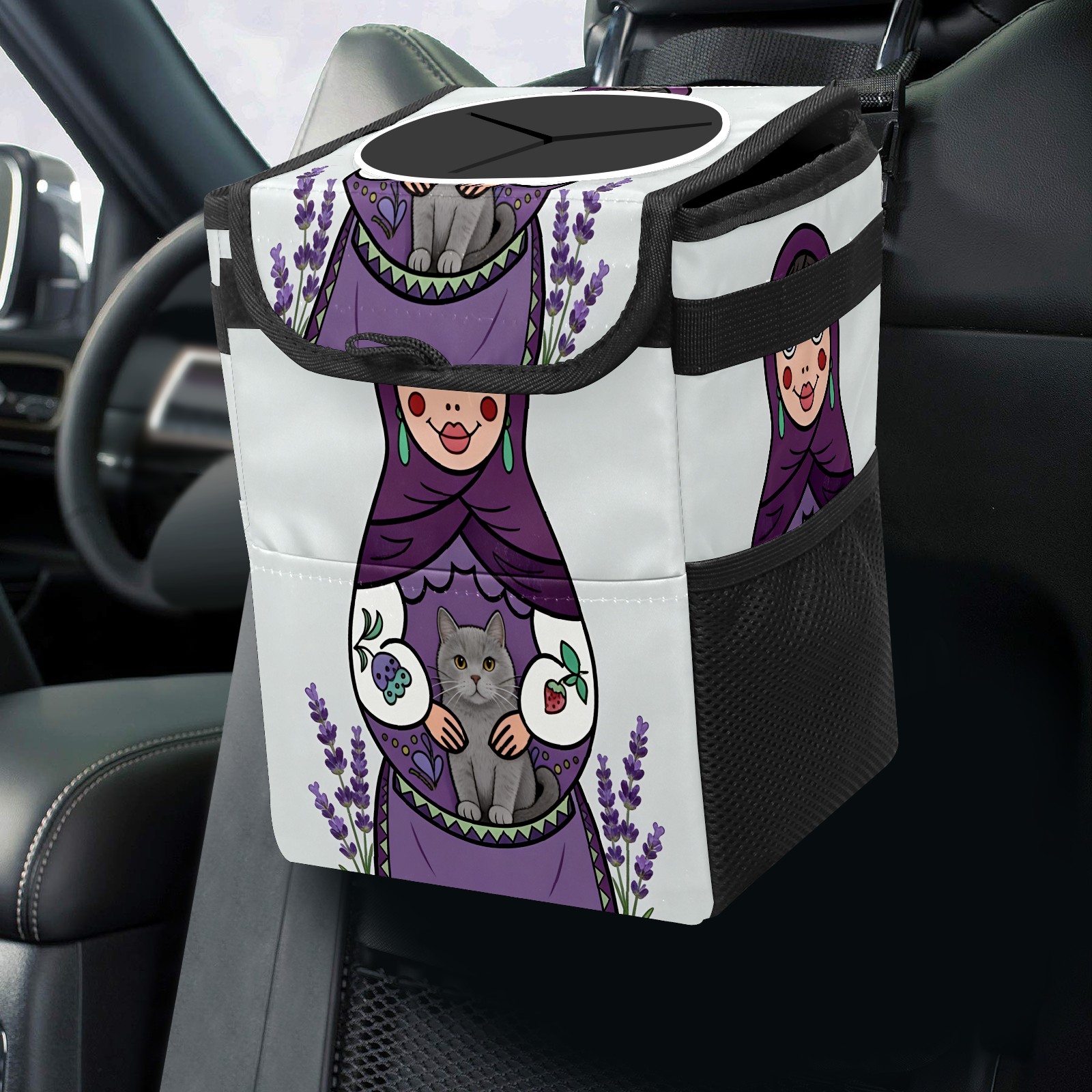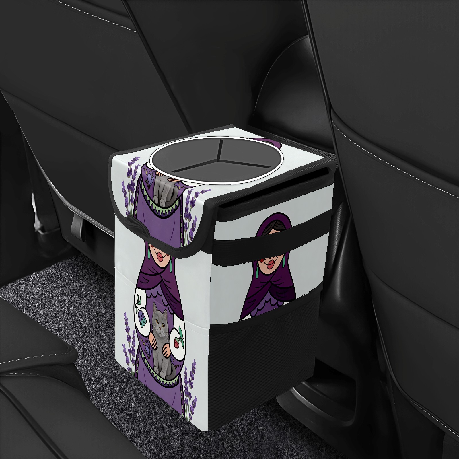 Small Collapsible Car Trash Can with Lid, Hanging Garbage Bin with Storage Pockets, Mysterious Dolls Purple for Front/Back Seat, Car Interior Organizer Accessory
