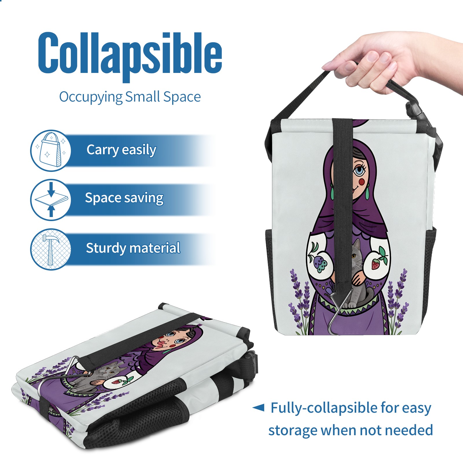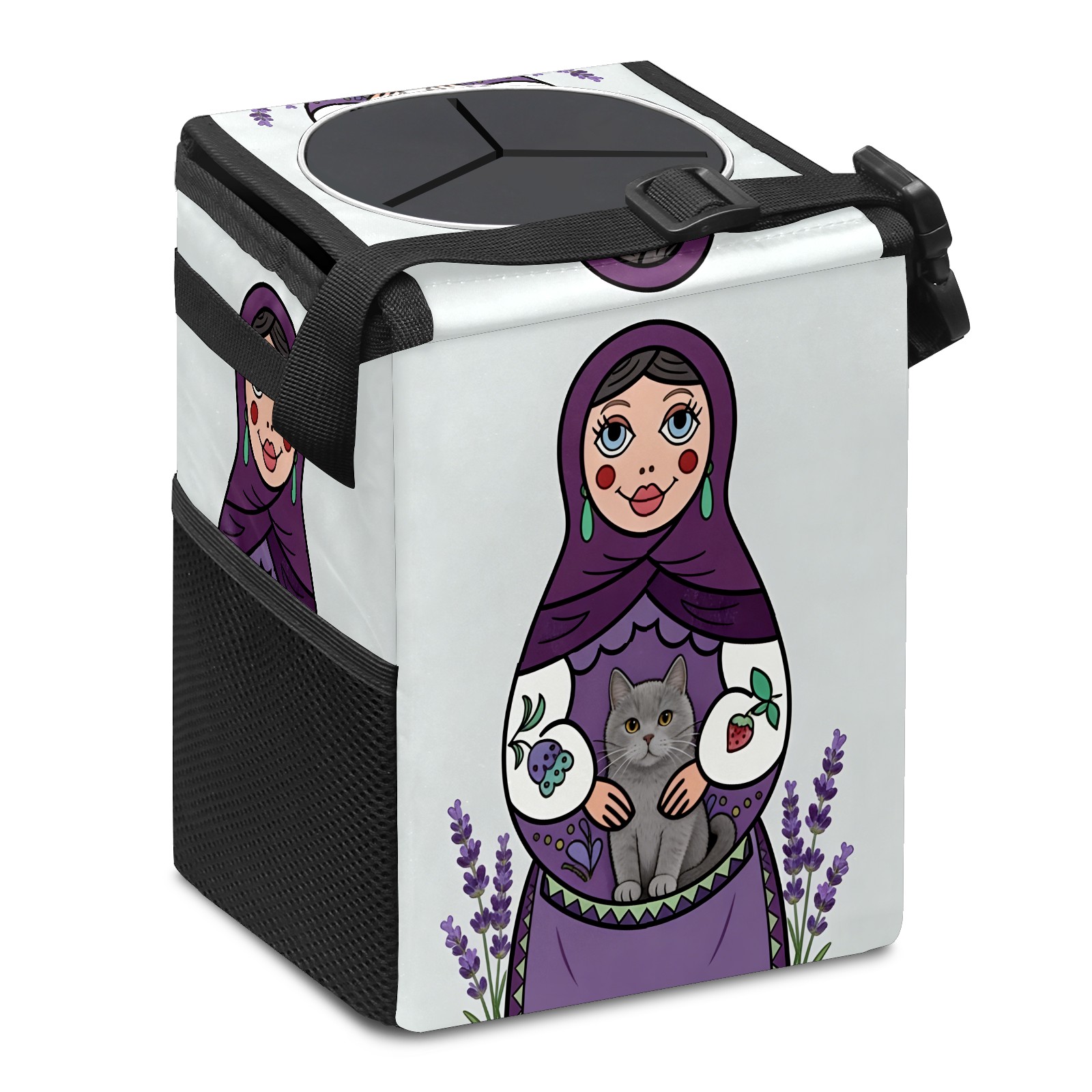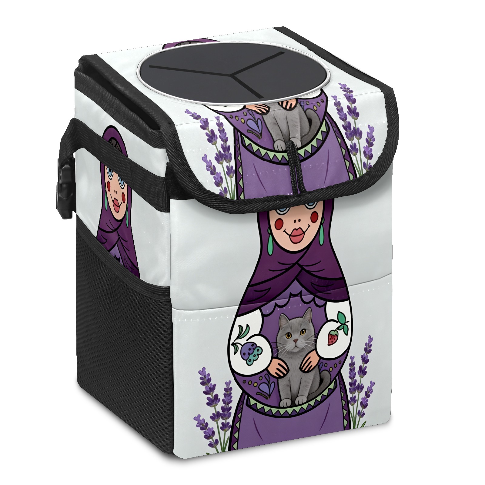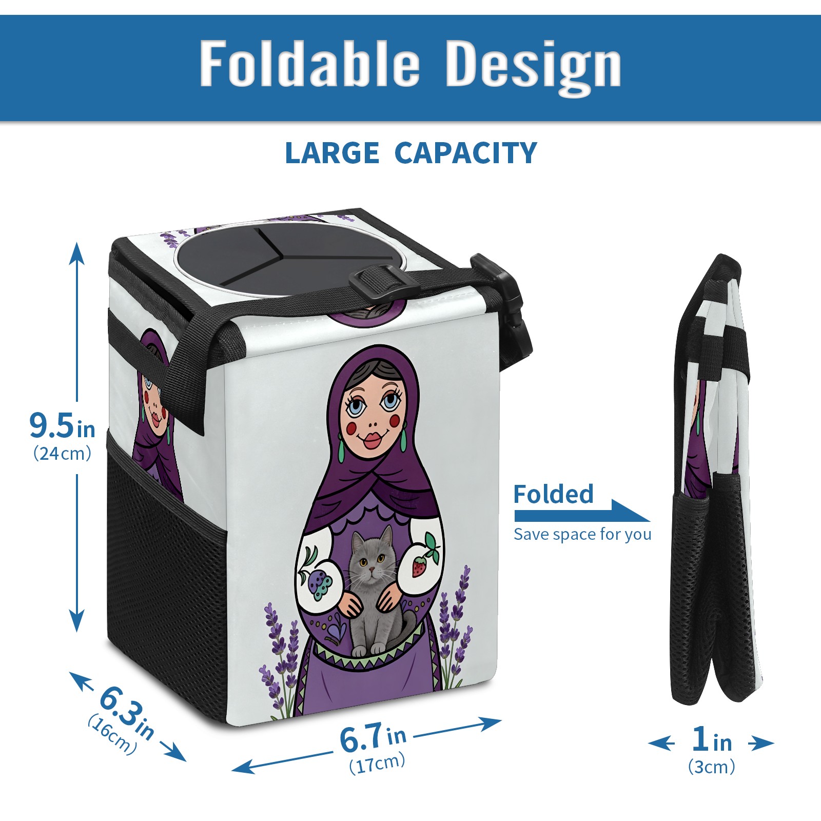 Small Collapsible Car Trash Can with Lid, Hanging Garbage Bin with Storage Pockets, Mysterious Dolls Purple for Front/Back Seat, Car Interior Organizer Accessory